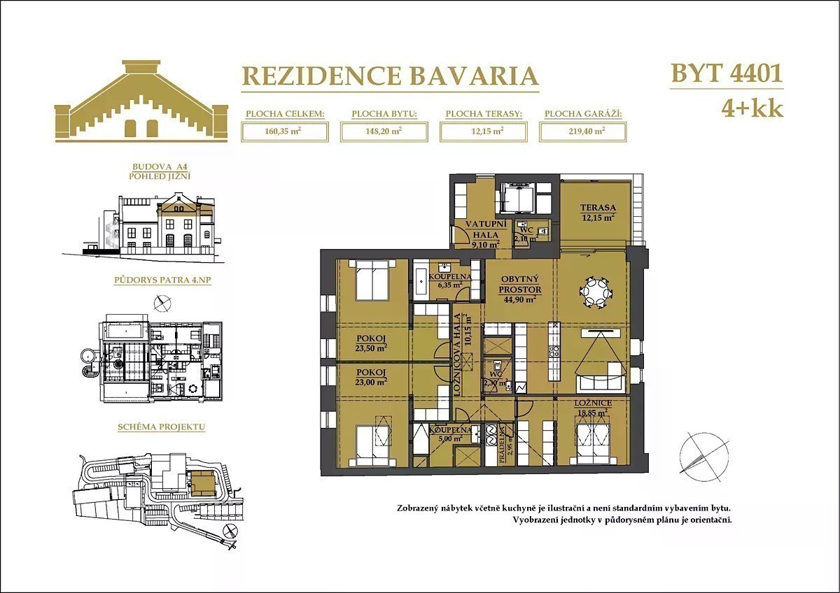 Dovolujeme si Vám nabídnouti výjimečný a prostorný byt o dispozici 4+kk s terasou v právě dokončovaném bytovém projektu Rezidence Bavaria (objekt A4 - pivovar). Byt je mimo jiné vybaven klimatizací a přípravou na krb a je umístěn ve 4.NP objektu s výtahem, ze kterého se vstupuje přímo do vstupní chodby bytu. Rezidence Bavaria se nachází ne severní hranici Brna a je určena zájemcům, kteří touží po výjimečném a nekonvenčním bydlení v osobité atmosféře a atraktivní lokalitě, která splňuje vysoké nároky na pohodlí, infrastrukturu a všude obklopující zeleň. Plocha bytu celkem: 170,3 m2 Plocha bytu: 158,7 m2 Balkon: 11,6 m2 Dispozice bytu: vstupní hala (9,1 m2), obývací pokoj s kuchyňským koutem (42,7 m2) a vstupem na terasu (11,6 m2), chodba (9,6 m2), pokoj (27,9 m2), pokoj (27,3 m2), pokoj (25,7 m2), koupelna (7,0 m2), koupelna (5,5 m2), WC (2,2 m2), WC (2,0 m2)