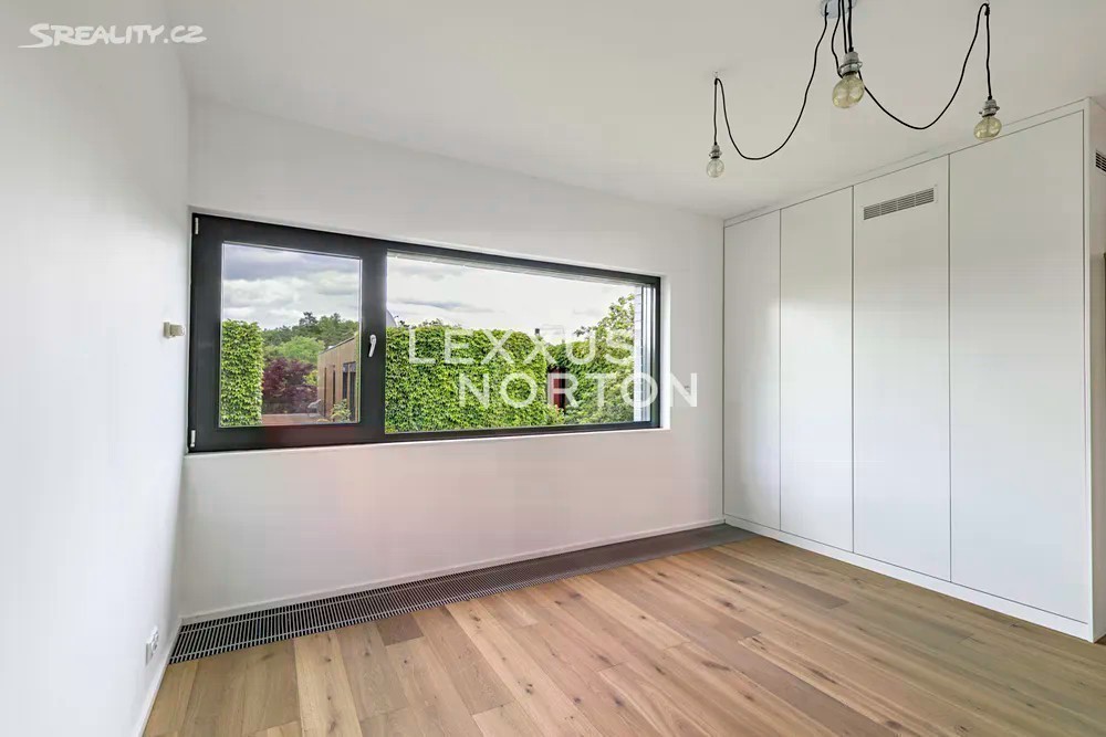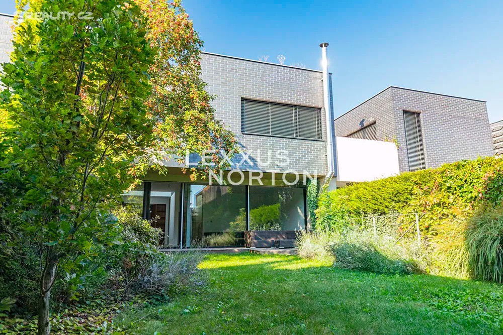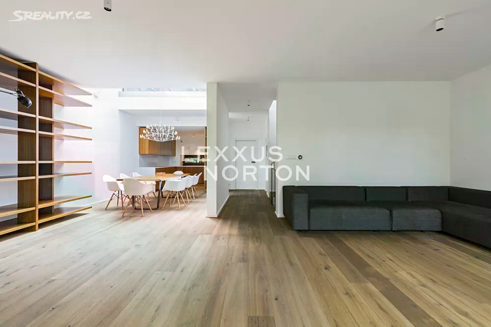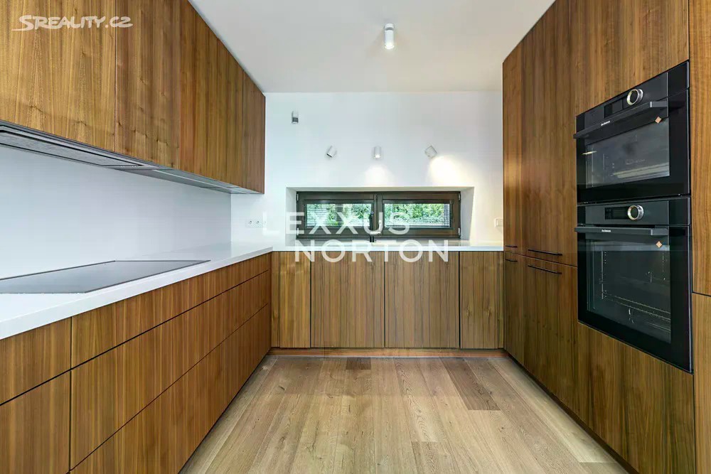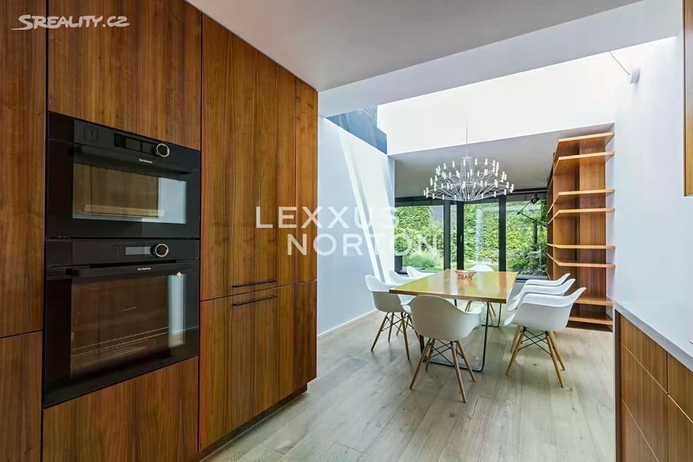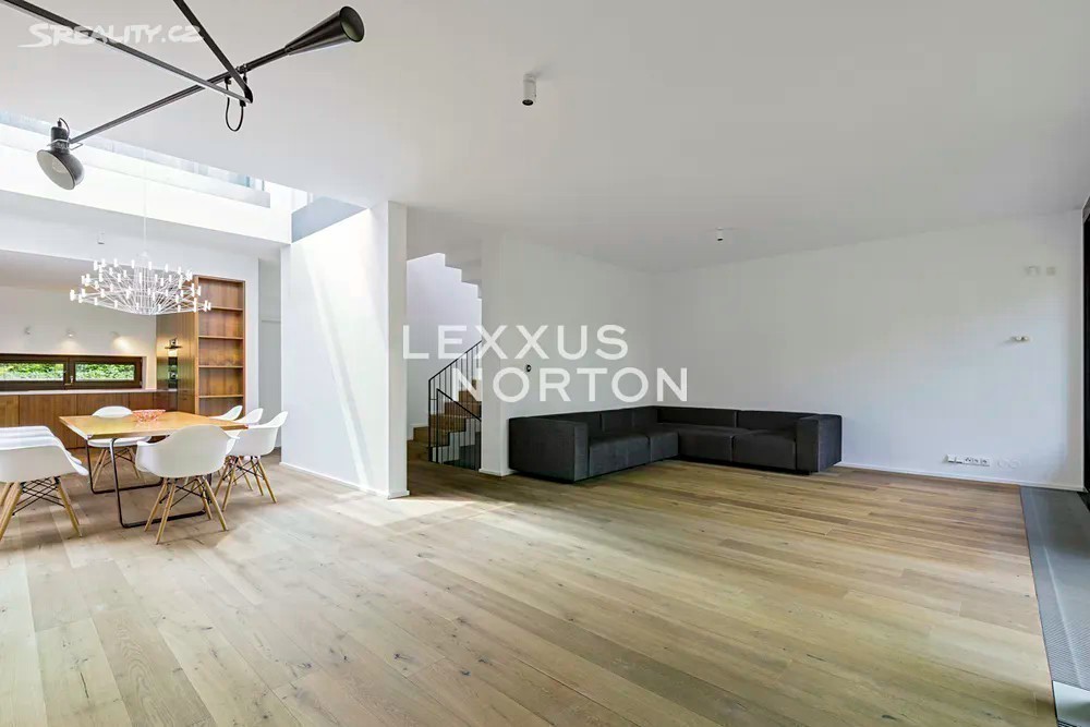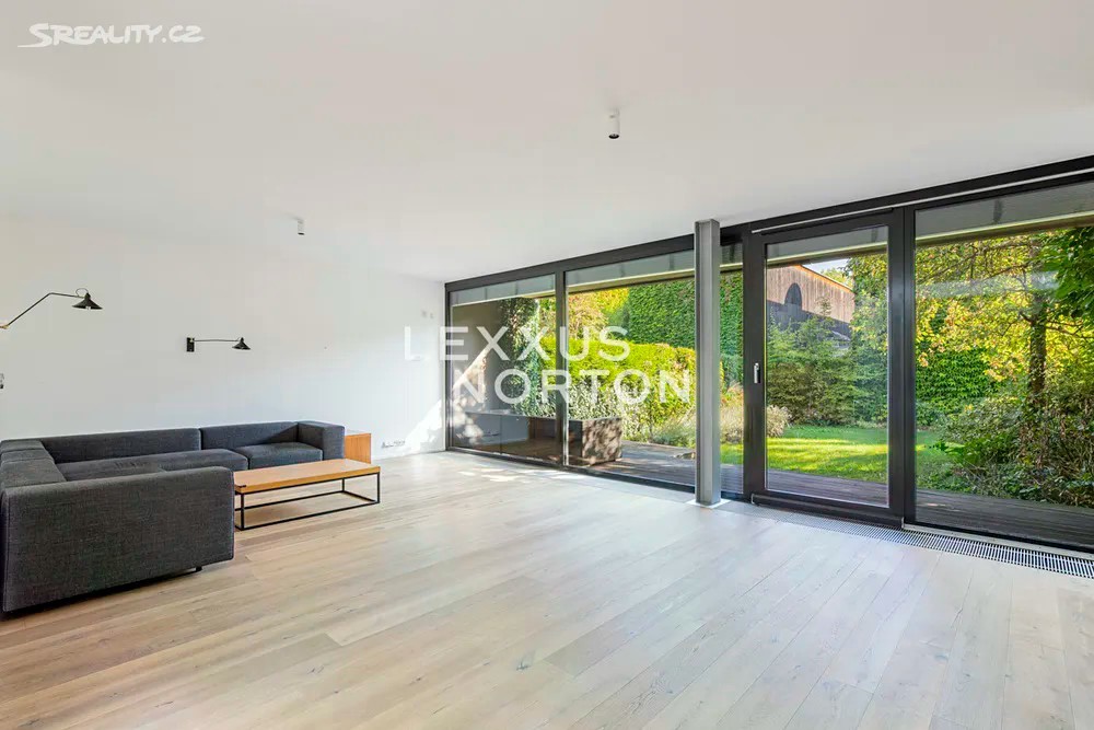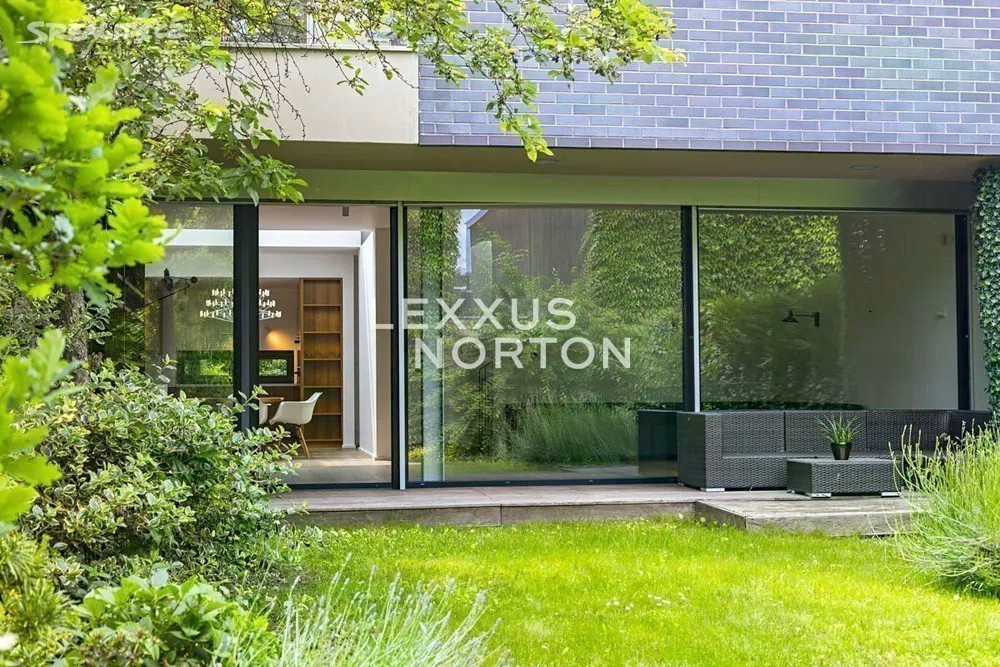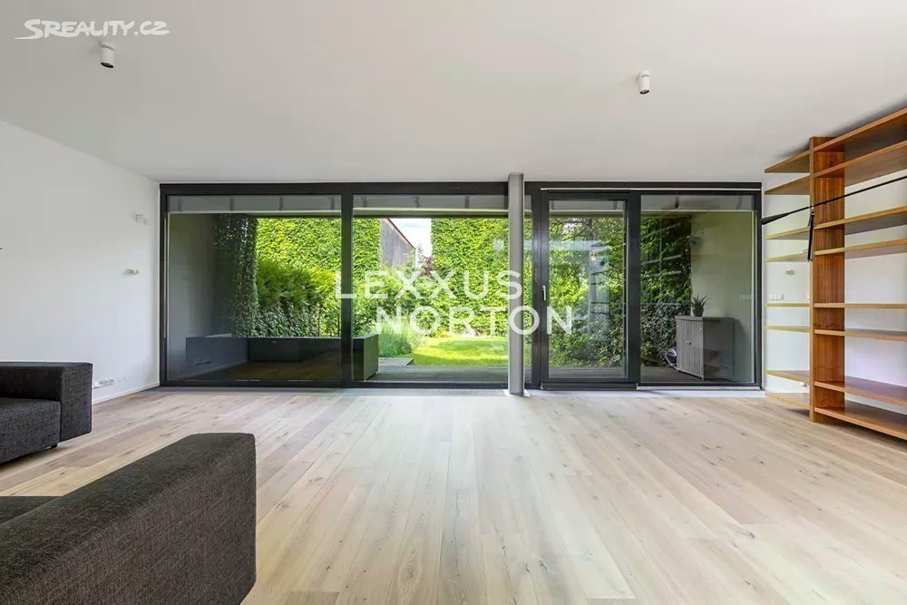 Prostorná moderní řadová vila v žádané luxusní rezidenci Na Krutci na Praze 6. Uzavřený areál s 24h recepcí a ostrahou kombinuje zástavbu řadových i soliterních domů, včetně několika viladomů s byty. Areál je umístěn v atraktivní lokalitě Prahy 6 Vokovic, která navazuje na park Divoká Šárka a zároveň se nachází v pěší vzdálenosti MHD a zastávky metra A. Přímo v areálu se nachází sportovní a relaxační centrum s tenisovými dvorci, golfovými simulátory, wellness klubem a fitness. Vila je řešena ve třech úrovních. Vstup v přízemí nabízí závětří, chodbu v zádveří a navazující šatnu a toaletu. Dále se otevírá rozlehlý obývací pokoj, jehož prostor je umocněn celou prosklenou stěnou a pohledovým propojením na obytnou zahradu s terasou. Plynule navazuje jídelní část s plně vybavenou kuchyní a průhledem do patra vily. V patře jsou umístěny tři ložnice, dvě koupelny a šatna. A je zde přístup na západně orientovanou terasu. Suterén je plně využit k obytným účelům. Jsou zde umístěny herna, fitness, malý kinosál s krbovými kamny, šatna, koupelna, sklad, prádelna a místnost pro plynový kotel. Je zde i zadní přístup na zahradu. K dispozici je příprava na saunu. Místnosti v suterénu mají okna umístěná do anglických dvorků. Ze závětří je pak vstup do garáže. Dům je vybaven dřevěnými podlahami, okna kovová nebo eurookna, střešní ventilátor, klimatizace, krb, vnitřní manuální nebo venkovní elektrické žaluzie, plynový kotel, zásobník, podlahové topení v koupelnách, alarm napojen na recepci.