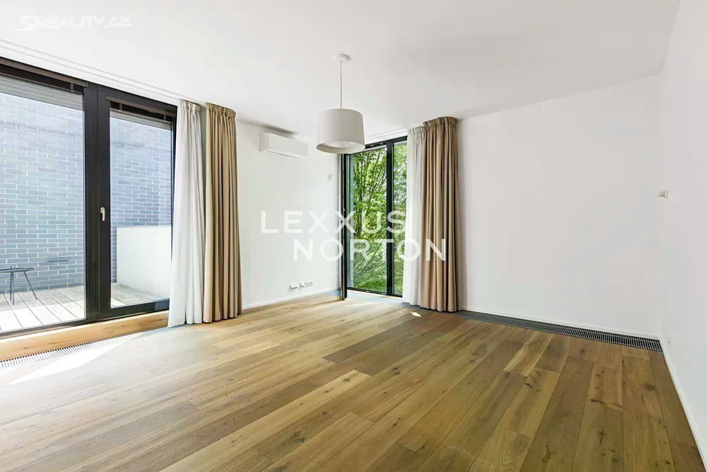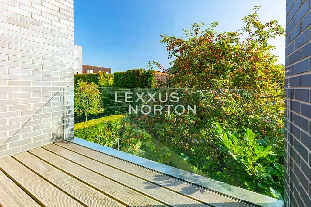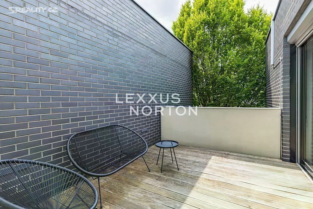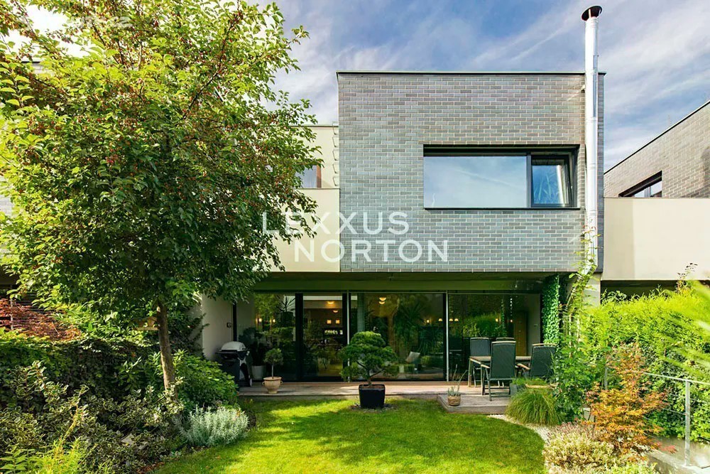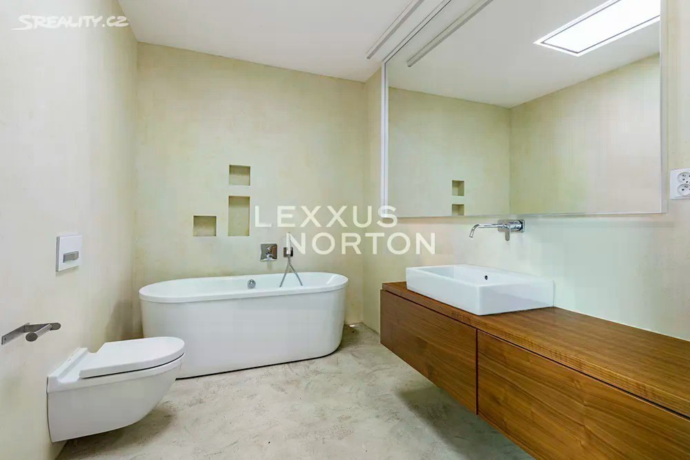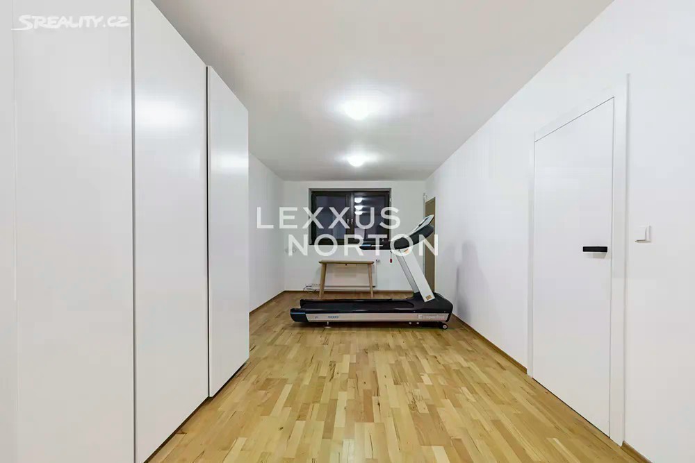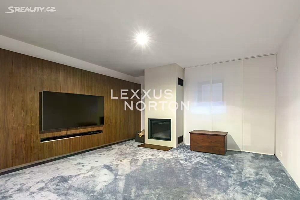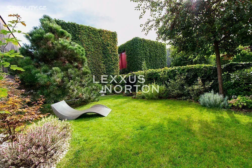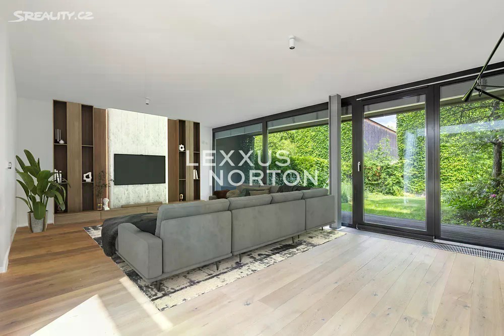 Prostorná moderní řadová vila v žádané luxusní rezidenci Na Krutci na Praze 6. Uzavřený areál s 24h recepcí a ostrahou kombinuje zástavbu řadových i soliterních domů, včetně několika viladomů s byty. Areál je umístěn v atraktivní lokalitě Prahy 6 Vokovic, která navazuje na park Divoká Šárka a zároveň se nachází v pěší vzdálenosti MHD a zastávky metra A. Přímo v areálu se nachází sportovní a relaxační centrum s tenisovými dvorci, golfovými simulátory, wellness klubem a fitness. Vila je řešena ve třech úrovních. Vstup v přízemí nabízí závětří, chodbu v zádveří a navazující šatnu a toaletu. Dále se otevírá rozlehlý obývací pokoj, jehož prostor je umocněn celou prosklenou stěnou a pohledovým propojením na obytnou zahradu s terasou. Plynule navazuje jídelní část s plně vybavenou kuchyní a průhledem do patra vily. V patře jsou umístěny tři ložnice, dvě koupelny a šatna. A je zde přístup na západně orientovanou terasu. Suterén je plně využit k obytným účelům. Jsou zde umístěny herna, fitness, malý kinosál s krbovými kamny, šatna, koupelna, sklad, prádelna a místnost pro plynový kotel. Je zde i zadní přístup na zahradu. K dispozici je příprava na saunu. Místnosti v suterénu mají okna umístěná do anglických dvorků. Ze závětří je pak vstup do garáže. Dům je vybaven dřevěnými podlahami, okna kovová nebo eurookna, střešní ventilátor, klimatizace, krb, vnitřní manuální nebo venkovní elektrické žaluzie, plynový kotel, zásobník, podlahové topení v koupelnách, alarm napojen na recepci.