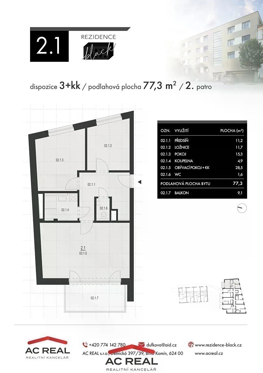 Moderní a kvalitně zařízené bydlení blízko centra Brna je ideální volbou pro rodinu. K prodeji je byt č. 2.1 o dispozici 3+kk v připravované novostavbě Rezidence Black na ulici Charbulova v Brně - Černovicích. Tento byt o celkové ploše 77,3 m2 se nachází ve 2. nadzemním podlaží a disponuje prostorným balkónem orientovaným na západ - do klidného vnitrobloku. Byt je navržen s ohledem na maximální využití prostoru a pohodlí obyvatel. Po vstupu se ocitáte v předsíni, která nabízí dostatek místa pro vestavnou skříň a botník, a také vytváří příjemný první dojem z celého interiéru. Z předsíně se otevírá cesta do dalších částí bytu: dětského pokoje, ložnice s dostatkem místa pro dvojlůžko a šatní skříně, stylové koupelny, samostatné toalety a prostorného obývacího pokoje propojeného s jídelnou a kuchyňským koutem. Z obývacího pokoje vyjdete na velký balkon o ploše 9,1 m2, který poskytuje dostatek místa pro práci na home office nebo posezení u rodinné večeře. Byt je vybaven ve velmi vysokém standardu: - vlastní rekuperační jednotka - předokenní žaluzie - podlahové vytápění ve všech místnostech - velkoformátové obklady a dlažba v koupelně - zařizovací předměty světových značek jako je Villeroy & Boch nebo Hans Grohe - SPC podlahy v obytných místnostech - hladké sádrové omítky v celém interiéru bytu - antracitové dveře o výšce 2100 mm Celý projekt je do detailu navržen tak, aby zajistil moderní, praktické a komfortní bydlení. Bytový dům je umístěn v klidné a bezpečné lokalitě. Brno - Černovice je městská část, která nabízí ideální kombinaci klidného bydlení a skvělé dostupnosti do centra města. V okolí naleznete veškerou občanskou vybavenost - školy, školky, zdravotnická zařízení, obchody, kavárny i restaurace. Místní parky a zelené plochy poskytují dostatek prostoru pro relaxaci a volnočasové aktivity. Výborná dopravní dostupnost je zajištěna jak autem, tak městskou hromadnou dopravou. Vlaková a autobusová nádraží jsou v dosahu, stejně jako hlavní silniční tahy, což znamená rychlé spojení s centrem města i okolními oblastmi. Černovice jsou tak ideálním místem pro pohodlný a praktický život. Součástí domu jsou parkovací stání a sklepní kóje. Financování koupi bytu: 10 % po podpisu smlouvy o smlouvě budoucí kupní 90 % po kolaudaci Termín kolaudace domu 9/2026. Rádi Vám celý projekt představíme osobně, neváhejte nás kontaktovat!