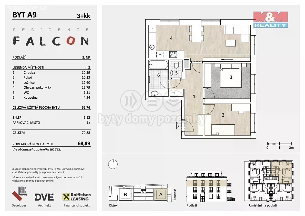 Nově spouštíme prodej bytových jednotek v budově A projektu Residence Falcon, který vzniká v klidné části Mělníka - ul. Sokolská. Lokalita nabízí výbornou dostupnost do Prahy (30 minut od Letňan, spojení PID), kompletní občanskou vybavenost v místě a základní školu doslova za rohem. Klidné prostředí bez dopravní zátěže doplňuje blízkost přírody i možností pro sport a volný čas. Byt se nachází ve 2. nadzemním podlaží a nabízí dispozici 3+kk o výměře 68,89 m². K jednotce náleží sklep o velikosti 2,16m² a parkovací stání. Klienti mají na výběr ze dvou vysokých standardů vybavení - Friendly a Gorgeous, zahrnujících velkoformátová okna, izolační trojskla a kvalitní materiály. Rezidenční areál nabídne oplocení, kamerový systém, kontrolovaný přístup a chráněné atrium pro klidnou relaxaci. Výstavba začne ve 3. čtvrtletí 2025, dokončení je plánováno na srpen 2027. Architektonický návrh zpracovalo renomované studio DVĚ. Pro více informací neváhejte kontaktovat makléře!