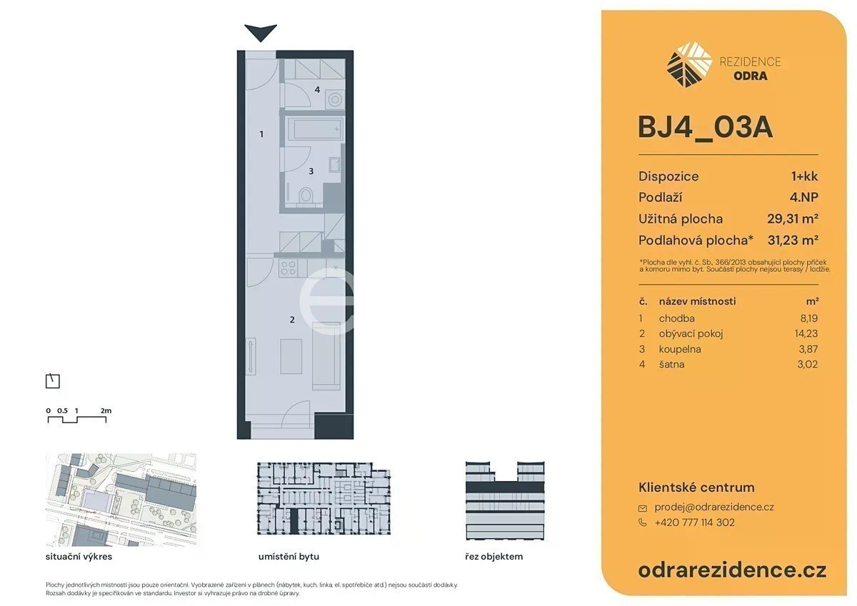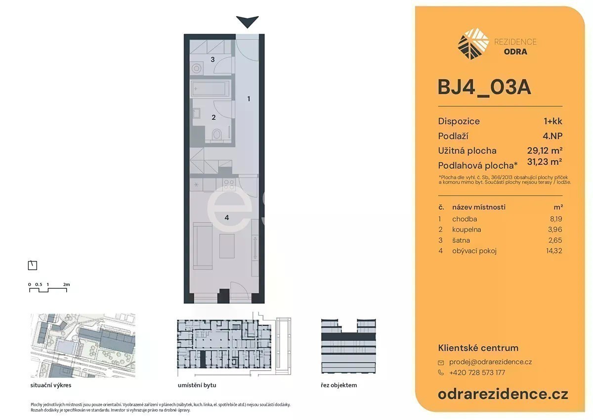 Byt 1+kk s lodžií v Rezidenci Odra - nový začátek v srdci Bohnic Hledáte nový domov v klidné a přitom skvěle dostupné lokalitě? Rezidence Odra je moderní projekt s duší i budoucností, který vzniká na místě bývalého obchodního centra v pražských Bohnicích. Nyní vám nabízíme konkrétní volnou jednotku 1+kk o ploše 31,23 m², nacházející se ve 4. nadzemním podlaží budovy ve fázi dokončení. Dispozice bytu: prostorná vstupní chodba - 8,19 m² obývací pokoj s kuchyňským koutem - 14,32 m² koupelna - 3,96 m² šatna - 2,65 m² Byt zaujme vysokými stropy, které umocňují vzdušnost interiéru, a velkoformátovými okny s jižní orientací, díky nimž je prostor krásně prosvětlený. Možnost parkování: Ke každé bytové jednotce lze dokoupit garážové stání v 1. nebo 2. podzemním podlaží za cenu 550 000 Kč. Technické standardy zahrnují: vinylové podlahy s lištami nebo rektifikovanou dlažbou plasto-hliníková okna s izolačními trojskly bezpečnostní vstupní dveře teplovodní podlahové vytápění elektrická příprava pro předokenní žaluzie Skvělá lokalita: Doprava: autobusová zastávka přímo u domu, stanice metra C - Kobylisy jen pár minut jízdy Občanská vybavenost: školy, školky, zdravotnická zařízení, pošta, OC Krakov - vše v pěší vzdálenosti Příroda: Ďáblický háj, přírodní park Troja, botanická a zoologická zahrada, aquapark Šutka O projektu: Rezidence Odra nabídne celkem 71 bytových jednotek o dispozicích od 1+kk po 4+kk a také komerční prostory v přízemí - např. prodejnu DM drogerie nebo obchod Action. Projekt splňuje požadavky vládního nařízení č. 366/2013 Sb. Kontaktujte nás Více informací naleznete na webu odrarezidence. Rádi vás přivítáme osobně - naše kanceláře najdete na adrese: Dock In Five, Boudníkova 2538/13, Praha 8 - Libeň Schůzky si, prosím, rezervujte předem telefonicky nebo e-mailem. Těšíme se na vás! Tým Esty