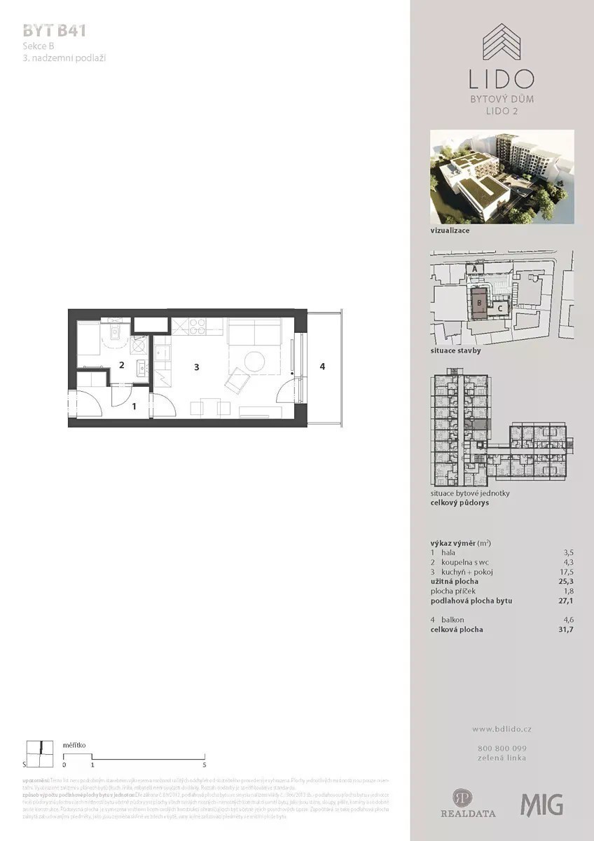 Ve výhradním zastoupení investora nabízíme k prodeji byt s dispozicí 1+kk s balkonem. Velmi pěkný byt vzniká v novém projektu, který navazuje na úspěšnou první etapu. Byt, který splní vysoké nároky na klidné a komfortní bydlení, představuje skvělou příležitost pro startovací bydlení nebo výhodnou investici. Bytový projekt vzniká v progresivní lokalitě s bohatou kulturní historií a výbornou dostupností do centra města. Jednou z mnoha předností projektu bude uzavřený vnitroblok plný zeleně, kde můžete trávit čas s dětmi nebo jen tak odpočívat. K bytu je možnost přikoupit parkovací stání. Symbiózou nadstandardního zateplení, kvalitních oken, použitých stavebních materiálů a moderních technologií vytápění se podařilo projekt BD LIDO realizovat v energetické třídě A, což znamená mimořádnou úspornost! Dispozice bytu: hala (4,1 m2), obývací pokoj s kuchyňským koutem (19,3 m2), koupelna s WC (4,1 m2), balkon (3,8 m2)