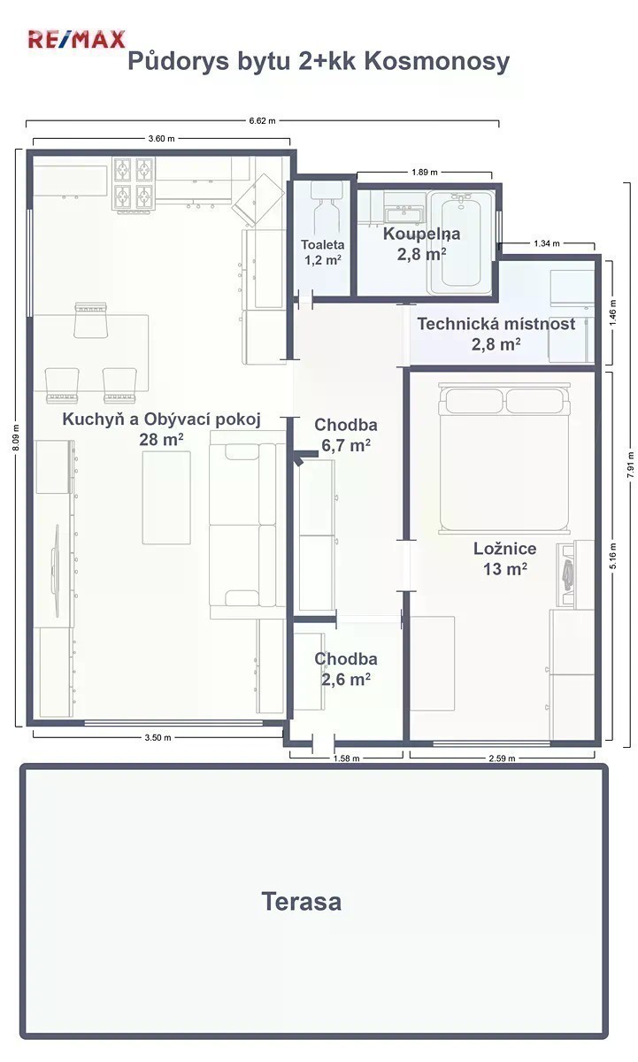 Nabízíme k prodeji velmi příjemný a světlý byt 2+kk o podlahové ploše 61,75 m² s velkorysou soukromou terasou 51,25 m². Byt je ve 2 - posledním podlaží domu v klidné části Kosmonos a má samostatný vstup po venkovním schodišti, což zaručuje soukromí. Dispozici otevírá prostorná předsíň, ze které se vstupuje do velkého obývacího pokoje s kuchyňskou linkou. Z předsíně je dále samostatný vstup do ložnice, koupelny a na toaletu. V bytě se dále nachází technická místnost, kam lze umístit pračku, sušičku a další věci. Před čtyřmi lety prošel byt kompletní rekonstrukcí, která zahrnovala novou elektroinstalaci, moderní kuchyňskou linku, zrekonstruovanou koupelnu i toaletu. Díky tomu nabízí komfortní a bezstarostné bydlení, ideální pro jednotlivce nebo pár hledající kvalitní a klidné zázemí s výbornou dostupností všeho potřebného. K bytu náleží velká terasa, která je soukromá a ideální pro odpočinek, grilování nebo relaxaci s výhledem do okolí. Součástí prodeje je také garážové stání, což je v této lokalitě významný benefit. Další výhodou je blízkost areálu Škoda Auto - vstupní brána 13 je přibližně 5 minut jízdy autem. Přímo naproti domu se nachází mateřská škola, do obchodů Lidl a BILLA dojdete asi za 8 minut pěšky a na autobusovou zastávku „Kosmonosy, Lidl“ je to zhruba 9 minut chůzí. Neváhejte mě kontaktovat pro více informací nebo sjednání nezávazné prohlídky. Z důvodu nedodání PENB uvádíme energetickou náročnost budovy skupinu G.
