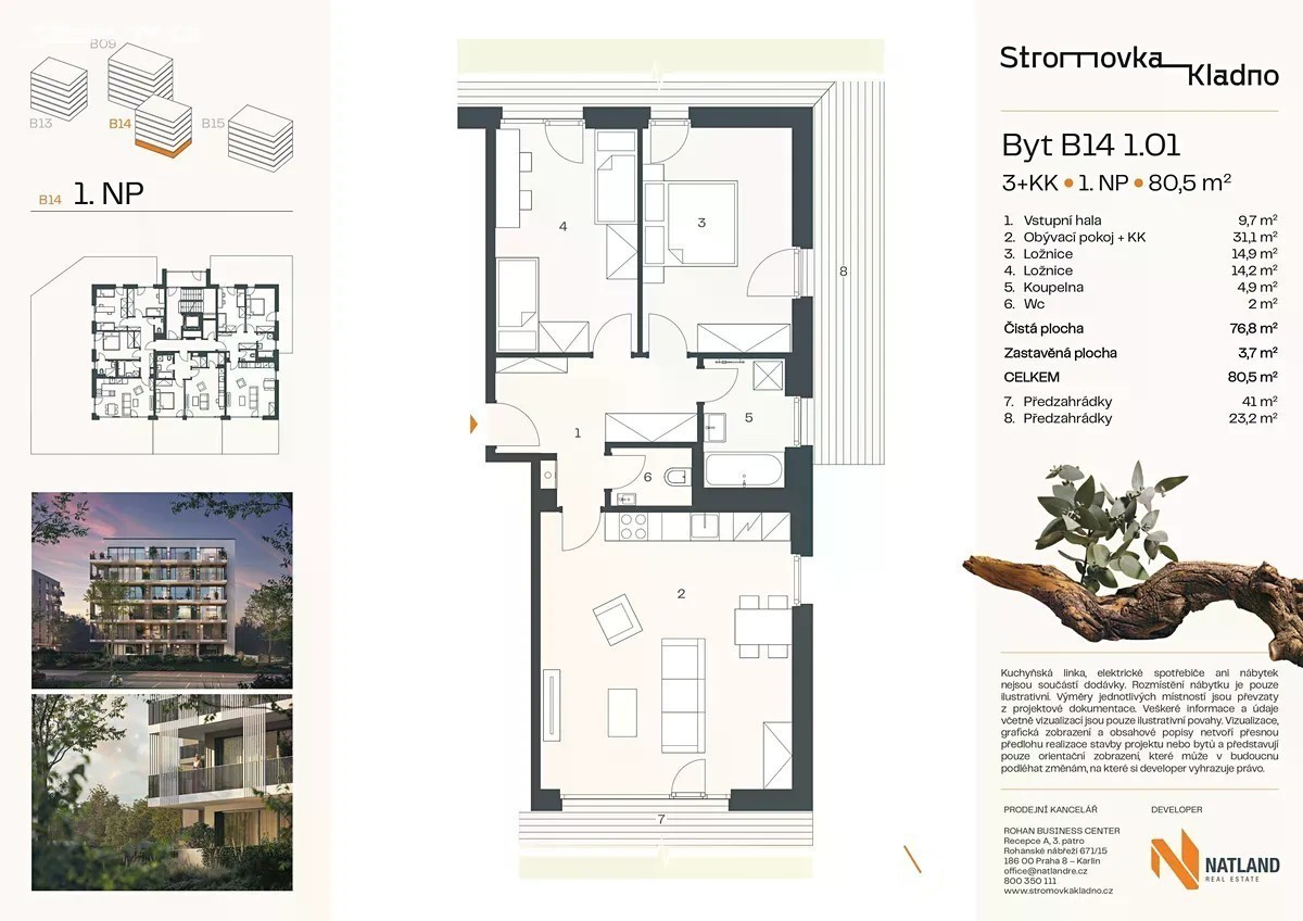 Rohový byt 3+kk orientovaný na severozápad. Obývací pokoj s oknem v kuchyňském koutu a výstupem na balkon, prostorné neprůchozí ložnice, koupelna s vanou a oknem, samostatná toaleta, vstupní hala s místem pro úložné prostory.