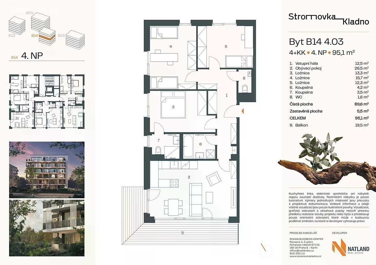 Prostorný byt 4+kk umístěný přes celou šíři domu s orientací jih - západ - sever. Obývací pokoj s výstupem na rohový balkon, neprůchozí ložnice z toho jedna s vlastní koupelnou se sprchovým koutem a toaletou, hlavní koupelna s vanou, samostanté WC, vstupní hala s nikou pro vestavěnou skříň.