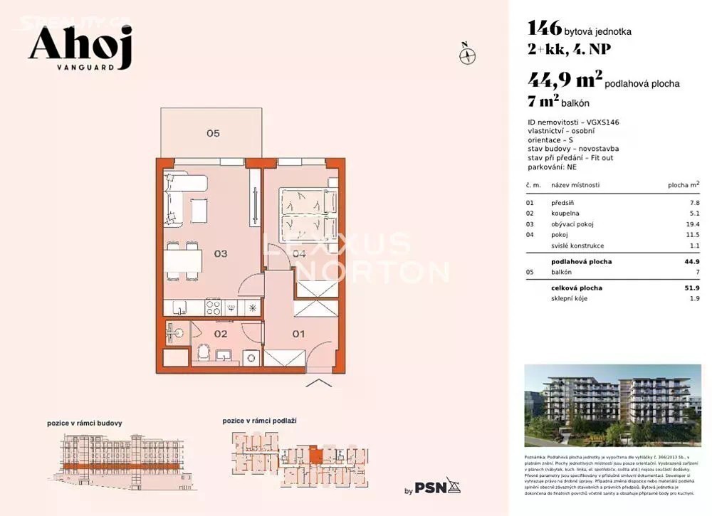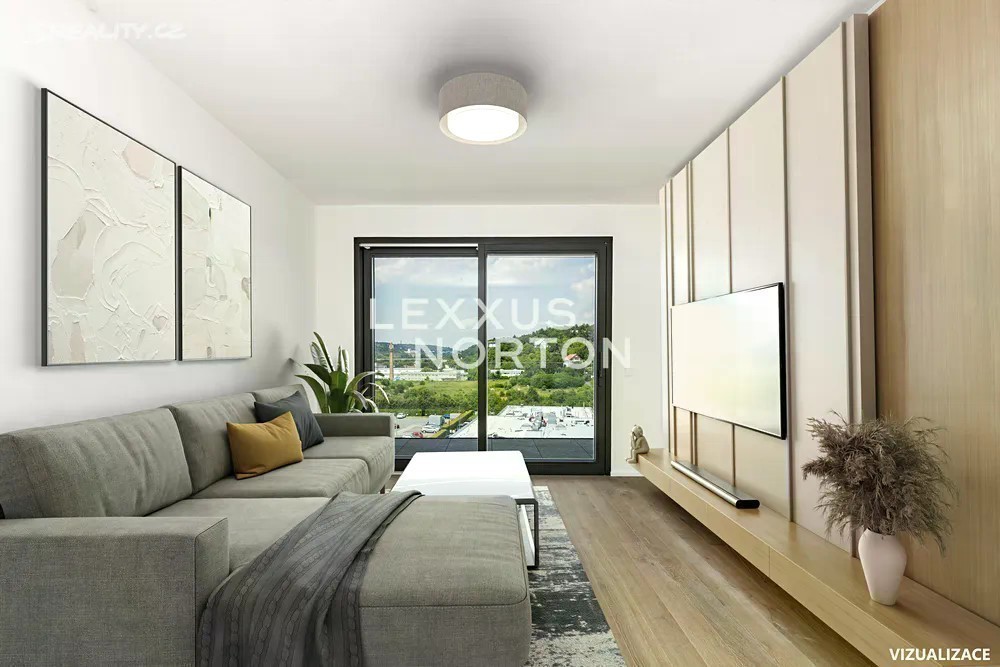 Moderní byt 2+kk s balkonem a hezkým otevřeným výhledem do okolí. Jedná se o tradiční 2+kk kde na vstupní halu navazují jednotlivé místnosti. V našem případě velmi pohodlná a prostorná koupelna se sprchovým koutem a integrovanou toaletou, obývací pokoj s kuchyňským koutem a ložnice. Na obývací pokoj navazuje poměrně prostorný balkon s výhledem do dalekého okolí. Jedná se o právě dokončenou novostavbu bytového domu zvaného Ahoj, který tvoří volný obytný tandem s exklusivní vedle stojící stavbou Vanguard. V rámci Vanguardu lze využít pestrou škálu zdejšího zázemí zahrnující nejen bazén, wellness, kino, posilovnu a další příslušenství, ale především také 24hod recepci s ostrahou a concierge službou. Oba domy jsou propojeny v úrovni 1.PP podzemní chodbou. K bytu přísluší sklepní kóje v 1.PP. Dřevěné plovoucí podlahy, moderní koupelna s walk-in sprchovým koutem, rekuperace, příprava na umístění klimatizačních jednotek, bezpečnostní vstupní dveře. Dům je součástí nové rezidenční zástavby postupně vznikající podél ulice Modřanská, nedaleko vltavského břehu. Lokalita je atraktivní svým spojením dobré dostupnosti centra města s pestrou škálou volnočasového vyžití, kterým v tomto místě disponuje pravý vltavský břeh. Lze zde nalézt upravené parkové plochy a velké sportovní celky jako je areál Hamr - Braník, Golf Hodkovičky nebo probíhající cyklostezka. Centrum města dostupné do 30ti minut vozem nebo MHD. Letiště dostupné do 30ti minut vozem.