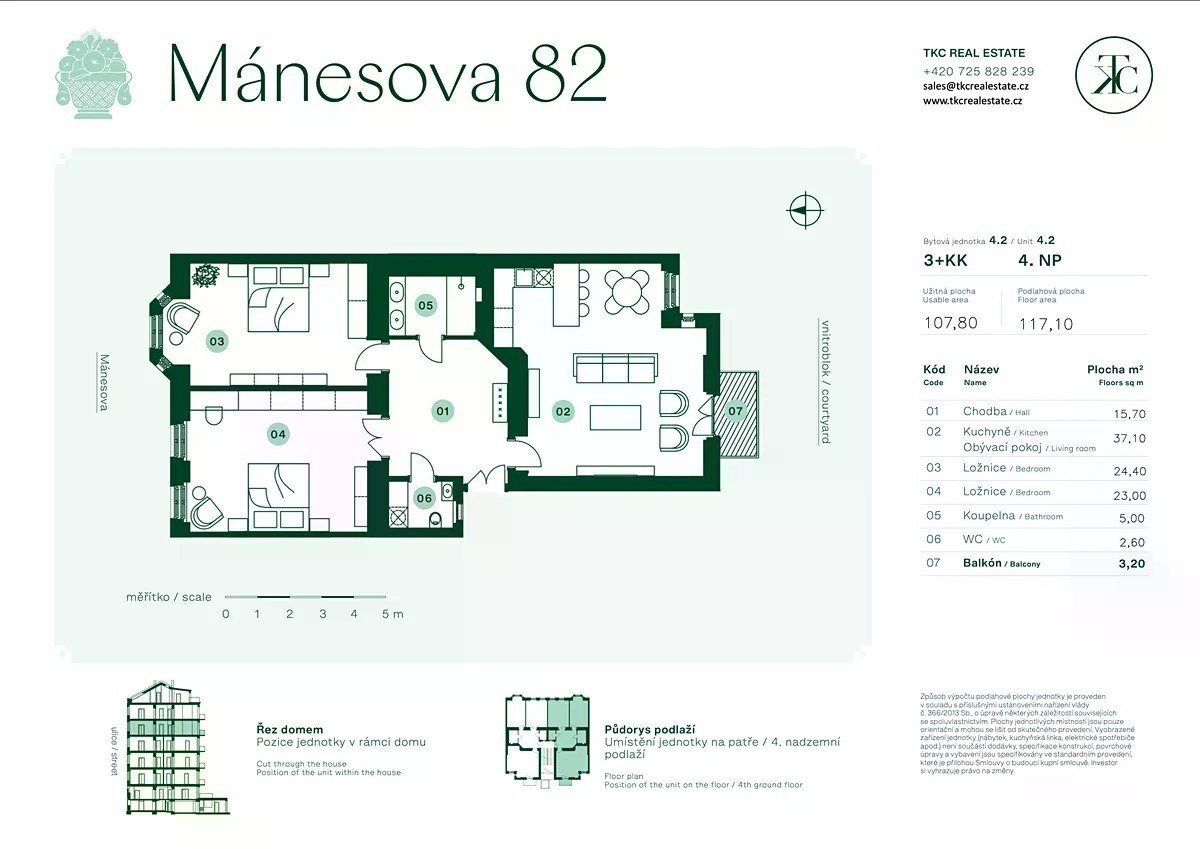 Váš klidný a prostorný domov ve Vinohradech Nabízíme velkorysý byt 3+kk o podlahové ploše 117,1 m², umístěný ve 4. nadzemním podlaží krásně zrekonstruovaného secesního domu v Mánesově ulici. Tato jednotka osloví ty, kdo hledají kombinaci stylového městského bydlení a soukromého prostoru s výjimečnou atmosférou. Dispozice nabízí dvě prostorné ložnice, velký obývací pokoj s kuchyňským koutem a přístupem na balkon orientovaný do vnitrobloku. Ideální řešení pro páry, mladou rodinu nebo jednotlivce, kteří chtějí propojit práci z domova s pohodovým životem v jedné z nejlepších částí Prahy. Byt vyniká příjemnou světelností - obývací pokoj s kuchyní je orientován na jih, zatímco ložnice směřují na severní stranu, což zajišťuje optimální klima po celý den. Umístění ve vyšším patře zaručuje nejen klid, ale i dostatek přirozeného světla. Interiér je proveden v nadčasovém stylu, který citlivě navazuje na historický charakter domu - nechybí zachované původní dveře ani další elegantní detaily z počátku 20. století. Secesní dům z roku 1911 prošel kompletní rekonstrukcí s citem pro autenticitu i kvalitu - nabízí nový výtah, upravený vnitroblok a společné prostory v prvorepublikovém duchu. A lokalita? Mánesova je tichá, vzrostlá ulice doslova pár kroků od náměstí Jiřího z Poděbrad. V okolí najdete kavárny, bistra, trhy, parky i skvělou dopravní dostupnost. Jednoduše místo, které má všechno - styl, klid i komunitu.