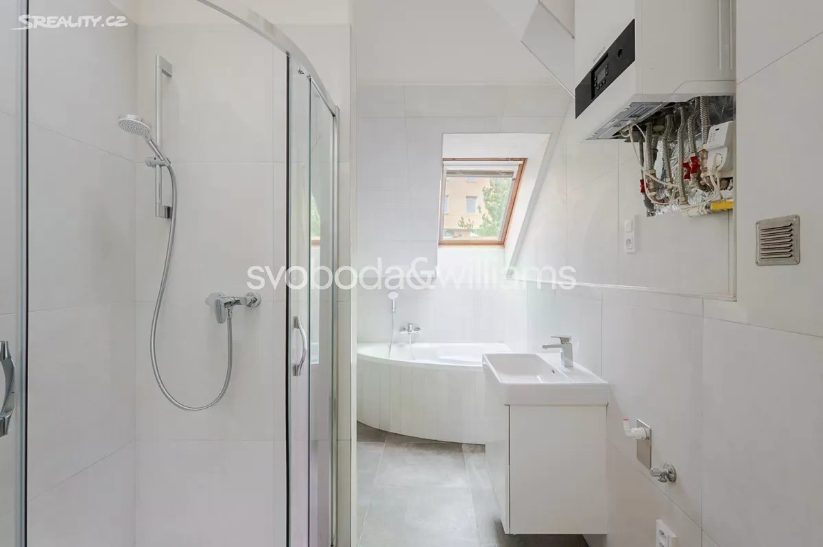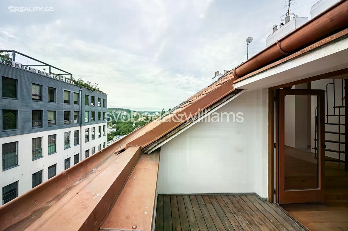 Prostorný třípokojový byt s terasou, umístěný v nejvyšším 4. patře bytového domu s výtahem, vznikl jako půdní vestavba v roce 2006. Nachází se v klidné okrajové části Smíchova, jen pár minut chůze od vstupu do Prokopského údolí a tramvajové zastávky s rychlým spojením k metru Anděl. Plocha bytu je tvořena obývacím pokojem s přípravou pro kuchyňský kout a se vstupem na terasu orientovanou na východ, 2 ložnicemi směrem do vnitrobloku, koupelnou a chodbou. Po vnitřním točitém schodišti lze vystoupat na galerii. Při částečné rekonstrukci byla vybudována nová koupelna zařízená sprchovým koutem, vanou, umyvadlem a toaletou. V bytě jsou původní střešní okna a dřevěné podlahy, vytápění zajišťuje vlastní plynový kotel. V budově je k dispozici výtah, který jezdí do mezipatra. Klidná a dobře dostupná část Smíchova je vzdálená jen několik minut jízdy autem či MHD od rušného Anděla a Obchodního centra Nový Smíchov. Blízké Prokopské údolí a Přírodní památka Ctirad - Dívčí hrady lákají na procházky, vyjížďky na kole či výlety s výhledy na Vltavu a panorama města nejen rodiny s dětmi. Cestování autem usnadní blízký nájezd do tunelového komplexu i na Městský okruh. Podlahová plocha 105 m2, terasa 9 m2.