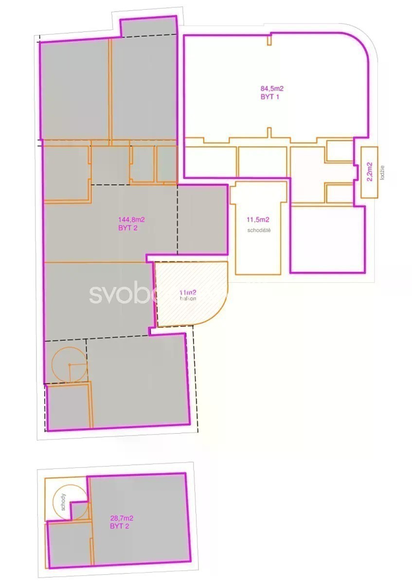 Prostorný mezonetový byt s působivými výhledy na vilové čtvrti Hanspaulka a Ořechovka snoubí odvážnou modernitu s útulností domova. V citlivě navržené přístavbě funkcionalistického viladomu z r. 1932, na atraktivním a klidném místě Prahy 6 ve Starých Střešovicích blízko světoznámé Müllerovy vily. Vstupní úroveň ve 2. podlaží domu tvoří obývací pokoj s přípravou na kuchyni, 3 ložnice, koupelna, samostatná toaleta a předsíň. V podkroví se rozkládá cca 30metrová garsoniéra s koupelnou. K bytu přísluší balkón orientovaný na jihovýchod do tichého dvora porostlého popínavou zelení. Byt po čerstvě dokončené kolaudaci nabízí kvalitní materiály a promyšlené technické řešení. Podlahy jsou z dubových parket, koupelny pokrývá broušené terrazzo. Okna do ulice jsou nová dřevěná špaletová (s dvojskly ve vnějších křídlech), respektuje historický ráz budovy, balkón je přístupný francouzským oknem s izolačními trojskly. Podlahové vytápění i chlazení zajišťuje tepelné čerpadlo, splachování WC je řešeno dešťovou vodou. Projekt tak nabízí exkluzivní bydlení pro náročné s ohledem na ekonomickou i ekologickou udržitelnost. V garáži jsou k bytu vyhrazena 2 parkovací stání. Výtah zde není. Viladům, jehož dominantou je zaoblené nároží, prošel kompletní rekonstrukcí a přitom byl citlivě rozšířen přístavbou. Kromě nabízeného bytu jsou jeho součástí další 2 bytové jednotky, garáž a 3 nebytové prostory (pekárna, ateliér a kancelář). Komorní bytový dům se nachází na atraktivním místě v památkové zóně Staré Střešovice blízko novorománské zvoničky a kostela sv. Norberta, v boční ulici lemované stromořadím. V těsné blízkosti funguje státní škola i soukromá mateřská a základní škola, pekárna, sportoviště či oblíbené koupaliště Na Petynce. Vynikající spojení s centrem je zajištěno tramvajemi, autem se lze rychle napojit na tunelový komplex nebo dojet na letiště. Podlahová plocha 173,5 m2 (včetně garsoniéry 29 m2), balkón 11 m2.