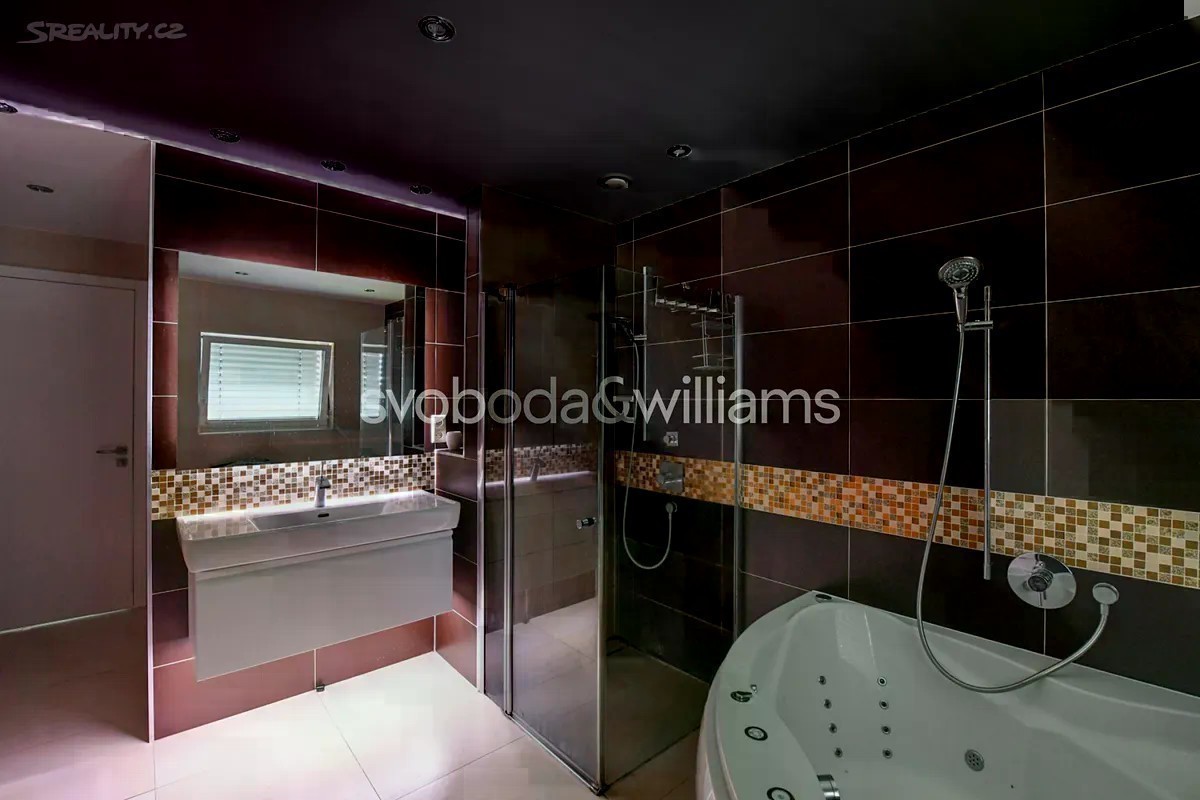 Designový, plně vybavený byt se 2 lodžiemi (zimními zahradami), saunou a krásným výhledem na zelenou vilovou čtvrť je součástí nízkoenergetické rezidence situované jen pár kroků od lesa navazujícího na přírodní rezervaci Prokopské údolí. Byt je situován v 1. nadzemním podlaží. Je tvořen obývacím pokojem s kuchyní, jídelnou a vstupem na větší z obou zimních zahrad. Zde je k dispozici sauna s přidruženou sprchou. Byt se dále skládá z hlavní ložnice s druhou zimní zahradou, dětské ložnice, koupelny s oknem, hydromasážní vanou, sprchovým koutem, toaletou a bidetem, samostatné toalety, technické místnosti a chodby. Špičkový standard vybavení zahrnuje systém inteligentního ovládání domácnosti, klimatizaci ve všech pokojích, dubové podlahy, velkoformátové obklady a dlažbu Sandstone a Lasselsberger, velkoplošná hliníková okna s izolačními trojskly a el. ovládanými žaluziemi, plně vybavenou moderní kuchyni vč. vestavěné chladničky na víno, designové osvětlení, podsvícené podhledy, elektrické podlahové topení. Kupní cena zahrnuje veškeré vybavení a zařizovací předměty vyobrazené na fotografiích, 1 garážové parkovací stání a sklep. Lokalita nabízí rychlou dostupnost centra jak MHD, tak vlastním vozem. Nedaleko je k dispozici školka, škola, tenisové kurty, restaurace, kavárny a další služby občanské vybavenosti. Podlahová plocha 95,3 m2 (včetně sklepa 2m2), lodžie (zimní zahrady) 8,6m2 a 7,6m2 + sauna 4,1 m2.