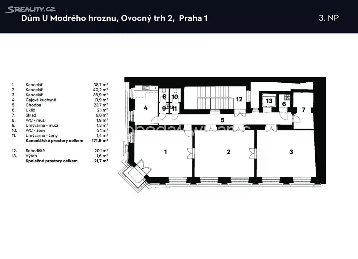Nabízíme exkluzivně k pronájmu unikátní historický dům U Modrého hroznu z počátku 20. století, který je situován v pestižní lokalitě Prahy 1, na nároží Ovocného trhu a Havířské ulice ústící přímo na obchodní třídu Na Příkopě. Dům se nachází v turisticky atraktivní lokalitě v centru Prahy, v blízkosti Stavovského divadla, pár minut pěší chůzí od Václavského a Staroměstského náměstí. Tato čtyřpodlažní budova, po kompletní a citlivé rekonstrukci v nadstandardním provedení, představuje výjimečnou příležitost pro nájemce hledající reprezentativní a polyfunkční prostory v samotném centru hlavního města. Pronájem pouze jako celek. Vhodné pro nájemce, který ocení spojení výjimečné lokality, historické hodnoty a funkční variability budovy. Ideální pro sídlo firmy hledající kombinaci obchodních, kancelářských prostor a možnosti ubytování. Dispozice objektu: V suterénu, přízemí a 1. patře budovy se nacházejí atraktivní obchodní prostory s prosklenými výklady do ulice Havířská, které jsou ideální pro obchod, showroom, reprezentativní recepci či klientskou zónu. Ve 2. a 3. patře jsou situovány kancelářské prostory ve vysokém standardu provedení. Ve 4. patře jsou tři plně vybavené byty 1+kk, ideální pro krátkodobé i dlouhodobé ubytování zaměstnanců nebo hostů. Nemovitost nyní prochází důkladnou rekonstrukcí. Historie: Na tomto místě původně stával dvoupatrový dvojtrakt známý jako dům U Mojžíšů, jehož historie sahá až do 14. století. V 18. století zde bylo umístěno domovní znamení U Modrého hroznu a vznikla zde kavárna, která se po otevření Stavovského divadla stala jedním z nejproslulejších pražských podniků. Pravidelně ji navštěvovala umělecká společnost a podle dochovaných zmínek sem zavítal i Wolfgang Amadeus Mozart. Na přelomu 20. století byl původní dům zbořen a nahrazen neobarokní budovou. Okna v prvním patře byla navržena jako výkladce tzv. metropolitního parteru, což bylo v té době první takové využití v Praze. V přízemí se nacházely obchodní prostory, zatímco v patrech bydleli nájemníci až do druhé světové války. V následujících letech sloužila budova převážně jako sídlo obchodních a kancelářských provozů, přičemž v nejvyšším podlaží zůstaly bytové jednotky. Lokalita: Lokalita nabízí výbornou dostupnost městskou hromadnou dopravou - nejbližší je stanice metra Můstek (linky A a B). Nedaleko na Václavském náměstí a náměstí Republiky se nacházejí tramvajové linky a další stanice metra Muzeum a Náměstí republiky. Nájemné a poplatky jsou uvedeny bez DPH. Nájemce neplatí provizi.