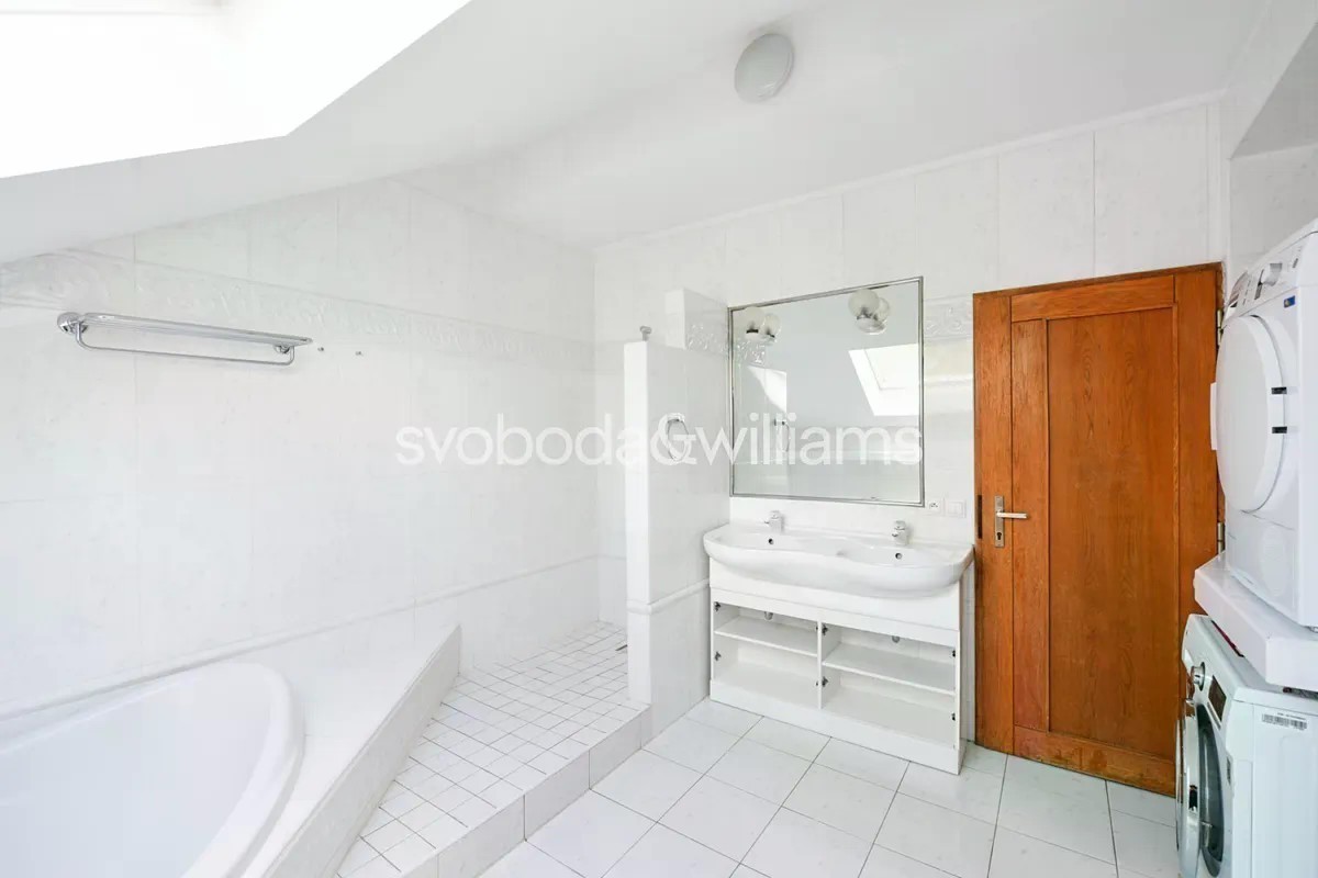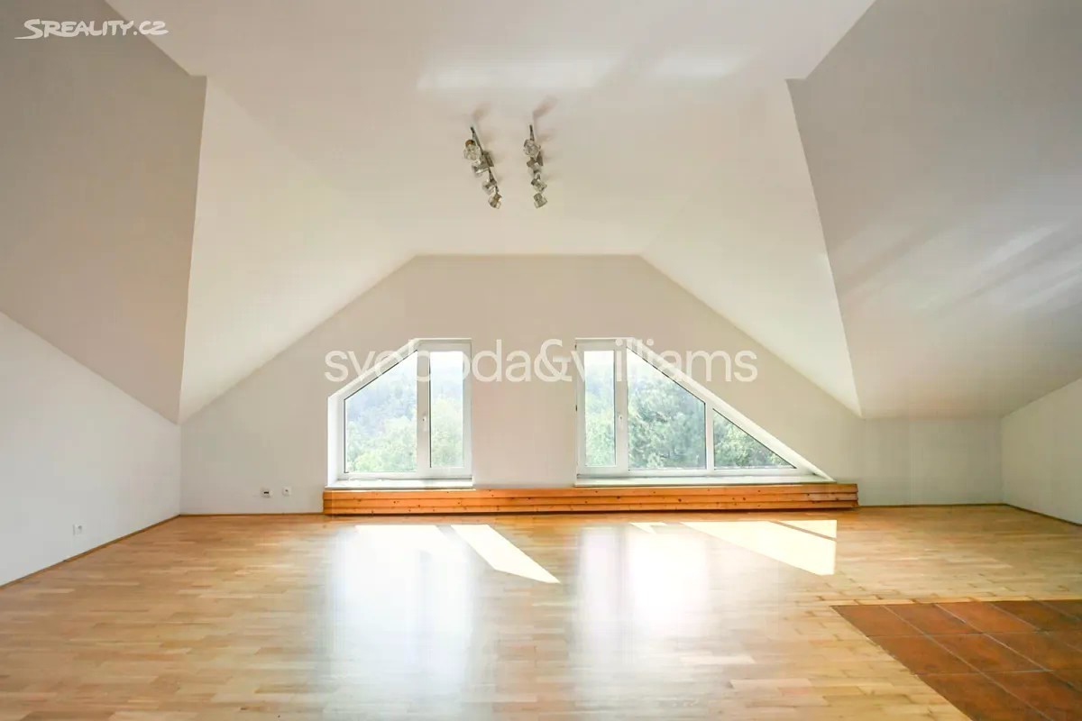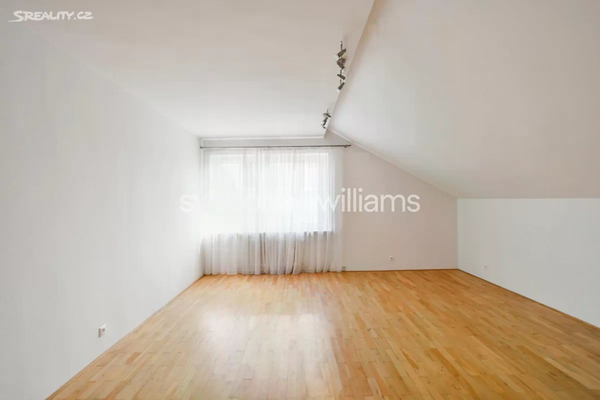 Nabízíme k pronájmu prostorný nezařízený dvouúrovňový byt se 2 koupelnami, terasou (10 m2) a pěkným výhledem do okolí, situovaný v 1. patře vily se zahradou (1000 m2). Dům se nachází v rezidenční čtvrti Braník s výhledem na Hodkovičky, nedaleko britské mezinárodní školy PBS v Praze 4, přibližně 15 minut jízdy od centra města. Ve spodní úrovni byt nabízí 3 ložnice a pracovnu / dětský pokoj, 2 koupelny, obývací pokoj (48 m2), plně vybavenou kuchyň a vstupní halu s vestavěnými skříněmi. V horním patře se nachází galerie vhodná pro hernu a další samostatná ložnice. Výhledy do zeleně, parkety, dlažba, úložné prostory, vestavěné skříně, klimatizace, pračka, sušička, myčka, masážní vana, satelitní připojení, alarm. Na zahradě je nájemníkům k dispozici pohodlné posezení a možnost grilování. Garáž a parkovací stání na pozemku. Velmi vhodné pro rodiny s dětmi.