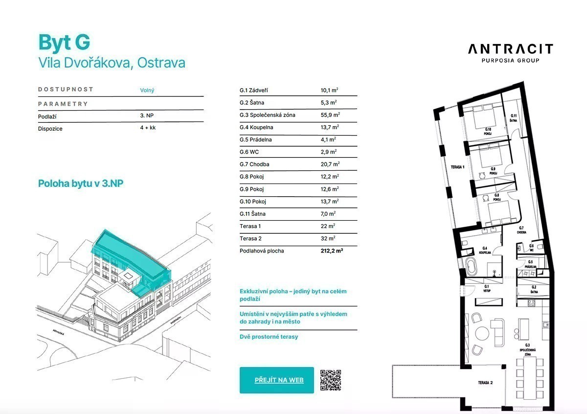 Unikátní byt ve Vile Dvořákova právě v nabídce Byt v historickém centru města, umístěný v nejvyšším patře přístavby noblesní historické vily z roku 1895. Dispozice: 4 + kk / Podlaží: 3.NP / Podlahová plocha: 212,2 m² - Jediný byt na celém podlaží - maximální soukromí - Výhled do klidné zahrady i na město - Soukromá zahrada jako součást domu - Dvě prostorné terasy - Parkovací místo, sklep - Bezbariérový přístup - Nadčasový interiér s důrazem na detail, kvalitu a trvanlivost - Prémiové materiály a moderní technologie