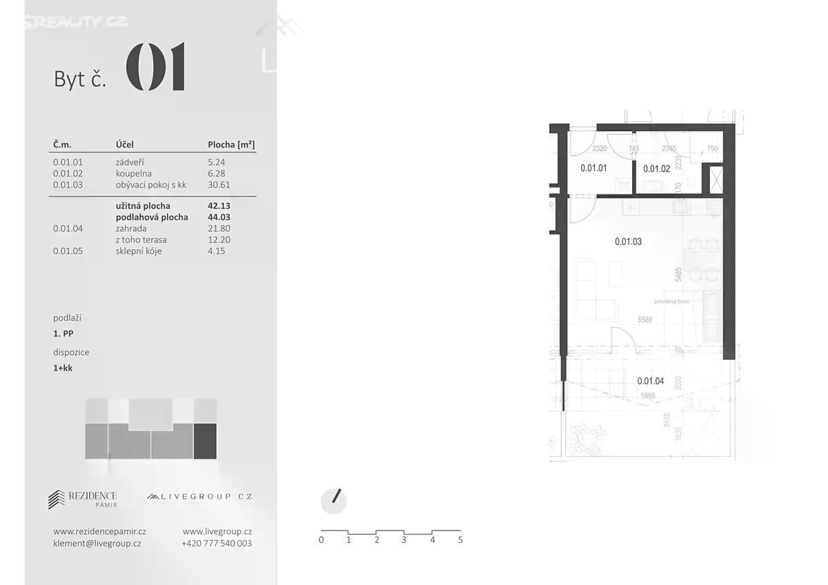 Objevte život blízko města a zároveň v přírodě, objevte svět v REZIDENCE PAMIR. V novém rezidenčním projektu se potkalo vše. Moderní design, vysoký standard i nový domov propojený s přírodou. Developer zahájil výstavbu třetí etapy v 09/ 2024, bytový dům REZIDENCE PAMIR bude zkolaudován a připraven k nastěhování na konci roku 2026. Tento byt č. 1 je umístěn v přízemí 4 podlažní budovy. Jedná se o byt 1+kk s výměrou 44,03 m2 směřující na jižní stranu. Obytný prostor prodlužuje zahrádka s terasou o výměře 21,8 m2. V ceně bytu se sklepním prostorem není zahrnuto parkovací stání v hodnotě 300.000 a rezervační poplatek. Dále v ceně není zahrnuta možnost zakoupit garáž s vraty na elektrické ovládání. K příjemné atmosféře domova budou přispívat světlé prostory díky velkoformátovým plastovým oknům s trojsklem a venkovními žaluziemi na elektrické ovládání. Poskytnou dostatek přirozeného světla a vytvoří posezení, odkud si můžete vychutnávat výhledy v každém ročním období. Promyšlené dispozice a prostorné interiéry s vyšší světlou výškou budou doplňovat vinylové podlahy v dekoru dřeva s podlahovým vytápěním a designové koupelny, celkový komfort bydlení zajistí moderní technologie a parkování u domu. Ještě vyšší úroveň bydlení v REZIDENCE PAMIR poskytují zahrádky, které jsou vhodné pro všechny, kteří pobyt venku ke spokojenému životu vyhledávají. Ať už pro děti a domácí mazlíčky, relax nebo setkávání s rodinou a přáteli. Developer s projektantem vytvořili sdílený prostor pro druhou i třetí etapu a obec Zbýšov zrekonstruovala sdílený park jehož součástí jsou i relaxační a herní prvky, které jsou citlivě zasazeny do celého konceptu zeleně. Pro děti vznikla bezpečná místa pro zábavu a hry a pro všechny ostatní věkové kategorie zóny pro odpočinek i setkávání. Neváhejte se přijít podívat i na dokončenou 1 a 2 etapu na sousedních pozemcích, překvapí vás klidná lokalita a příjemná atmosféra. Naleznete jej v ulici Padělky ve Zbýšově u Brna, v lokalitě s kompletní občanskou vybaveností a přímým spojením do města Brna, do okolních větších obcí i na dálnici D1. Okolí můžete využít k procházkám do přírody. Unikátnost a kvalitu předešlých etap projektu oceňují jejich majitelé i místní. Objevte propojení města s přírodou a žijte spokojeně v REZIDENCI PAMIR. 3 etapa má co nabídnout pro Váš nový domov. Více informací o rezidenčním komplexu a kompletní nabídka bytů na rezidencepamir V případě dotazů nás neváhejte kontaktovat - Michal Klement.
