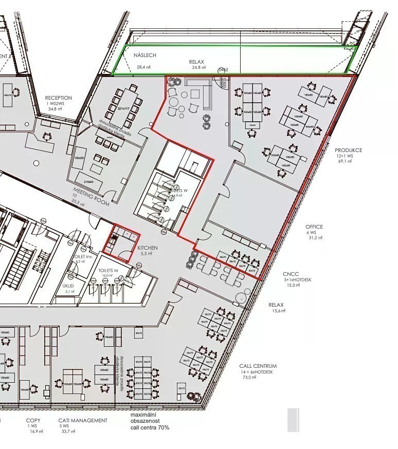 *Neplatíte provizi* Dovolujeme si vám nabídnout podnájem kancelářských prostor se soukromou terasou v projektu DOCK IN, který se nacházejí na pomezí Karlína a Libně na Praze 8. Budova DOCK IN TWO je šesti podlažní budova, která nabízí celkem 8525 m2 kancelářské plochy a poskytuje ten nejvyšší standard výbavy a pracovního prostředí. Kancelářské prostory mají hotový fit-out a jsou rozděleny na velkou kancelář pro 14 os., dvě menší kanceláře pro 3 a 6 osob, relax zónu s možností využití pro pracovní místa a samostatnou kuchyňku. K prostorám náleží soukromá terasa o velikosti 42 m2. Prostory je možné rozšířit o dalších cca 100 m2. K dispozici dle dohody. Okolní atmosféru dokreslují krásná parková úprava a dvě slepá ramena řeky Vltavy, v jejichž docích můžete najít kotvící lodě. V bezprostřední blízkosti se rovněž nachází park Thomayerovy sady, který je vhodný jak k aktivnímu, tak pasivnímu odpočinku. Výborná dopravní dostupnost MHD je zajištěna bezprostřední blízkostí metra B - Palmovka, stejně tak jako množstvím tramvajových spojů. Strategická poloha rovněž nabízí skvělou dostupnost automobilem, ať už do centra města, nebo na dálnici D1, D8 a D11. V budově je dostatek parkovacích míst i parking pro hosty. Parking 3500 Kč/místo/měsíc. K dispozici 3 místa. Objekt nabízí i další jednotky. V této lokalitě Vám můžeme nabídnout i další komerční prostory - nechte si bezplatně zpracovat nabídku aktuálně dostupných prostor dle Vašeho zadání nebo navštivte naše webové stránky.