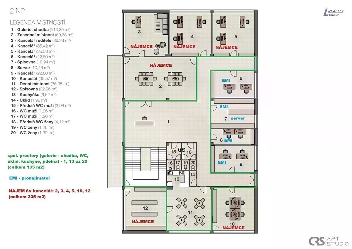 Nabízíme Vám pronájem moderních, prostorných, kanceláří vč. možnosti venkovních 2x parkovacích stání, v budově výrobního závodu kosmetických produktů, v průmyslové zóně na okraji města Příbram, v ulici Dělostřelecká, pouze 50 km od Prahy. Tato budova nabízí v přízemí zázemí firmy především pro výrobu cca 1.500 m2 a 1. patře se pak nacházejí převážně kancelářské prostory cca 300 m2 + cca 280 m2 příslušenství, z nichž je možné pronajmout dle dohod počty kanceláří (celkem až 6) o celkové výměře 235 m2. K dispozici jsou dále společné prostory: V přízemí 95 m2: společná vstupní hala a recepce, vč. schodiště do patra. V patře 135 m2: společná chodba/ galerie, kuchyňka, jídelna - odpočinková zóna, oddělené toalety a úklidová místnost. V patře k pronájmu samostatné kanceláře o výměrách ********* a 33 m2. Budovu bude společně (v 1. NP: výrobní prostory v přízemí areálu, sklady, kanceláře, toalety, sprchy, šatny a spol. prostory) a ve 2. NP (vymezené kanceláře 6, 7, 8, 9 s pol. prostory vč. kuchyňky a toalet) užívat firma E.Mi -International s.r.o. (firma na výrobu luxusní manikúry), která budovu postavila v roce 2021 a nyní bude nájemcem objektu. Jednalo by se tedy o případný podnájem kanceláří, se souhlasem nového vlastníka. Areál je přístupný po novější asf. komunikaci a je napojen na obecní sítě (vodovod na hranici pozemku, kanalizace a plynovod) vlastní vydatný vrt 40 m (150 mm), možnost internetu s Wifi. Zastavěná plocha objektu je cca 1.514 m2 a jedná se o prefabrikovaný železobetonový skelet o dvou nadz. podlaží a ploché střeše. Střešní krytina je tvořena pásy z SBS modifikovaného asfaltu. Obvodový plášť je postaven i izolačních sendvičových panelů Goldbek, zasklení kvalitními plastovými a hliníkovými okny vč. izol. trojskel. Areál byl postaven Příbramskou stavební firmou s několikaletými zkušenostmi. Dále mimo jiné: příprava pro venkovní el. stínění, rekuperace - vzduchotechnika, alarm vč. dálkového hlídání, LED osvětlení, úpravna vody, nádrže pro případ požáru, ÚT s VK radiátory a částečně podlahové topení, elektrostaticky vodivá podlaha v části objektu, atd. Majitel si vyhrazuje právo vybrat si zájemce na základě vlastních požadavků. Kanceláře jsou volné ihned, dle dohody smluvních stran.