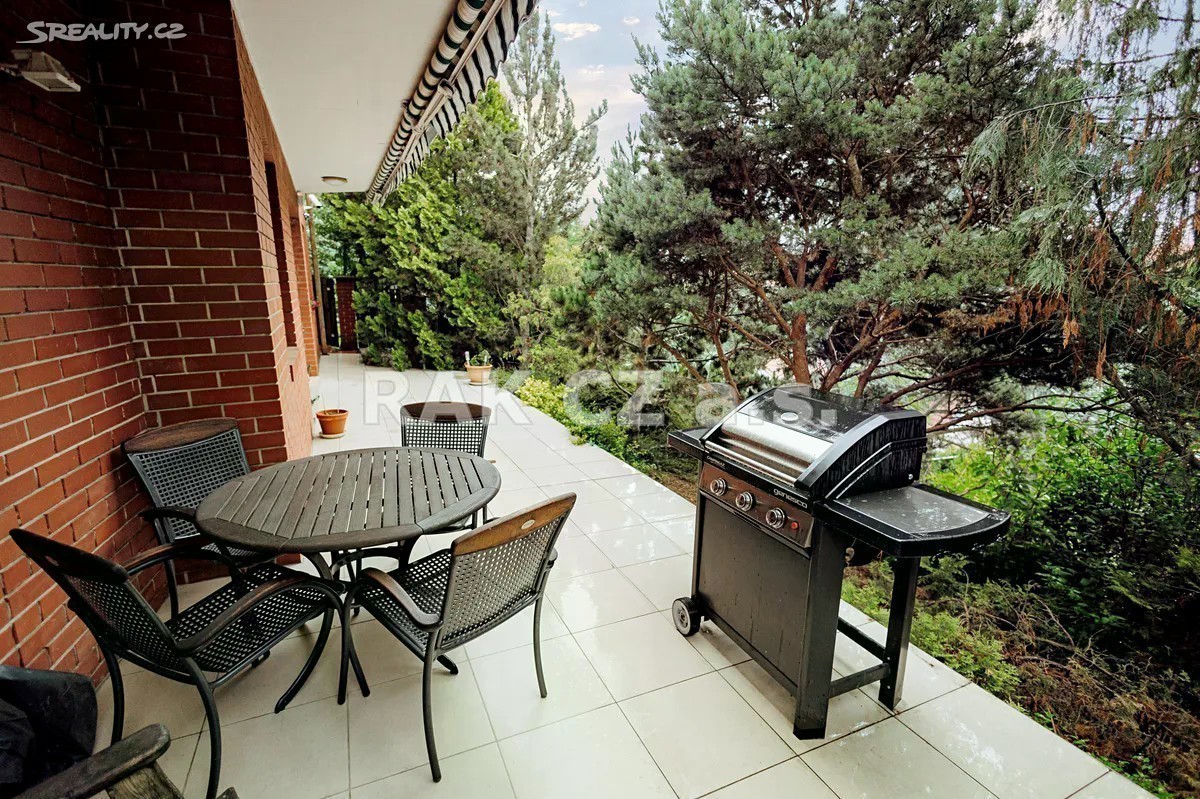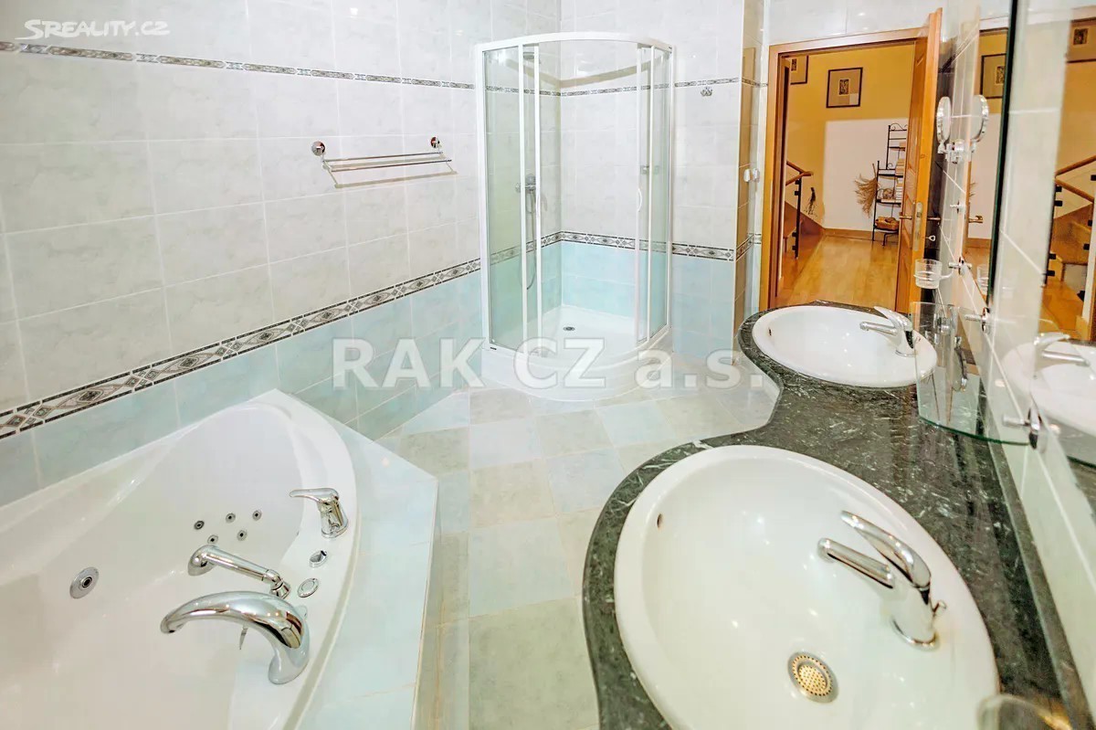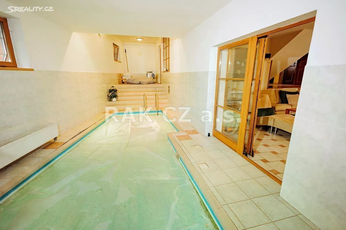Velmi prostorný dům 6+1 s vnitřním bazénem a dvougaráží; 4 koupelny, 5 toalet; 4 terasy a velký balkon; soukromí a klid na konci slepé ulice; vyhledávaná rezidenční lokalita; stabilizovaná okolní zástavba; vzrostlá zahrada. Předmětem prodeje je samostatný zděný dům, postavený v roce 1998 v horní části, k jihu výrazněji svažitého, zcela oploceného pozemku, pravidelného obdélníkového tvaru, o výměře 700 m2, na konci slepé ulice Ke Skalkám, Praha 10 - Záběhlice. Dům má prakticky čtvercový půdorys, rozšířený o bazénovou část, dvě nadzemní podlaží, kdy každé je výškově rozděleno, 4-mi až 5-ti schody, na plnohodnotné půl podlaží, pro oddělení různých funkčních zón domu. Celková plocha činí cca 250 m2, zastavěná plocha je 224 m2, zahrada 476 m2. V I. NP je vstupní místnost; centrální hala se schodištěm; obývací pokoj s krbem a jídelnou, se vstupem na jižní terasu a k bazénu; samostatná, plně vybavená kuchyně; toaleta; prádelna se sprchovým koutem a další toaletou a technická místnost. Ve II. NP je velká centrální hala se schodištěm; tři velké ložnice (jedna má vlastní koupelnu s toaletou); pracovna se vstupem na východní terasu; velká koupelna s rohovou vanou, dvěma umyvadly a sprchovým koutem; samostatná toaleta, velká šatna; a pokoj pro hosty s vlastní koupelnou a toaletou. Z haly a dvou ložnic je vstup na balkon, či terasu, včetně velké střešní terasy s panoramatickým výhledem na Prahu. Dům je napojen na elektřinu, veřejný vodovod, veřejnou kanalizaci a plyn, vybaven zabezpečovacím systémem, obložen lícovými cihlami, zajišťujícími výborné tepelně izolační vlastnosti domu. Vytápění (v kuchyni, hale a technické místnosti v přízemí podlahové, jinak radiátory) a ohřev vody zajišťuje plynový kotel Junkers se zásobníkem. Okna dřevěná s dvojskly. Součástí pozemku je velká garáž (částečně zapuštěná do terénu) pro dva vozy, se skladovací místností v zadní části, s vjezdovými vraty přímo z ulice. Příjezd je zajištěn prostřednictvím obecní asfaltové komunikace, parkování dalších 2-3 vozů je možné na ulici, před garáží. Místo nabízí výbornou dopravní dostupnost autem i veřejnou dopravou (blízkost napojení na Jižní spojku i Pražský okruh; autobus cca 200 m od domu). Perfektní je rovněž občanská vybavenost v blízkém okolí a mnohé možnosti sportovního vyžití, např. areál Hamr. PENB není zpracován (uvádíme proto třída G) předpoklad je třída C. Více informací u makléře. Dům i jeho okolí vám rádi osobně ukážeme.
