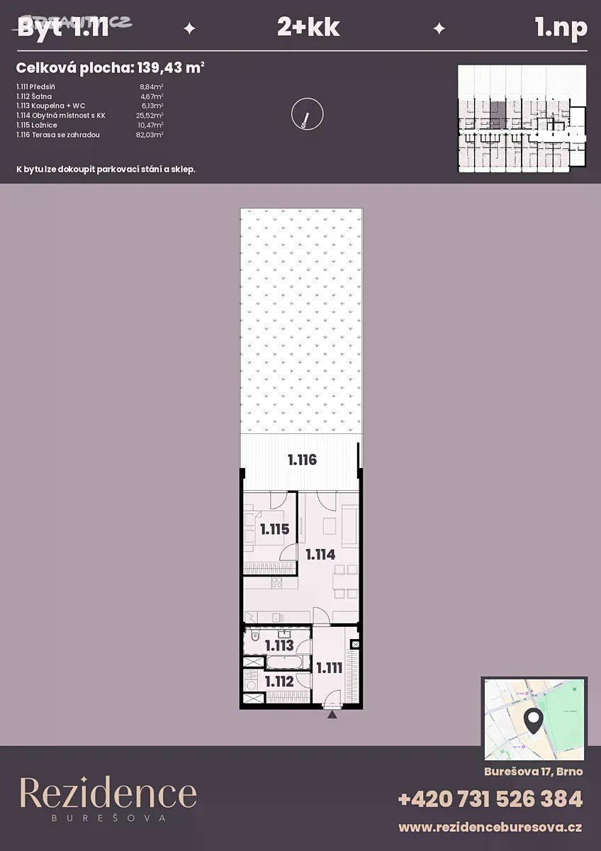 Nabízíme k prodeji moderní byt 2+kk o podlahové ploše 57,33 m2 s terasou 82,03 m2 nacházející se v námi připravovaném projektu Rezidence Burešova v atraktivní lokalitě Veveří. K bytu lze koupit parkovací místo v zakladači i sklad. Orientace tohoto bytu je JV. Velkorysá terasa umožňuje po dlouhém pracovním dni nejen relaxaci, ale i příjemné posezení s rodinou. Podlahové vytápění zajišťuje rovnoměrné a příjemné teplo po celém bytě. Celý byt je navržen s důrazem na moderní design a kvalitní materiály, což splňuje vysoké standardy. Byt disponuje přípravou na předokenní žaluzie a přípravou na klimatizaci. V domě se nachází prostorná místnost určená pro kočárky a kola. Rezidence Burešova se nachází v oblíbené a vyhledávané lokalitě v blízkosti parku Lužánky umožňující relaxaci v zeleni i sportovní vyžití. Umístění domu nabízí veškerou občanskou vybavenost, včetně obchodů, restaurací a kaváren, divadel a kin v docházkové vzdálenosti. Dále se vyznačuje výbornou dopravní dostupností do centra města. Dokončení projektu je plánováno ke konci roku 2027. Pokud hledáte komfortní a moderní bydlení v blízkosti centra města Brna, je tento byt tou pravou volbou pro vás. Pro více informací nebo sjednání prohlídky s možností výhledu ze stávající budovy nás neváhejte kontaktovat.