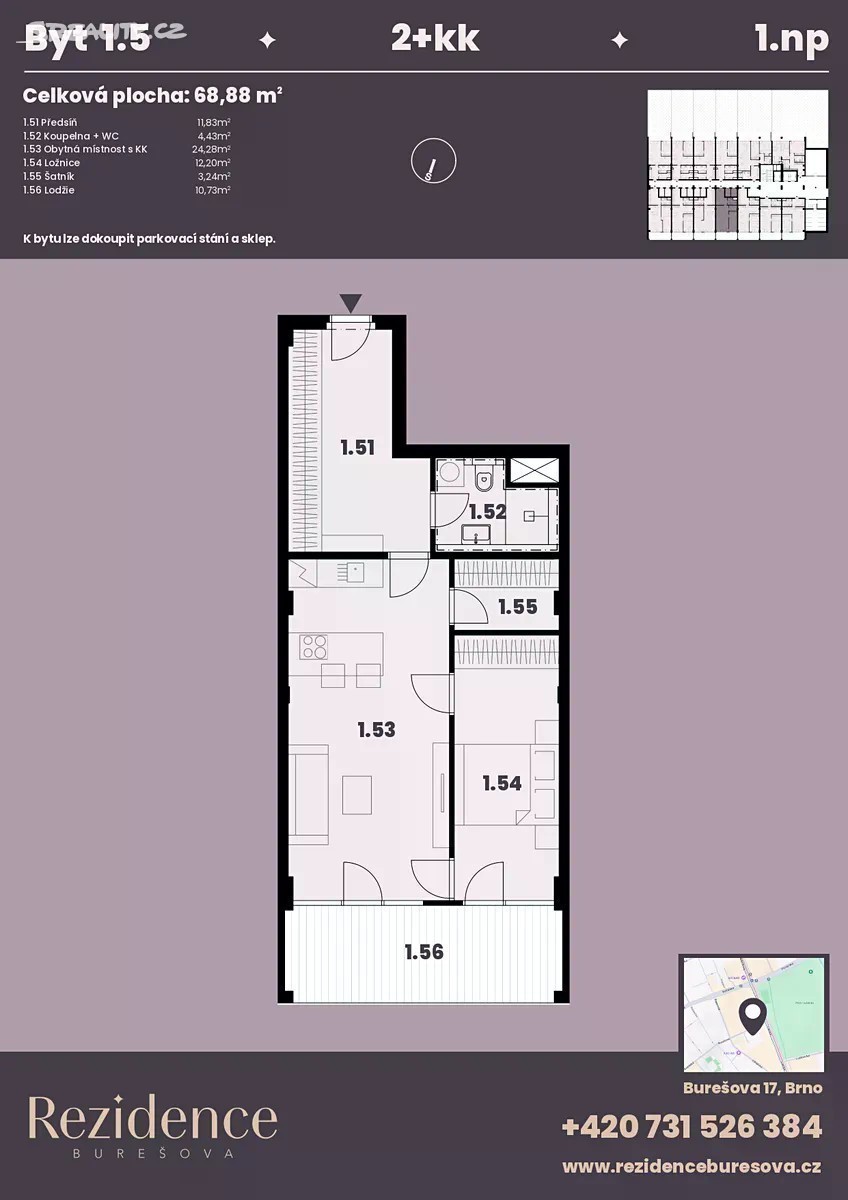 Nabízíme k prodeji moderní byt 2+kk o podlahové ploše 58,69 m2 s lodžií 10,73 m2 nacházející se v námi připravovaném projektu Rezidence Burešova v atraktivní lokalitě Veveří. K bytu lze koupit parkovací místo v zakladači i sklad. Orientace tohoto bytu je sever. Velkorysá lodžie umožňuje po dlouhém pracovním dni nejen relaxaci, ale i příjemné posezení s rodinou. Podlahové vytápění zajišťuje rovnoměrné a příjemné teplo po celém bytě. Celý byt je navržen s důrazem na moderní design a kvalitní materiály, což splňuje vysoké standardy. Byt disponuje přípravou na předokenní žaluzie. V domě se nachází prostorná místnost určená pro kočárky a kola. Rezidence Burešova se nachází v oblíbené a vyhledávané lokalitě v blízkosti parku Lužánky umožňující relaxaci v zeleni i sportovní vyžití. Umístění domu nabízí veškerou občanskou vybavenost, včetně obchodů, restaurací a kaváren, divadel a kin v docházkové vzdálenosti. Dále se vyznačuje výbornou dopravní dostupností do centra města. Dokončení projektu je plánováno říjen 2027. Pokud hledáte komfortní a moderní bydlení v blízkosti centra města Brna, je tento byt tou pravou volbou pro vás. Pro více informací nebo sjednání prohlídky s možností výhledu ze stávající budovy nás neváhejte kontaktovat.