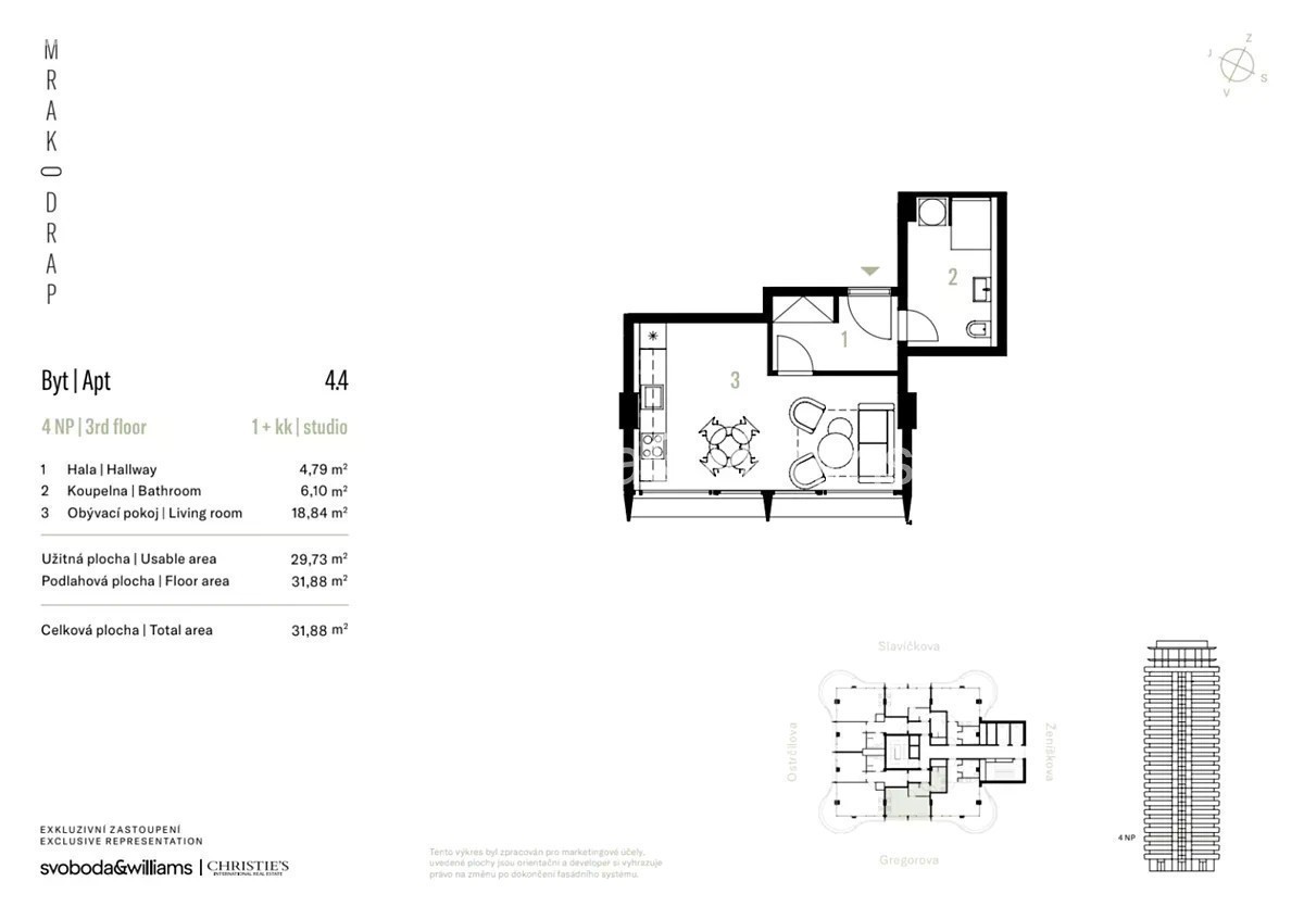 Jednopokojový světlý byt je součástí unikátního rezidenčního projektu Mrakodrap. Rezidence vzniká v centru Moravské Ostravy konverzí obytné věže z roku 1968, která se svými 24 podlažími zůstává výškovou dominantou města i dnes. Renomované architektonické studio AI • DESIGN architektů Evy Jiřičné a Petra Vágnera je podepsáno pod novou podobou budovy představující udržitelnou tvář moravskoslezské metropole. Dispozici jednotky ve 4.NP tvoří rohový obytný prostor s přípravou na kuchyni, koupelna a předsíň. Kvalitní standard zahrnuje velkoformátová hliníková okna s trojskly, vinylové podlahy, velkoformátovou dlažbu, walk-in sprchový kout nebo sanitu osvědčených značek. Byt má rekuperaci a podlahové vytápění (v létě dochlazování), zdroj tepla je centrální. K bytu přísluší sklepní kóje a garážové stání za příplatek v nově postaveném sousedním objektu. Poloha v centru Moravské Ostravy umožňuje mít na dosah ruky vše potřebné: obchody včetně nákupních center, restaurace, kavárny, lékařské služby, galerie a divadla. Jen pár kroků vede do Komenského sadů, během chvíle se lze napojit na cyklostezku podél Ostravice. Vynikající dopravní spojení zajišťují trolejbusy, autobusy a tramvaje z blízkých zastávek, v pohodlném dosahu je také železniční stanice Ostrava hlavní nádraží. Podlahová plocha 31,88 m2 Pro více informací o jednotkách, cenách a dostupnosti kontaktujte naši kancelář. Vizualizace na tomto webu jsou uměleckým ztvárněním projektu a nebyly vytvořeny ve spolupráci s AI • DESIGN, autorem architektonického návrhu. Tyto vizualizace jsou tedy předběžného charakteru a neodpovídají finální podobě projektu.
