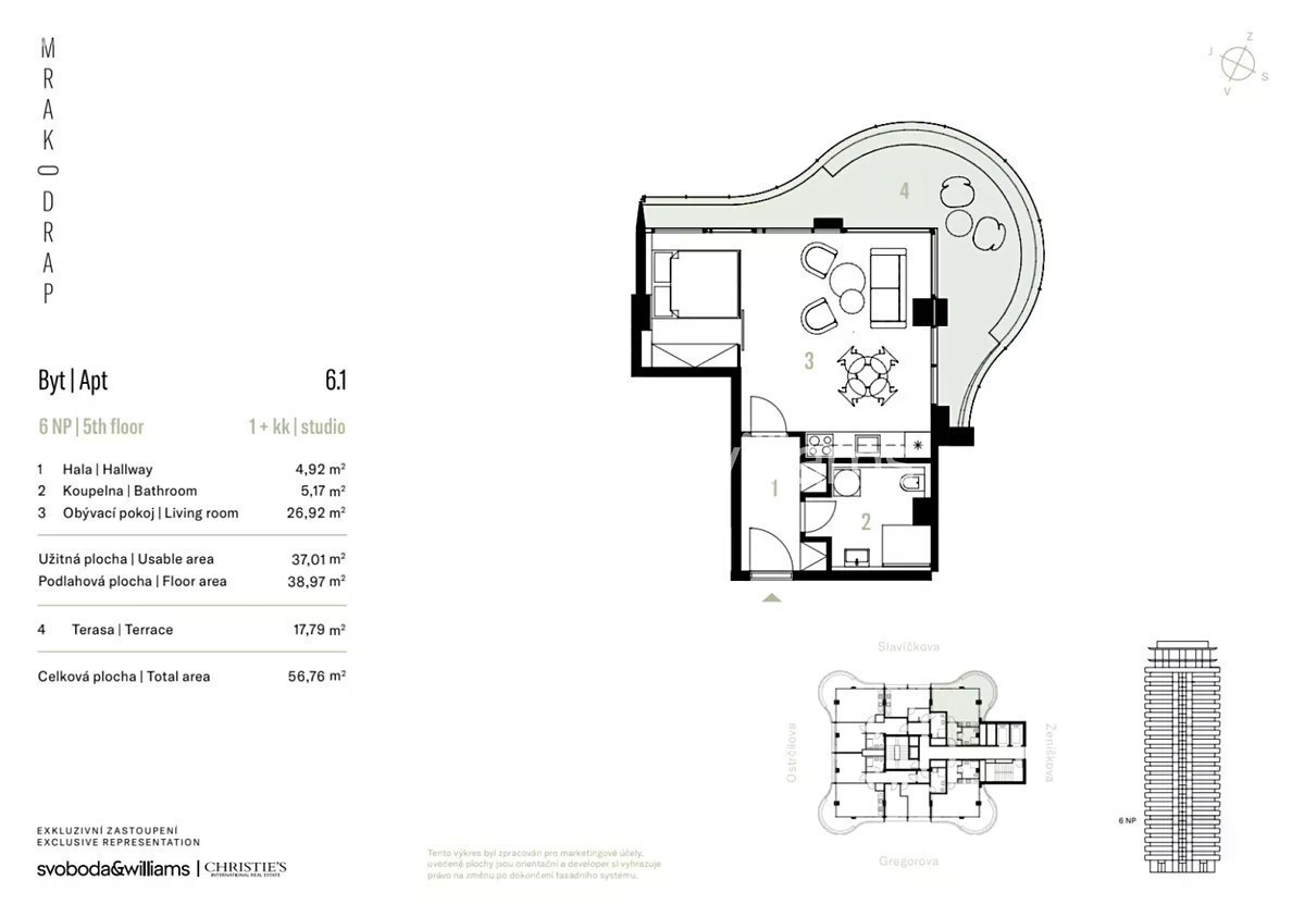 Jednopokojový světlý byt s velkou terasou je součástí unikátního rezidenčního projektu Mrakodrap. Rezidence vzniká v centru Moravské Ostravy konverzí obytné věže z roku 1968, která se svými 24 podlažími zůstává výškovou dominantou města i dnes. Renomované architektonické studio AI • DESIGN architektů Evy Jiřičné a Petra Vágnera je podepsáno pod novou podobou budovy představující udržitelnou tvář moravskoslezské metropole. Dispozici jednotky v 6.NP tvoří rohový obytný prostor s přípravou na kuchyni, koupelna a předsíň. Obytný prostor ze dvou stran obepíná prostorná, západně orientovaná terasa. Kvalitní standard zahrnuje velkoformátová hliníková okna s trojskly, vinylové podlahy, velkoformátovou dlažbu, walk-in sprchový kout nebo sanitu osvědčených značek. Byt má rekuperaci a podlahové vytápění (v létě dochlazování), zdroj tepla je centrální. K bytu přísluší sklepní kóje a garážové stání za příplatek v nově postaveném sousedním objektu. Terasa bude osazena zelení se samozavlažovacím systémem. Poloha v centru Moravské Ostravy umožňuje mít na dosah ruky vše potřebné: obchody včetně nákupních center, restaurace, kavárny, lékařské služby, galerie a divadla. Jen pár kroků vede do Komenského sadů, během chvíle se lze napojit na cyklostezku podél Ostravice. Vynikající dopravní spojení zajišťují trolejbusy, autobusy a tramvaje z blízkých zastávek, v pohodlném dosahu je také železniční stanice Ostrava hlavní nádraží. Podlahová plocha 38,97 m2, terasa 17,79 m2. Pro více informací o jednotkách, cenách a dostupnosti kontaktujte naši kancelář. Vizualizace na tomto webu jsou uměleckým ztvárněním projektu a nebyly vytvořeny ve spolupráci s AI • DESIGN, autorem architektonického návrhu. Tyto vizualizace jsou tedy předběžného charakteru a neodpovídají finální podobě projektu.