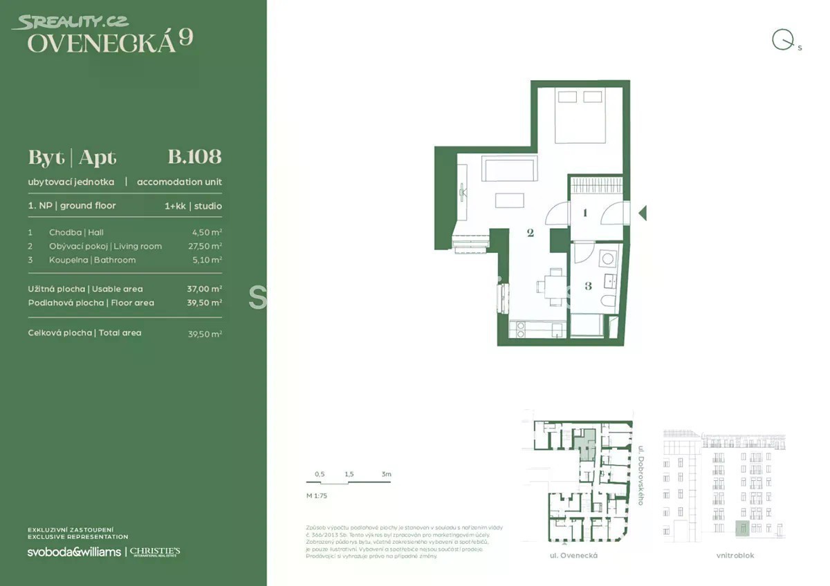 Ubytovací jednotka s orientací do vnitrobloku je součástí nového rezidenčního projektu Ovenecká 9. Ten vzniká kompletní rekonstrukcí nárožního domu z roku 1900 na prestižní adrese na Letné, ve čtvrti se spoustou kaváren a bister, blízko Letenských sadů i tramvajových spojů do centra a ke stanicím metra. Dokončení je plánováno na 1. pololetí roku 2027. Půdorys jednotky v 1. podlaží tvoří obytná místnost s přípravou na kuchyni, koupelna (s WC a sprchovým koutem) a vstupní chodba. Vysoký standard zahrnuje dřevěné parketové kartáčované podlahy dub rustik, bezpečnostní masivní lakované kazetové vchodové dveře s bezpečnostním kováním, dřevěné repliky špaletových oken, designovou koupelnu. K bytu je nutné přikoupit sklepní kóji. Dům bude mít moderní výtah, reprezentativní společné prostory s mramorovým obkladem, repasovaným kamenným schodištěm a zdobným zábradlím. Dům stojí v klidné ulici blízko Národního technického muzea i Národního zemědělského muzea, cesta do Národní galerie, artového kina Bio Oko, k Metronomu či na Výstaviště zabere pěšky jen pár minut. Okolí je plné restaurací, kaváren, bister a barů, v docházkové vzdálenosti jsou i supermarkety a nákupní centrum, oblast zpříjemňují upravené Letenské sady a Stromovka. Skvělé dopravní spojení zajišťují tramvaje ze zastávky vzdálené 2 minuty pěšky, ke stanicím metra lze dojet během 5 minut, v docházkové vzdálenosti bude i plánovaná zastávka rychlodráhy na letiště. Podlahová plocha 39,5 m2.