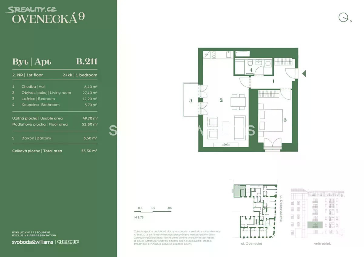 Byt ve 2.NP je součástí nového rezidenčního projektu Ovenecká 9. Ten vzniká kompletní rekonstrukcí nárožního domu z roku 1900 na prestižní adrese na Letné, ve čtvrti se spoustou kaváren a bister, blízko Letenských sadů i tramvajových spojů do centra a ke stanicím metra. Dokončení je plánováno na 1. pololetí roku 2027. Půdorys bytu tvoří obývací pokoj s přípravou na kuchyni, ložnice, koupelna s vanou a WC, komora a vstupní chodba. Vysoký standard zahrnuje dřevěné parketové kartáčované podlahy dub rustik, masivní lakované kazetové vchodové dveře s bezpečnostním kováním, dřevěné repliky špaletových oken do ulice a nová eurookna do vnitrobloku, designovou koupelnu. K bytu je nutné přikoupit sklepní kóji. Dům bude mít moderní výtah, reprezentativní společné prostory s mramorovým obkladem, repasovaným kamenným schodištěm a zdobným zábradlím. Dům stojí v klidné ulici blízko Letenských sadů, Národního technického muzea i Národního zemědělského muzea, cesta do Národní galerie, artového kina Bio Oko, k Metronomu, do Stromovky či na Výstaviště zabere pěšky jen pár minut. Okolí je plné restaurací, kaváren, bister a barů, v docházkové vzdálenosti jsou i supermarkety a nákupní centrum. Skvělé dopravní spojení zajišťují tramvaje ze zastávky vzdálené 2 minuty pěšky, ke stanicím metra lze dojet během 5 minut, v docházkové vzdálenosti bude i plánovaná zastávka rychlodráhy na letiště. Podlahová plocha 53,9 m2.