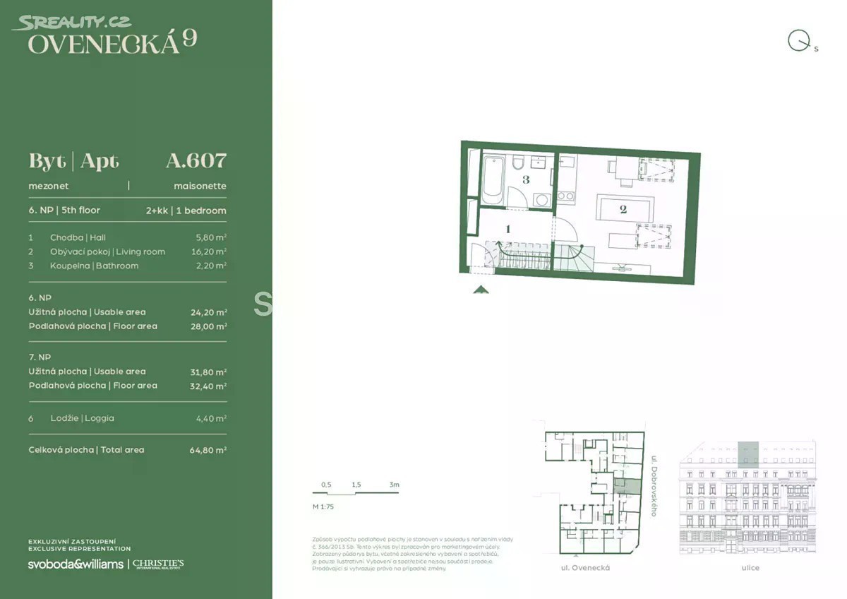 Mezonet s jihozápadní lodžií do vnitrobloku je součástí nového rezidenčního projektu Ovenecká 9. Ten vzniká kompletní rekonstrukcí nárožního domu z roku 1900 na prestižní adrese na Letné, ve čtvrti se spoustou kaváren a bister, blízko Letenských sadů i tramvajových spojů do centra a ke stanicím metra. Dokončení je plánováno na 1. pololetí roku 2027. Půdorys bytu ve vstupní úrovni (6.NP) tvoří obývací pokoj s přípravou na kuchyni, chodba a koupelna (s vanou a toaletou). Vnitřní schodiště vede do horního podlaží (7.NP), kde se nachází galerie a ložnice se vstupem na lodžii. Vysoký standard zahrnuje dřevěné parketové kartáčované podlahy (dub rustik), masivní lakované kazetové vchodové dveře s bezpečnostním kováním, dřevěné repliky špaletových oken do ulice na nová eurookna do vnitrobloku, designovou koupelnu. K bytu je nutné přikoupit sklepní kóji a lze k němu přikoupit také parkovací místo v zakladači v krytém vnitrobloku. Dům bude mít moderní výtah, reprezentativní společné prostory s mramorovým obkladem, repasovaným kamenným schodištěm a zdobným zábradlím. Dům stojí v klidné ulici blízko Národního technického muzea i Národního zemědělského muzea, mateřské a základní školy i gymnázia. Cesta do Národní galerie, artového kina Bio Oko, k Metronomu či na Výstaviště zabere pěšky jen pár minut. Okolí je plné restaurací, kaváren, bister a barů, v docházkové vzdálenosti jsou i supermarkety a nákupní centrum, oblast zpříjemňují krásně upravené parky - Letenské sady a Stromovka. Skvělé dopravní spojení zajišťují tramvaje ze zastávky vzdálené 2 minuty pěšky, ke stanicím metra lze dojet během 5 minut, v docházkové vzdálenosti bude i plánovaná zastávka rychlodráhy na letiště. Podlahová plocha 60,4 m2, lodžie 4,4 m2.