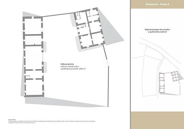 Dovolujeme si Vám nabídnout ve výhradním zastoupení k prodeji obytný komplex dvou staveb k celkové rekonstrukci s pozemkem a nádvořím v lukrativní městské části Praha 8 - Březiněves o celkové výměře 2.060 m². Tyto historické stavby vynikají unikátním interiérem s nádhernými původními klenbami, jenž disponují mnohými výhodnými vlastnostmi, jakými jsou například požární odolnost, dlouhá životnost, dobrá statická únosnost, kvalitní akustické vlastnosti, trvanlivost ve vlhkém prostředí. Dané stavby nepodléhají památkové ochraně. V případě likvidace původních staveb umístěných na pozemku je možná jak výstavba nového soukromého bydlení, tak i komerční developerská výstavba. Přípustné využití je na tomto pozemku v rámci podnikatelských záměrů rozsáhlé. Bližší informace na vyžádání. Vzhledem k nadstandardnímu sportovnímu vyžití v těsné blízkosti jako tenisové kurty, fotbalové a dětské hřiště, venkovní koupání, parky, jízda na kole a další, se jedná o atraktivní místo k bydlení. Městská část Březiněves patří mezi jedny z nejudržovanějších a aktivně se podílí na svém rozvoji. V rámci občanské vybavenosti je součástí též supermarket Billa, lékárna, centrum zdravotních a sociálních služeb, knihovna, mateřská školka, restaurace a další. Základní škola v přilehlé městské části Ďáblice. Celková plocha včetně zástavby, nádvoří a přilehlých pozemků 2.060 m². Zastavěná plocha 1.648 m² včetně nádvoří. Samotné budovy půdorys a parametry viz příloha galerie. Ostatní přilehlé pozemky celkem 412m². Součástí prodeje nejsou plechové stavební buňky umístěné na nádvoří. Dopravní dostupnost: MHD zastávka Březiněves, 15 min na metro Ládví, 10 min metrem centrum. Autodoprava cca 20 minut do centra. Restaurační zařízení: Trattoria Famiglia 120 m, vyhlášená restaurace Na Hlavní 23 v Hotelu Frýdl 300 m, Golemův restaurant v hotelu Golden Golem 500 m.