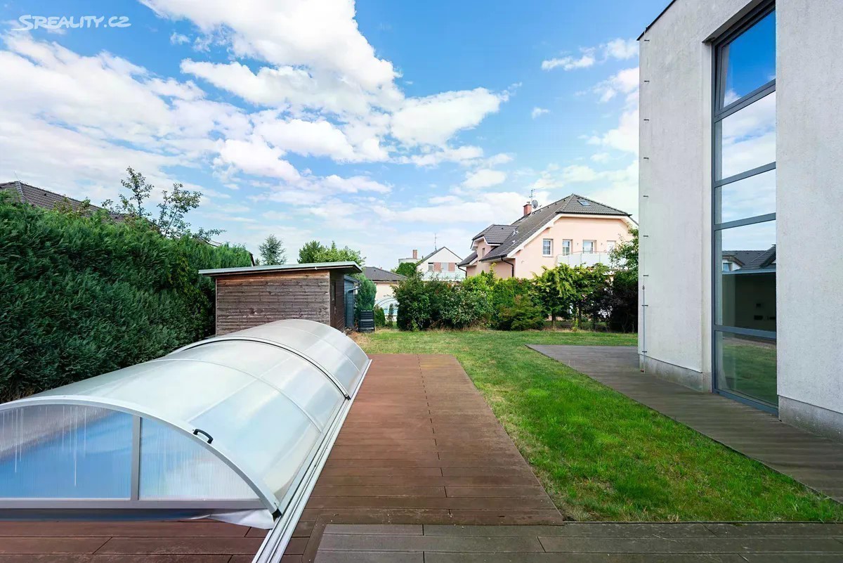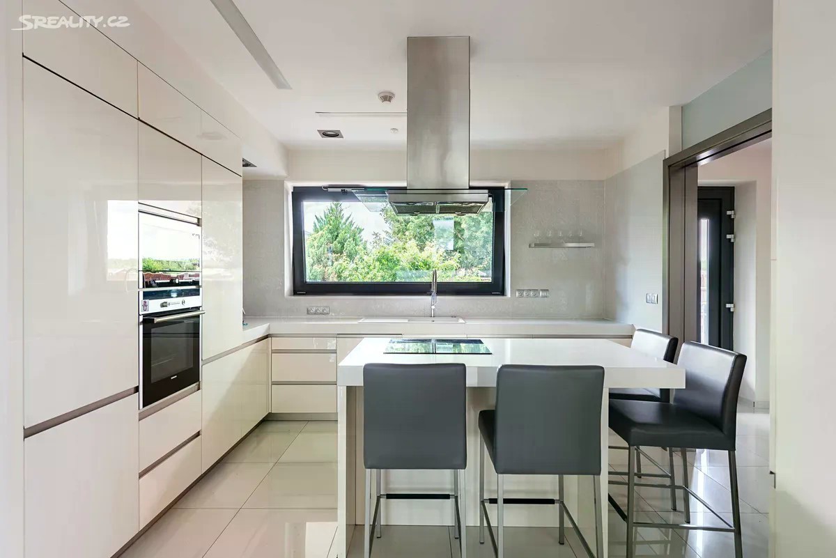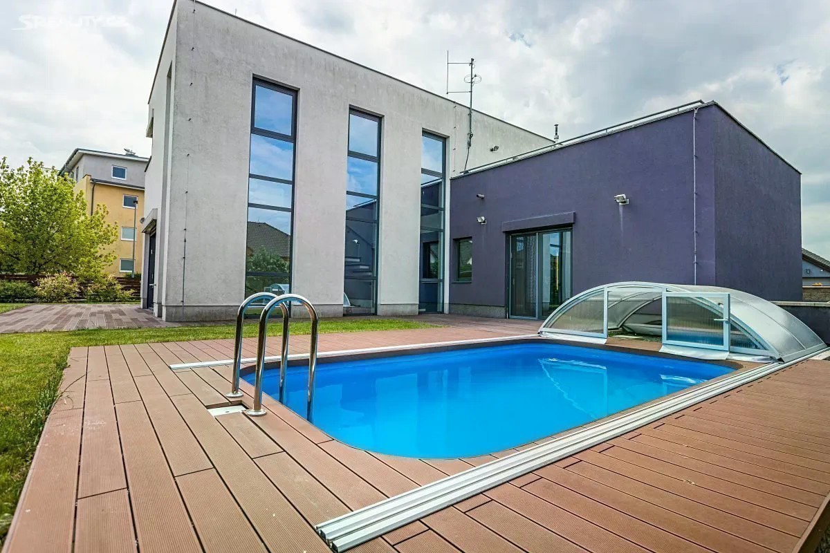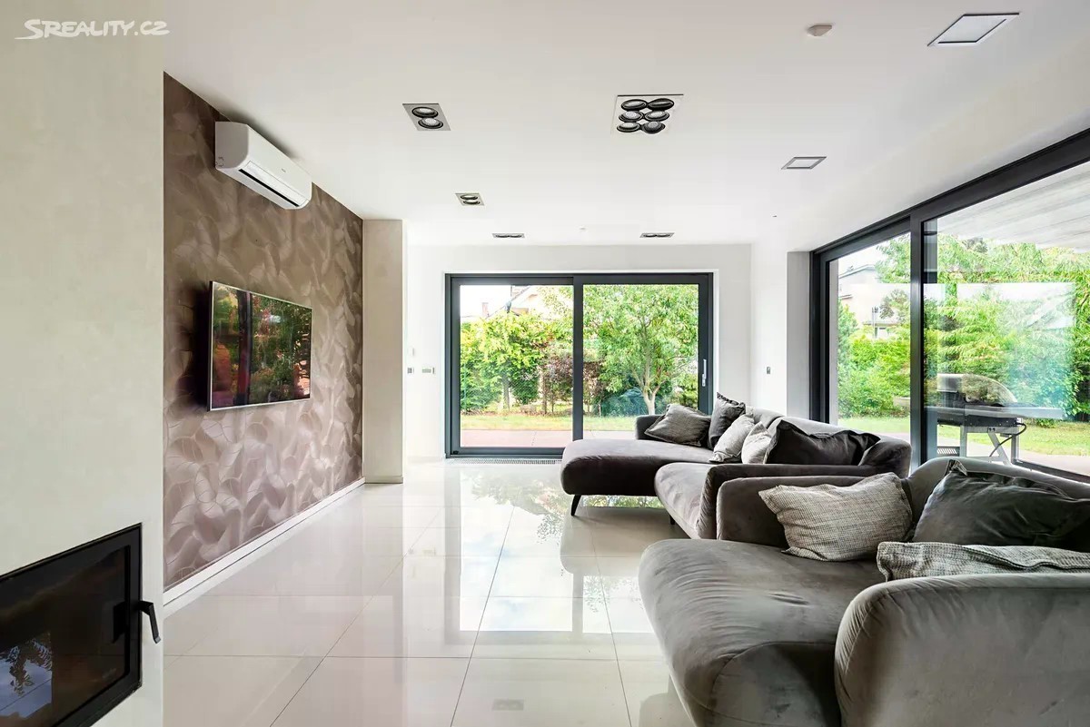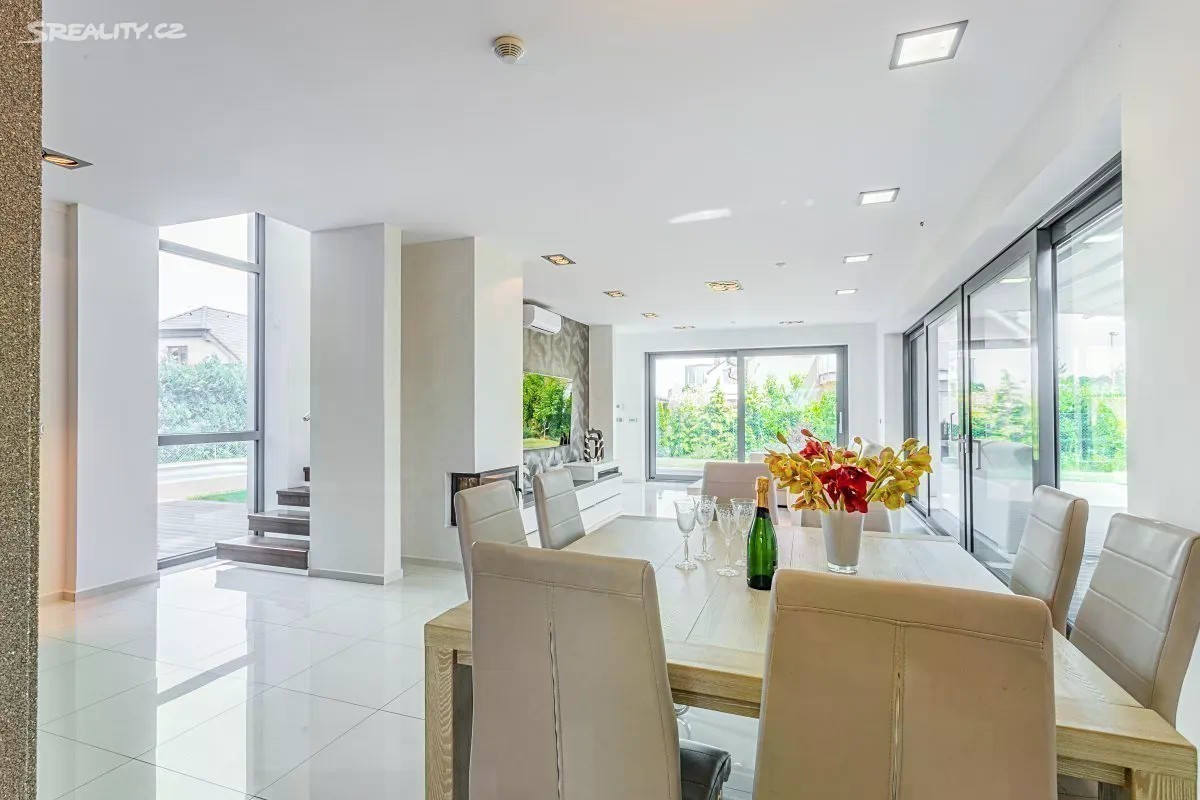 Nabízíme zcela výjimečný moderní rodinný dům určený pro bydlení i podnikání, nacházející se v útulné části Prahy - Kbely. Tento dům je zvláštní především svým velkorysým rozměrem, 392 m2 podlahové plochy, extrémně praktickou dispozicí ve dvou nadzemních podlažích a prostorným suterénem, který má díky nadměrnému anglickému dvorku plno denního světla. Dům je umístěn jen pár kroků od Lesoparku Letňany, v oblasti s ukončenou zástavbou. Ve vstupním poschodí domu se nachází prostorný obývací pokoj s kuchyní a krbem, šatna, toaleta pro hosty, garáž, sklad a v neposlední řadě prostorná hlavní ložnice s vlastní koupelnou a šatnou. Po elegantním dřevěném schodišti plném světla se dále dostanete do patra se čtyřmi ložnicemi, dvěma koupelnami, technickou místností, prádelnou a krásnou světlou terasou o velikosti 40 m2. Na podestě schodiště je navíc prostor využitelný jako TV koutek či herna. Suterén s vlastním vchodem zahrnuje kotelnu, sklad, kancelář a plnohodnotný byt 2+kk, vhodný např. pro příbuzné či chůvu. Na vzrostlé zahradě plné květin je terasa s pergolou přístupná z obývacího pokoje, bazén a zahradní domek. Celý dům je technologicky a materiálově velmi dobře vybaven. Na všech oknech jsou hliníkové předokenní žaluzie, v 1.NP je klimatizace a v 2.NP příprava pro klimatizaci. Dům je připojen na obecní vodovod a kanalizaci, vytápěn je vlastním plynovým kotlem. Na vnitřním vybavení domu byly také použity velmi kvalitní materiály, jako pravý mramor, masivní dřevo a velmi kvalitní italské obklady a dlažby. Dům je prodáván včetně osvětlení a vestavného nábytku na míru, volně stojící nábytek může být v domě ponechán po dohodě. Městská část Praha - Kbely je ideální pro rodinný život, sport i denní dojíždění do centra Prahy. V docházkové vzdálenosti je mnoho zeleně, ať už zmiňovaný Lesopark Letňany, tak i park Havraňák nebo Kbelský prales. Dojezd do centra Prahy autem trvá do 30 minut autem i MHD, OC Letňany a dvě stanice metra jsou vzdáleny cca 8 minut. V Kbelech je také stanice vlaku, který může představovat příjemnou dopravní alternativu. Kbely jsou příjemnou a soběstačnou částí Prahy s dostatkem škol a každodenních služeb, jako jsou obchody, restaurace a ordinace lékařů.