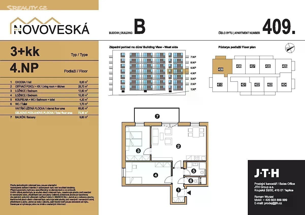 Dny otevřených dveří Nenechte si ujít příležitost podívat se do ukázkového bytu projektu Byty Novoveská a vybrat si byt přesně podle Vašich představ. Budeme se těšit na Vaši návštěvu. v pátek *********: 00 - 18:00 hodin a v sobotu *********: 00 - 14:00 hodin. Preferujeme předchozí telefonické objednání vybraného termínu na + *********. Nicméně vítáni budete všichni. Naši profesionální prodejci vám podají podrobné informace a zodpoví vaše dotazy, abyste si mohli vybrat byt dle vašich představ a pocitů. Byty Novoveská Splňte si svůj sen o klidném rodinném bydlení! Projekt je zkolaudovaný a byty v něm jsou připravené k nastěhování ihned. Představujeme Vám nové bydlení v jedné z nejklidnějších částí Teplic. Lokalita se nachází na ulici Novoveská nedaleko Řetenického lesoparku i proslulého věžového vodojemu se snadnou a výbornou dostupností do centra města. Je známá jako oáza klidu a vyhledávané místo oddechu. Samotná výstavba začala v únoru 2022. Novoveská sestává ze dvou sedmipatrových domů A a B a jednoho šestipatrového domu C. Projekt nabízí k prodeji 197 bytových jednotek, výrazně v něm převažují byty s dispozicí 2+kk (velikosti od 45,80m² do 59,80m² ), dále byty s dispozicí 3+kk (velikosti od 61,70m² do 72,60m² ) a tři unikátní byty 4+kk pro maximální pocit soukromí. Vnitřní řešení bytových jednotek odpovídá moderním trendům v bydlení. Propojení obývací části s kuchyňskou nabízí větší variabilitu prostor a možnost uplatnit originální řešení. Výsledný otevřený prostor je působivý, vzdušný a jednotliví členové rodiny tak mohou být stále pohromadě. Standardy vybavení bytů jsou na nejvyšší úrovni. Spolupracujeme výhradně s dlouhodobými, osvědčenými partnery a vybíráme kvalitní výrobky a materiály. V interiéru jsou použité velkoformátové obklady a dlažby španělské designové značky Porcelanosa, sanita je od společnosti Ideal Standard a dřevěné dveře italského výrobce Garofoli. Součástí každého bytu je balkón, který přináší do interiéru dostatek denního světla. V podzemí domu je k dispozici jednopodlažní garáž pro pohodlné parkování a sklepní kóje. Samozřejmostí je dostatečný počet venkovních parkovacích stání v uzavřeném areálu. Majestátní kopce v dáli dávají zapomenout ruchu lázeňského města pod Vámi a nabízí překrásné a působivé výhledy na Krušné hory, hrad Doubravku a Komáří vížku. I pro Vás se může Novoveská stát milovaným místem a domovem. Byty Novoveská - začněte nový příběh vašeho života!