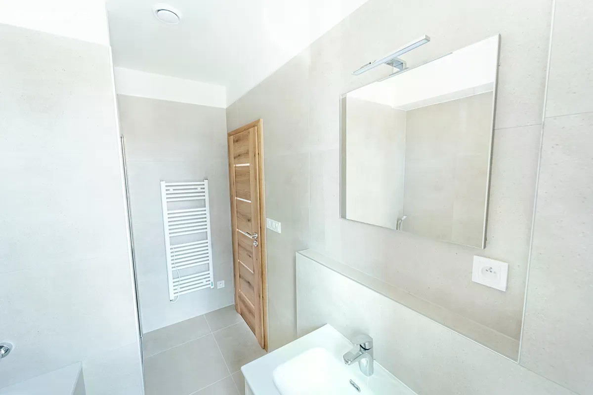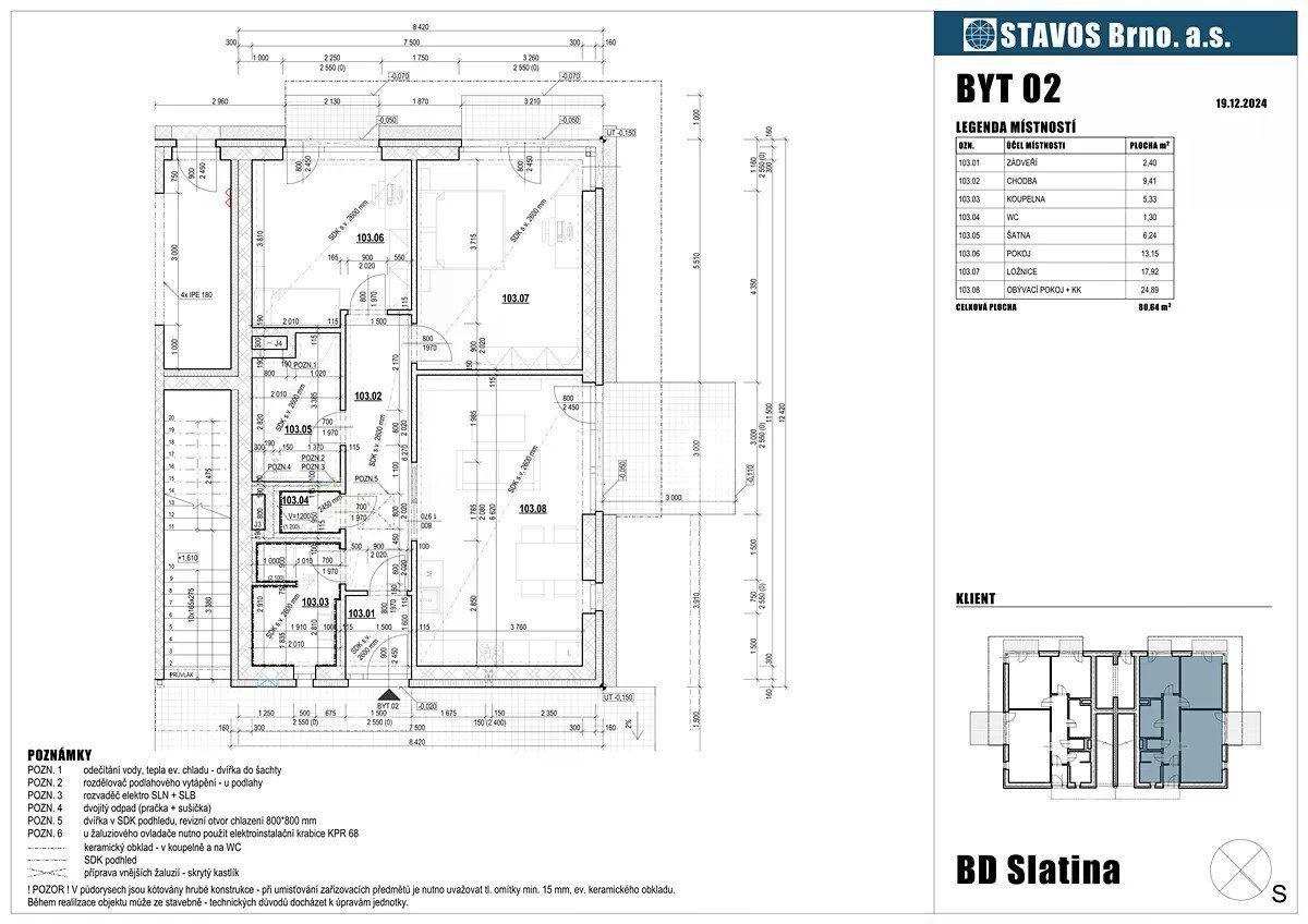 IHNED K NASTĚHOVÁNÍ Nabízíme k prodeji novostavbu bytu 3+kk v Brně-Slatině, ul. Ondřeje Veselého. Byt je součástí bytového domu, který je osazen v klidné zástavbě rodinných domů a má pouze 6 bytů. Je ideální pro ty, kteří hledají klidné místo k bydlení v blízkosti veškeré potřebné občanské vybavenosti. Jedná se o cihlovou stavbu v osobním vlastnictví, která nabízí komfortní užitnou plochu 81 m² a zahrádku o rozloze 229 m², která poskytuje dostatek prostoru pro relaxaci. Dispozice bytu je řešena jako 3+kk. Byt se skládá ze zádveří, chodby která zpřístupňuje všechny další místnosti : obývací pokoj s kuchyní, ložnici, pokoj, komoru, samostané WC a koupelnu. Technologicky je byt vybaven v duchu posledních trendů podlahové vytápění a chlazení zásobuje tepelné čerpadlo, součástí jsou i venkovní elektrické žaluzie. Kouplena má osazenou vanu, sprchový kout, umyvadlo s nábytkem a zrcadlem. Na Wc je instalované závěsné WC a umývátko. V komoře potom najdete přípravu pro pračku a sušičku. Parkování je zajištěno dvěma parkovacími místy, takže starost o místo pro Vaše vozidla můžete pustit z hlavy. Dostupnost dopravy je výborná - byt je v blízkosti vlaku, dálnice, silnice, MHD i autobusové linky, což zajišťuje pohodlnou dostupnost v rámci města i mimo něj.