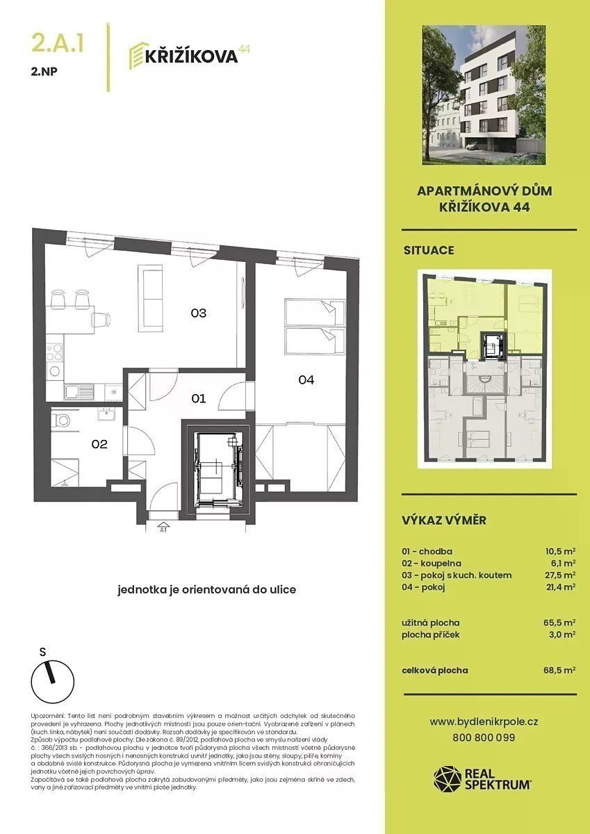 Ve výhradním zastoupení investora nabízíme k prodeji novostavbu ubytovací jednotky (apartmán) s dispozicí 2+kk. Prostorný a nadstandardně vybavený apartmán je vhodný pro trvalé bydlení nebo jako ideální příležitost ke koupi investiční nemovitosti. Možnost financování pomocí hypotečního úvěru. O projektu: Moderní, urbanistické, avšak praktické, tak by se dal popsat projekt Křižíkova 44, jenž navrhl architekt Martin Bukolský. Dominantou je určitě jeho velká prosklená plocha domu, což příjemně a útulně prozáří celý apartmán slunečným svitem. Projekt má především spojovat aspekty moderního bydlení jdoucí spolu ruku v ruce se vzhledem starší tradiční zástavby typickou pro brněnskou předměstskou část Královo pole. Jedná se o celkem pětipodlažní budovu, přičemž na každém patře se nachází 3 plně vybavené apartmánové jednotky a ke každé z nich náleží i sklepní kóje. Nesporným bonusem je privátní parkování ve vnitrobloku, kdy k jednotce je přiděleno parkovací stání za povinný příplatek. Lokalita: Jak už název projektu napovídá, apartmány se nachází na ulici Křižíkova, tj. v brněnské předměstské části Královo Pole (lidově přechylovaná jako Krpole). Tato čtvrť je známá svou příjemnou atmosférou a nabízí tak klidnější životní styl oproti rušným centrálním městským částem. Dispozice apartmánu: chodba (10,5 m²), obývací pokoj s kuchyňským koutem (27,5 m²), pokoj (21,4 m²), koupelna s WC (6,1 m²), sklep