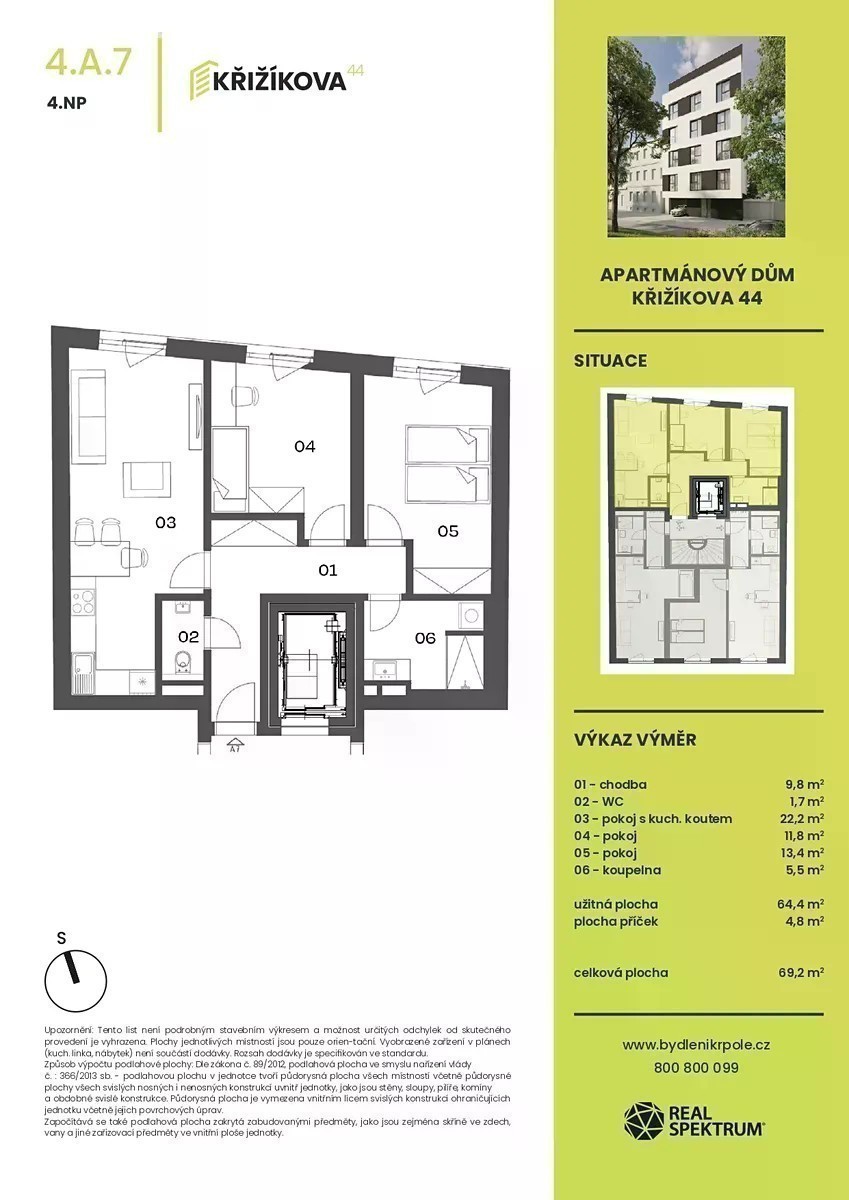 Ve výhradním zastoupení investora nabízíme k prodeji novostavbu ubytovací jednotky (apartmán) s dispozicí 3+kk. Prostorný a nadstandardně vybavený apartmán je vhodný pro trvalé bydlení nebo jako ideální příležitost ke koupi investiční nemovitosti. O projektu: Moderní, urbanistické, avšak praktické, tak by se dal popsat projekt Křižíkova 44, jenž navrhl architekt Martin Bukolský. Dominantou je určitě jeho velká prosklená plocha domu, což příjemně a útulně prozáří celý apartmán slunečným svitem. Projekt má především spojovat aspekty moderního bydlení jdoucí spolu ruku v ruce se vzhledem starší tradiční zástavby typickou pro brněnskou předměstskou část Královo pole. Jedná se o celkem pětipodlažní budovu, přičemž na každém patře se nachází 3 plně vybavené apartmánové jednotky a ke každé z nich náleží i sklepní kóje. Nesporným bonusem je privátní parkování ve vnitrobloku, kdy k jednotce je přiděleno parkovací stání za povinný příplatek. Lokalita: Jak už název projektu napovídá, apartmány se nachází na ulici Křižíkova, tj. v brněnské předměstské části Královo Pole (lidově přechylovaná jako Krpole). Tato čtvrť je známá svou příjemnou atmosférou a nabízí tak klidnější životní styl oproti rušným centrálním městským částem. Dispozice apartmánu: chodba (9,8 m²), obývací pokoj s kuchyňským koutem (22,2 m²), pokoj (13,4 m²), pokoj (11,8 m²), koupelna (5,5 m²), WC (1,7 m²), sklep