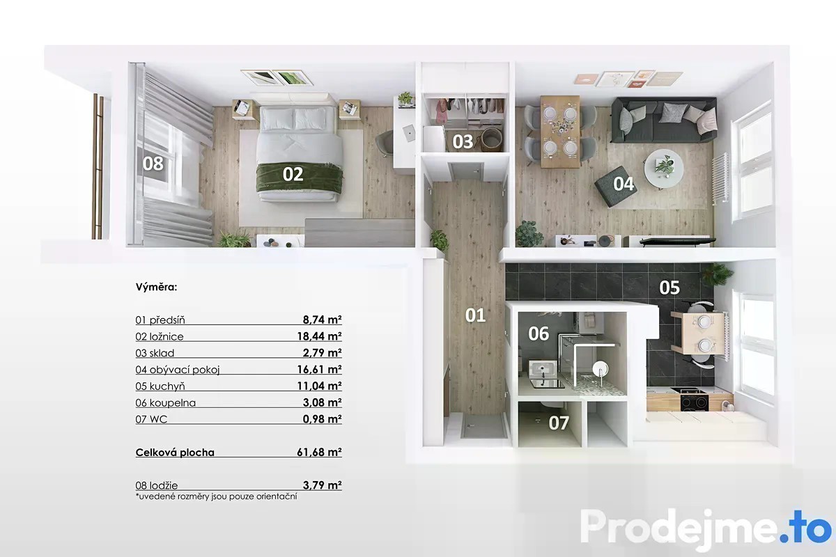 Představuji vám byt 2+1, který vyniká prostorností a čistým moderním vzhledem, který dostal díky proběhlé rekonstrukci. + 2+1 + 66,3 m2 + po celkové rekonstrukci + sklepní kóje 1,45 m2 + lodžie + výtah + plastová okna se žaluziemi + ihned k nastěhování + krásný výhled na Brno + samostatné vstupy do pokojů Vše zásadní už je tady hotové. Byt 2+1 o ploše 66,3 m2 včetně lodžie prošel rekonstrukcí, během které byly udělané opravy vnitřních omítek, nové rozvody elektřiny, nové jádro, nové podlahy (kvalitní plovoucí podlaha + dlažba), nové vnitřní dveře s obložkami i nové bezpečnostní vstupní dveře. Na vás zůstává už jen výběr kuchyňské linky podle vašeho vkusu. Byt sestává z prostorné předsíně s místem pro vestavěnou skříň, kuchyně s přípravou na kuchyňskou linku, pokoje, ložnice se vstupem na lodžii, koupelny se sprchovým koutem a samostatného WC se závěsnou toaletou. Jistě oceníte také praktickou komoru o velikosti 2,79 m2, která může posloužit i jako šatna. Skladovací prostory zajišťuje sklepní kóje. K využití je i společná kočárkárna s kolárnou. Oba pokoje disponují vlastními vstupy, což dělá z tohoto bytu také zajímavou investiční příležitost pro budoucí pronájem. Byt vás potěší také příjemnými výhledy na Špilberk i Petrov z kuchyně a pokoje. Z lodžie si můžete užívat pohled na Židenický kopec. Byt leží v 9. patře z celkových 13 a bytový dům je po kompletní revitalizaci. Pro větší pohodlí obyvatel jsou zde k dispozici 2 výtahy. Průkaz energetické náročnosti budovy je kategorie C - úsporná. Měsíční náklady na bydlení jsou ve výši 4 861 Kč (z toho 1 280 Kč fond oprav) + zálohy na elektřinu a plyn. Nastěhování je možné ihned. Přímo u domu je supermarket Albert a zastávka tramvaje, autobusu i trolejbusu. V těsném sousedství najdete také mateřské i základní školy. Zaujal vás tento byt a chtěli byste ho poznat blíže? Rád vás přivítám na společné prohlídce. Kontaktujte mě i v případě dodatečných dotazů. S financováním vám pomohou naši specialisté na hypoteční úvěry.