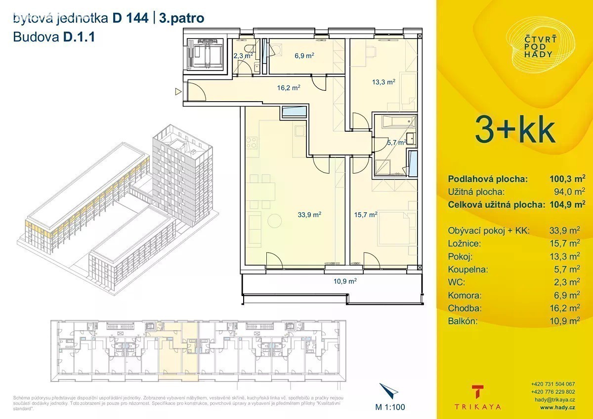 Bydlete v zelenomodré Čtvrti Pod Hády s vlastní vybudovanou občanskou vybaveností. Centrem a srdcem čtvrti bude náměstí navržené jako místo pro trhy, kulturní a společenské akce. Kolem se budou nacházet komerční prostory určené pro obchody a služby. Představujeme Vám tento moderní byt 3+kk č. D 144 k prodeji nacházející se v atraktivní lokalitě města Brna. Byt je prodáván ve družstevním vlastnictví s možností převodu do osobního vlastnictví, což Vám nabízí flexibilní možnosti, jak s nemovitostí naložit. Minimální členský vklad je 20% z kupní ceny. Tato elegantní novostavba cihlového domu bude dokončena v roce 2026 a nachází se ve 3. podlaží. Pro větší pohodlí obyvatel je zde k dispozici výtah, který usnadňuje přístup do všech pater. Byt má jednopodlažní uspořádání s podlahovou plochou 100,3 m², což zajišťuje dostatek prostoru jak pro osobní relaxaci, tak pro klidný pobyt celé rodiny. K bytu náleží i balkón o rozloze 10,9 m², který nabízí prostor pro venkovní posezení a relaxaci s výhledem na okolí. V bytě je již provedena předpříprava na klimatizaci. Důležitým aspektem tohoto bytu je jeho energetická účinnost, kterou dokládá průkaz energetické náročnosti třídy A. Pohodlné a bezstarostné parkování zajistí parkovací místa v krytých garážích, které se budou nacházet ve společných podzemních podlažích, současně se sklepními kójemi. Technické parametry projektu: Nosné konstrukce a obvodové zdivo - železobetonové stěny (tl. 300 mm) a vápenopískové velkoformátové tvárnice (tl. 240 mm) Tepelná izolace - desky z minerální vlny (tl. 200 mm a 180 mm) Okna - izolační trojsklo s celoobvodovým kováním, otevíravě sklopná Vytápění: Teplovodní Projekt nevzniká na zelené louce, ale vyrůstá na ploše revitalizovaného brownfieldu po nikdy nezprovozněné továrně Ergon a recykluje část materiálů z demolice areálu. Ekologičnost projektu vyniká především zelenými střechami osazenými fotovoltaickými panely, inovativním systémem na udržení vody v krajině díky retenčním nádržím, včetně pečlivého výběru suchomilné zeleně s minimálními nároky na spotřebu vody. Součástí projektu jsou nabíjecí stanice pro elektromobily a energeticky nenáročné osvětlení. Čtvrť Pod Hády je situována v městské části Brno - Maloměřice a Obřany. Je dostupná autem z ulice Jedovnická a městskou hromadnou dopravou ze zastávky Zimní. Velkou výhodou je napojení lokality na Velký městský okruh, které zaručí snadné dojíždění. Nejbližší okolí nabízí hustou síť turistických tras, cyklotras a oblíbené horolezecké terény v Moravském krasu. Pro více informací nebo sjednání prohlídky nás prosím kontaktujte.
