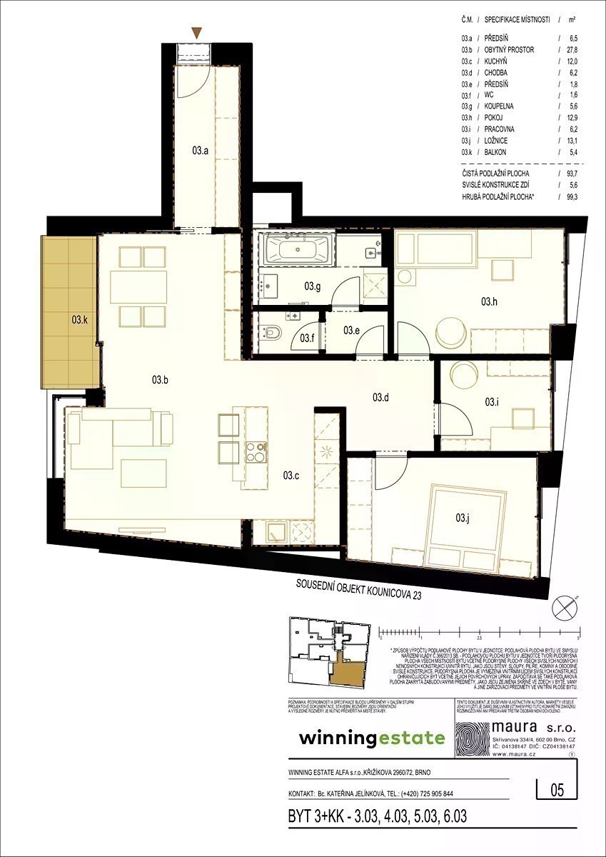 Představujeme Vám exkluzivní jednotku z developerského projektu Slovákova 12, která nabízí klid, komfort i moderní technologie s veškerou občanskou vybaveností na dosah ruky. Skvělé dopravní spojení a blízkost parků, divadel i restaurací zaručují jedinečný životní styl. Jednotka 5.03 má 99,3 m2, nachází se v 5. nadzemním podlaží a disponuje balkonem o výměře 5,4 m2 orientovaným do vnitrobloku na jihozápad. Součástí vybavení jednotky je i sklepní kóje (2,6 m2). Stejnou dispozici Vám můžeme nabídnout ve 6. NP dle aktuální dostupnosti. Cena jednotlivých jednotek se může lišit v závislosti na podlaží, ve kterém se nachází. Na základním vybavení jsme si dali skutečně záležet. Vybavení jednotky: o Balkon o výměře 5,4 m2 o Klimatizace v obytné místnosti o Podlahové vytápění, rekuperace o Domácí telefon, optický internet, STA o Vinylové podlahy, dlažba (60x120 cm) značky Dom Mun o Kvalitní sanita od Grohe a Villeroy & Boch o Sklepní kóje Společné prostory propojuje výtah od 2. PP po 9. NP. Parkování: Dvě podzemní patra s parkovacím stáním formou zakladačového systému. Garážové stání není součástí kupní ceny. Prodejní podmínky: Prodej probíhá přímo od developera bez provizních poplatků. S financováním Vám rádi pomůžeme. Pro více informací či sjednání termínu prohlídky nás prosím kontaktujte na níže uvedeném telefonním čísle nebo prostřednictvím kontaktního formuláře.