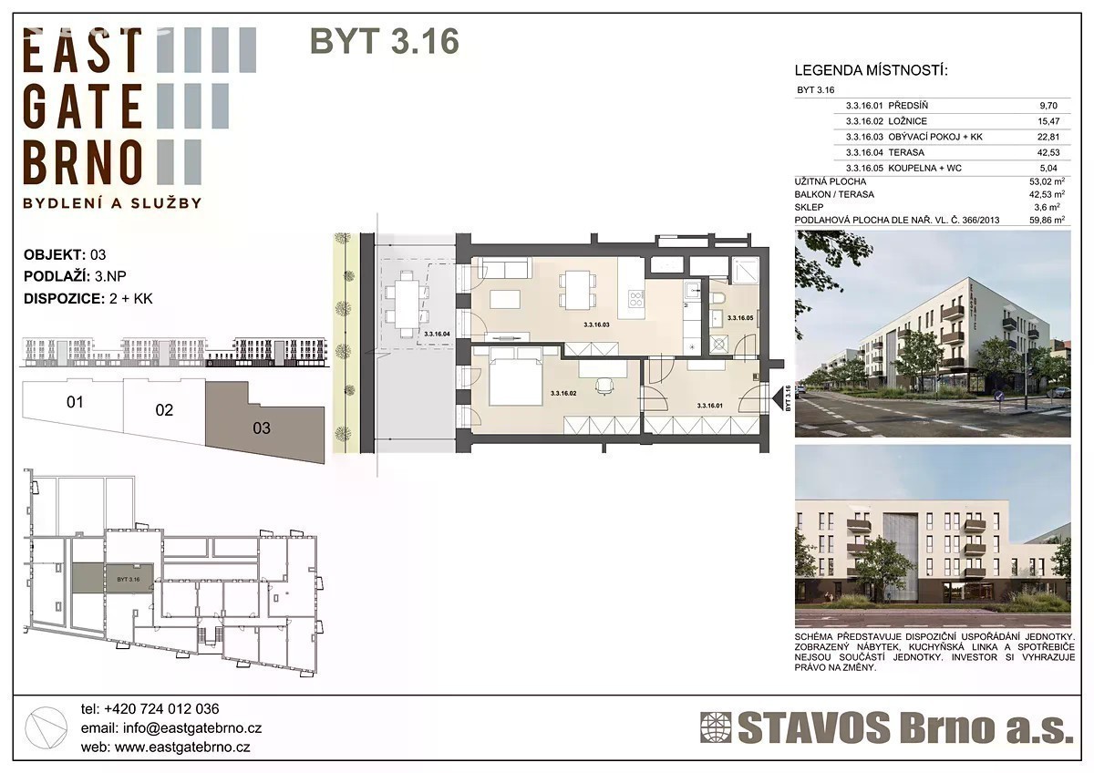V nově zahájené výstavbě projektu EASTGATE v Brně - Slatině při ulici Řípská nabízíme prodej krásného bytu s terasou. Jedná se byt 2+kk ve III.NP. Dům je vybaven výtahem. Každý pokoj má přístup na terasu (terasa 43 m2). Dispozice je řešena jako obývací pokoj s kuchyní (22,81 m2) a pokoje (15,47 m2), koupelna s WC (5,04 m2) a chodba (9,7 m2) s možností umístění vestavných skříní. Aktuálně se provádí základání stavby a tak je možné přizpůsobit si byt vlastním požadavkům v rámci klientských změn. V případě zájmu nás kontaktujte pro další informace.