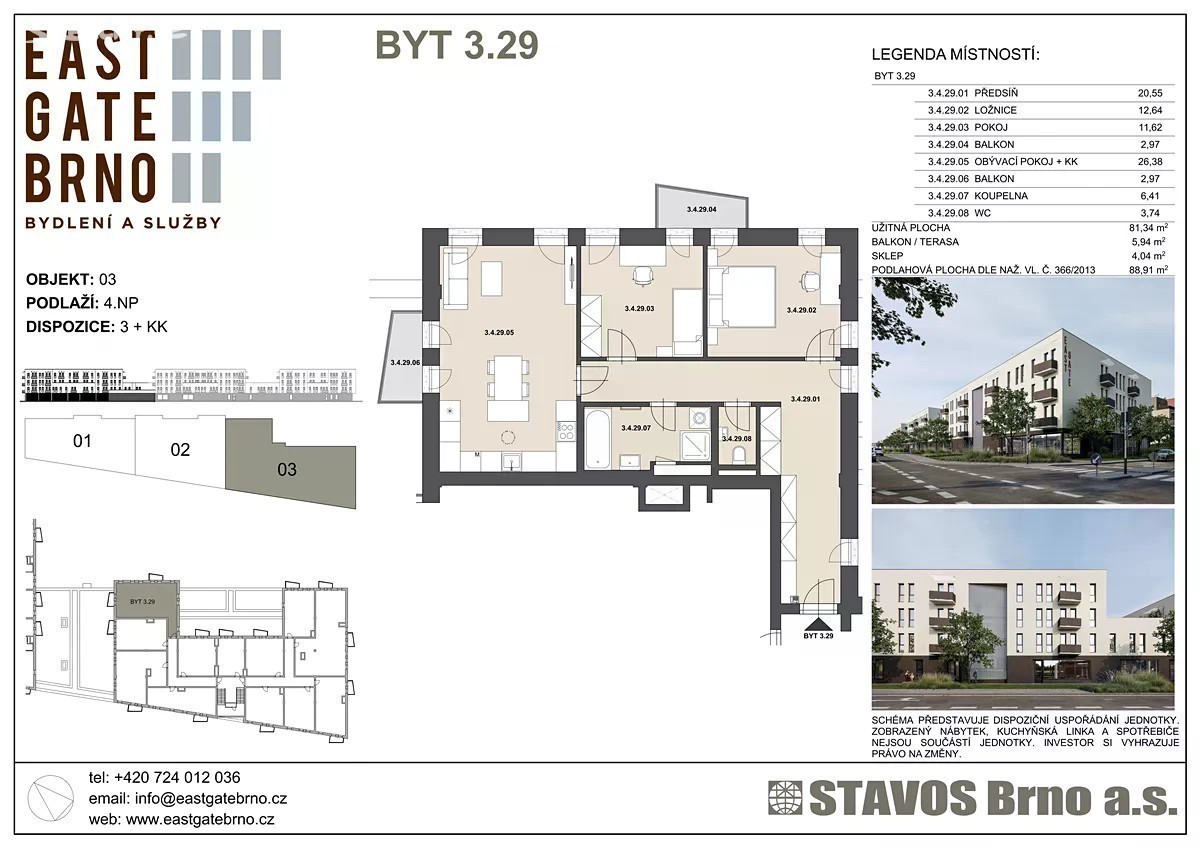 Prodej bytu v nově zahájeném projektu EASTGATE v Brně - Slatině při ulici Řípská. Jedná se o byt 3+kk umístěný ve IV. NP. Výtah je samozřejmě k dispozici. Byt je prostorný a každý pokoj má přístup na balkon (2 x 2,97 m2). Dispozice je řešena jako obývací pokoj s kuchyní (26,38 m2) a dále dva samostatné pokoje (12,64 + 11,62 m2), koupelna (6,41 m2), samostatné WC (1,87m2) a velmi prostorná chodba (20,55 m2) s možností umístění vestavných skříní. Aktuálně se provádí základání stavby a tak je možné přizpůsobit si byt vlastním požadavkům v rámci klientských změn. V případě zájmu nás kontaktujte pro další informace.