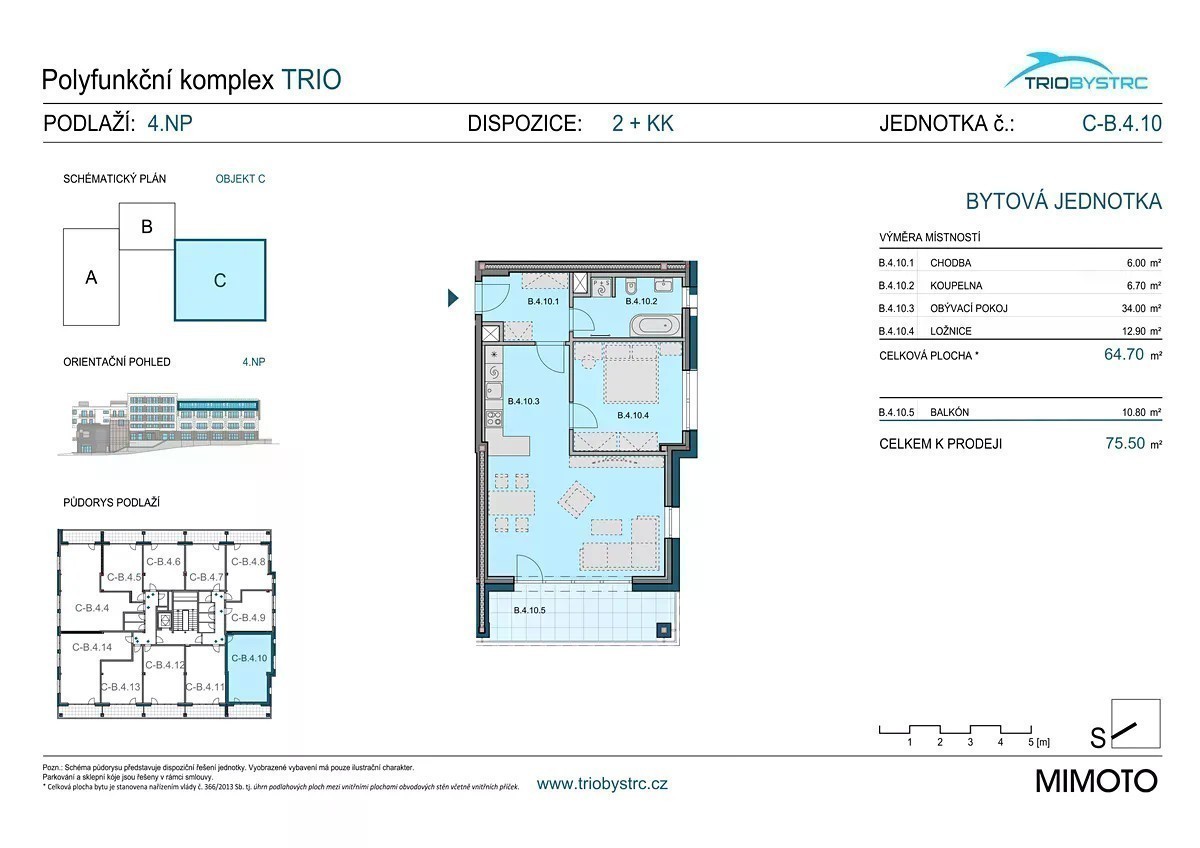 Objevte Váš nový domov v Bystrci! Dovolujeme si Vám nabídnout prosvětlený moderní byt s dispozicí 2+kk o celkové ploše 64,7 m² s lodžií (10,8 m²) a výhledem na Bystrc. Tento byt se skládá z prostorného obývacího pokoje s kuchyňským koutem, kde se nachází vstup na lodžii. Dále jsou součástí bytu prostorná ložnice, chodba, koupelna s vanou a toaletou. Vybavení zahrnuje vysoký standard sanitou Villeroy & Boch a velkoformátové obklady italské společnosti IMOLA. Podlahové vytápění, lokální rekuperace vzduchu (výměna vydýchaného vzduchu za přiváděný čerstvý vzduch z venku při zajištění energeticky efektivního zadržení tepla uvnitř bytu), chlazení během horkých letních dnů a příprava pro předokenní žaluzie Vám poskytnou dokonalý komfort bydlení po celý rok. Energeticky úsporný a ekologický domov. Celý objekt TRIO Bystrc je v kategorii A, což znamená mimořádně energeticky a provozně úspornou budovu. Fotovoltaické panely efektivně využívají sluneční energii, zatímco tepelná čerpadla zajišťují teplou vodu a celoroční tepelný komfort (v letním období chlazení a vytápění během chladných dnů). Tento byt se nachází ve 4. NP budovy C. K dispozici je dostatek parkovacích stání (venkovní nebo vnitřní) a skladovací kóje přímo vedle bytu. Skvělá lokalita pro rodiny a aktivní styl života. Projekt se nachází v srdci moderní a živé městské části Bystrc. Díky výborné občanské vybavenosti a ideální poloze je tato oblast perfektní pro rodiny s dětmi, sportovce i milovníky přírody. Bystrc nabízí dostatek obchodů, polikliniku, školy a školky, stejně jako nespočet možností pro sportovní vyžití v nádherném okolí plném zeleně. Bystrc, klidná část Brna, se nachází v dosahu Brněnské přehrady, Údolí Oddechu, zoologické zahrady, hradu Veveří a obory Holedná. Jen málokterá část města nabízí tak široké a různorodé možnosti pro rekreaci a aktivní životní styl. Zjistěte více a rezervujte si svůj nový domov! Navštivte naše webové stránky a vyberte si Váš vysněný byt nebo kancelář! Rádi Vám poskytneme všechny potřebné informace na osobním setkání. Prodej zajišťuje přímo developer, což znamená, že neplatíte žádnou provizi ani poplatky za zprostředkování. Dokončení projektu je naplánováno na Q1/2027.