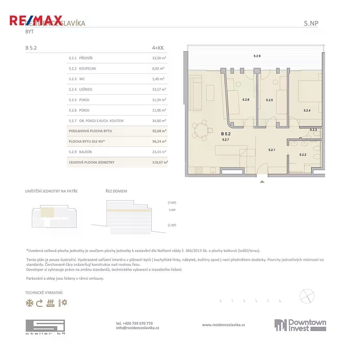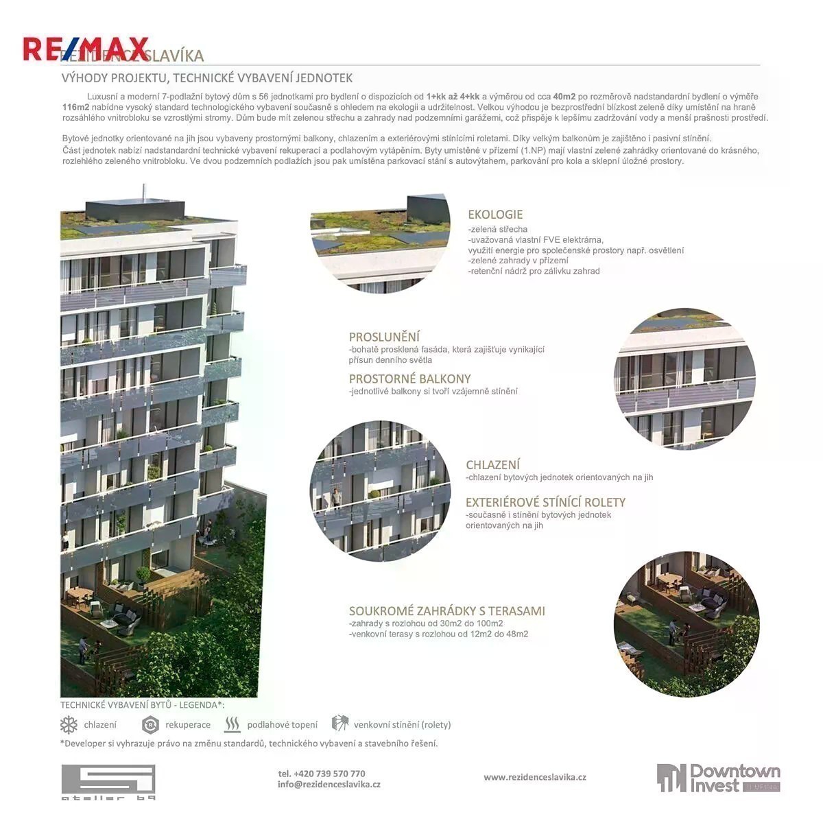 Výstavba zahájena v srpnu 2025. V rámci předprodeje, po nabytí právní moci stavebního povolení Vám nabízíme byt 4+kk v exkluzivní lokalitě na ulici Antonína Slavíka. Luxusní a moderní 7-podlažní bytový dům s 56 jednotkami pro bydlení o dispozicích od 1+kk až 4+kk s výměrou od cca 40 m2 po rozměrově nadstandardní bydlení o výměře 116m2 nabídne vysoký standard technologického vybavení současně s ohledem na ekologiia udržitelnost. Velkou výhodou je bezprostřední blízkost zeleně díky umístění na hraně rozsáhlého vnitrobloku se vzrostlými stromy. Díky velkým balkonům je zajištěno i pasivní stínění u bytů do zahrady. Byt se skládá z předsíně s možností vestavěných skříní, koupelny se sprchovým koutem, toaletou, bidetem a dvěma umyvadly, obývacího pokoje s kuchyňským koutem a terasou s nádherným výhledem do klidného vnitrobloku, ložnice a dvou samostatných pokojů z přístupem na terasu. Novostavba moderního bytového domu Rezidence Slavíka, která vznikne v ceněné Brněnské čtvrti Černá Pole, na dohled od slavné vily Tugendhat, nabídne luxusní bydlení v centru města s krásným výhledem na Brněnské panorama s hradem Špilberk. Situováním nad jihozápadním svahem stavba nabídne působivý výhled na centrum města a hrad Špilberk. Na pozemku stály původně 2 historické bytové domy z 19.století, které byly zničeny při bombardování Brna v r. 1944. Realizací projektu Rezidence Slavíka pozemek opět ožije. Bydlení v centru Brna - lukrativní čtvrť Černá Pole Jedné z nejvíce ceněných čtvrtí, pouhých několik set metrů od slavné Vily Tugendhat a Vily Löw-Beer. Toto místo nabízí bohaté občanské vybavení - restaurace, kavárny, školy i kulturní vyžití. Klid a odpočinek v nedalekém parku Lužánky Největší Brněnský park se nachází doslova několik kroků od vchodu do rezidence. Působivý výhled Situováním nad jihozápadním svahem stavba nabídne výhled na centrum města a hrad Špilberk. Procházkou do centra Rezidence je situována v docházkové vzdálenosti historického centra skrze zástavbu z 19. století s bohatě zdobenými fasádami a zelenými vnitrobloky. Prostředí • bohaté prosklení s výhledy • prostorné balkony s pasivním stíněním jednotek na jižní fasádě • společně využitelná část zahrady ve vnitrobloku Komfort • vysoký standard bydlení • bezbariérový přístup, prostorný vstupní vestibul • chlazení bytových jednotek obrácených na jih • rekuperace ve většině jednotek • vybrané byty s podlahovým vyhříváním Vyřešené parkování • 2 podlaží podzemního parkování v objektu s autovýtahem • dostatek sklepních kójí Ekologie • navržena zelená střecha • uvažována vlastní FVE elektrárna Více informací Vám velmi rád poskytnu na osobní schůzce.