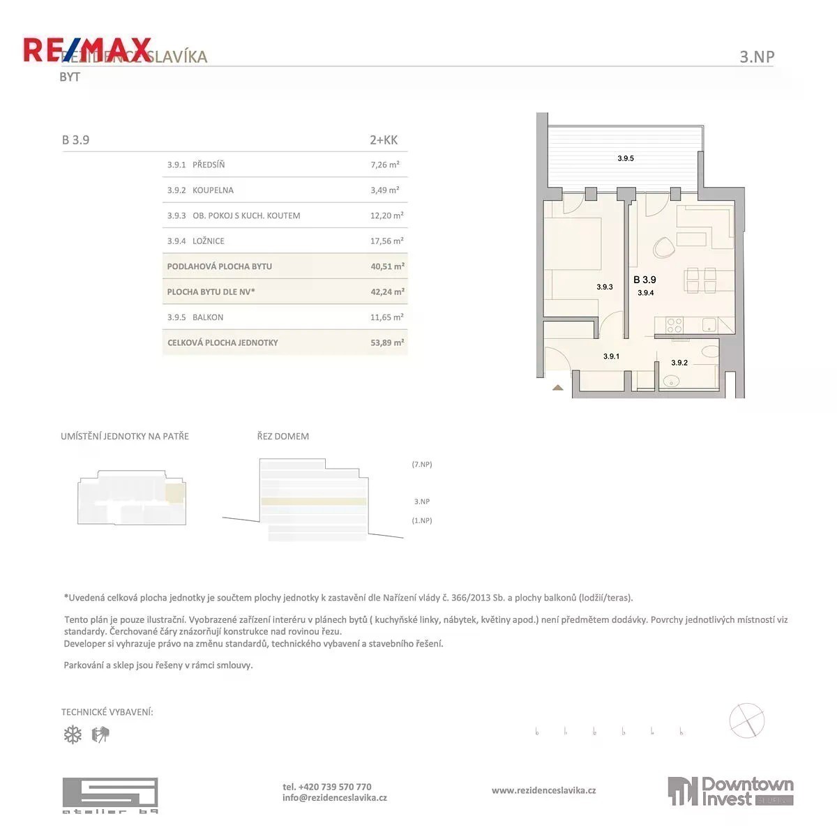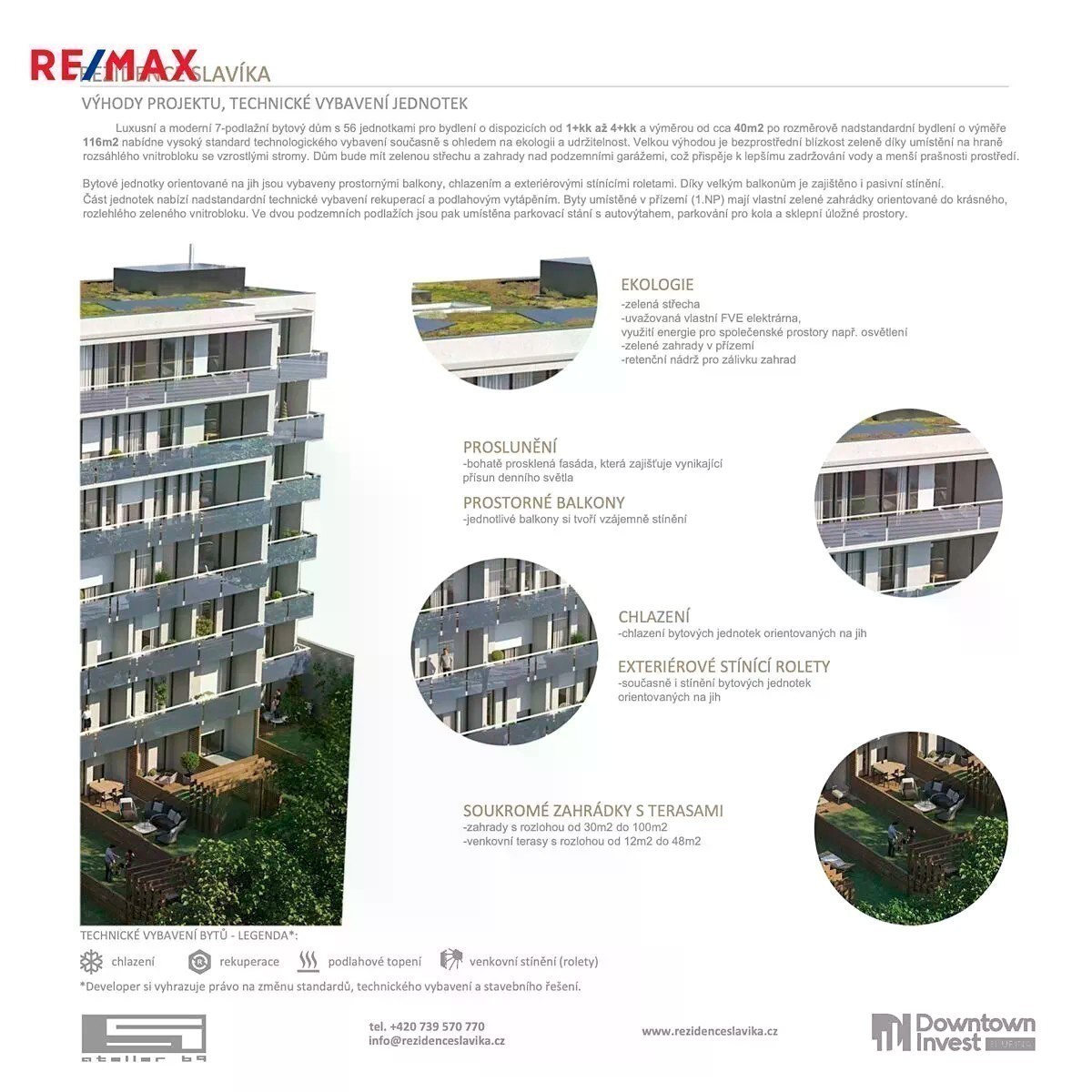 Výstavba zahájena v srpnu 2025. V rámci předprodeje, po nabytí právní moci stavebního povolení Vám nabízíme byt 2+kk v exkluzivní lokalitě na ulici Antonína Slavíka. Luxusní a moderní 7-podlažní bytový dům s 56 jednotkami pro bydlení o dispozicích od 1+kk až 4+kk s výměrou od cca 40 m2 po rozměrově nadstandardní bydlení o výměře 116m2 nabídne vysoký standard technologického vybavení současně s ohledem na ekologiia udržitelnost. Velkou výhodou je bezprostřední blízkost zeleně díky umístění na hraně rozsáhlého vnitrobloku se vzrostlými stromy. Díky velkým balkonům je zajištěno i pasivní stínění u bytů do zahrady. Byt se skládá z předsíně s možností vestavěných skříní a místa pro pračku a sušičku, koupelny se sprchovým koutem a toaletou, obývacího pokoje s kuchyňským koutem a terasou s nádherným výhledem do klidného vnitrobloku a ložnice. Novostavba moderního bytového domu Rezidence Slavíka, která vznikne v ceněné Brněnské čtvrti Černá Pole, na dohled od slavné vily Tugendhat, nabídne luxusní bydlení v centru města s krásným výhledem na Brněnské panorama s hradem Špilberk. Situováním nad jihozápadním svahem stavba nabídne působivý výhled na centrum města a hrad Špilberk. Na pozemku stály původně 2 historické bytové domy z 19.století, které byly zničeny při bombardování Brna v r. 1944. Realizací projektu Rezidence Slavíka pozemek opět ožije. Bydlení v centru Brna - lukrativní čtvrť Černá Pole Jedné z nejvíce ceněných čtvrtí, pouhých několik set metrů od slavné Vily Tugendhat a Vily Löw-Beer. Toto místo nabízí bohaté občanské vybavení - restaurace, kavárny, školy i kulturní vyžití. Klid a odpočinek v nedalekém parku Lužánky Největší Brněnský park se nachází doslova několik kroků od vchodu do rezidence. Působivý výhled Situováním nad jihozápadním svahem stavba nabídne výhled na centrum města a hrad Špilberk. Procházkou do centra Rezidence je situována v docházkové vzdálenosti historického centra skrze zástavbu z 19. století s bohatě zdobenými fasádami a zelenými vnitrobloky. Prostředí • bohaté prosklení s výhledy • prostorné balkony s pasivním stíněním jednotek na jižní fasádě • společně využitelná část zahrady ve vnitrobloku Komfort • vysoký standard bydlení • bezbariérový přístup, prostorný vstupní vestibul • chlazení bytových jednotek obrácených na jih • rekuperace ve většině jednotek • vybrané byty s podlahovým vyhříváním Vyřešené parkování • 2 podlaží podzemního parkování v objektu s autovýtahem • dostatek sklepních kójí Ekologie • navržena zelená střecha • uvažována vlastní FVE elektrárna Více informací Vám velmi rád poskytnu na osobní schůzce.