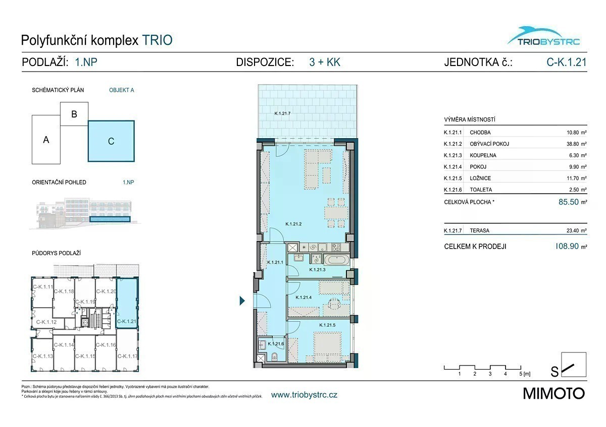 Objevte Váš nový domov v Bystrci! Dovolujeme si Vám nabídnout moderní jednotku orientovanou na jih s dispozicí 3+kk o ploše 108,9 m² s krásnou terasou (23,4 m²). Tato jednotka má prostorný obývací pokoj s kuchyňským koutem, který prosvětlují velkoformátová okna se vstupem na terasu. Dále jsou součástí bytu dvě ložnice, prostorná vstupní chodba, samostatná toaleta a koupelna s vanou. Vybavení zahrnuje vysoký standard sanitou Villeroy & Boch a velkoformátové obklady italské společnosti IMOLA. Podlahové vytápění, lokální rekuperace vzduchu (výměna vydýchaného vzduchu za přiváděný čerstvý vzduch z venku při zajištění energeticky efektivního zadržení tepla uvnitř bytu), chlazení během horkých letních dnů a příprava pro předokenní žaluzie Vám poskytnou dokonalý komfort bydlení po celý rok. Energeticky úsporný a ekologický domov. Celý objekt TRIO Bystrc je v kategorii A, což znamená mimořádně energeticky a provozně úspornou budovu. Fotovoltaické panely efektivně využívají sluneční energii, zatímco tepelná čerpadla zajišťují teplou vodu a celoroční tepelný komfort (v letním období chlazení a vytápění během chladných dnů). Tato jednotka se nachází v 1. NP budovy C. K dispozici je dostatek parkovacích stání (venkovní nebo vnitřní) a skladovací kóje přímo na patře. Skvělá lokalita pro rodiny a aktivní styl života. Projekt se nachází v srdci moderní a živé městské části Bystrc. Díky výborné občanské vybavenosti a ideální poloze je tato oblast perfektní pro rodiny s dětmi, sportovce i milovníky přírody. Bystrc nabízí dostatek obchodů, polikliniku, školy a školky, stejně jako nespočet možností pro sportovní vyžití v nádherném okolí plném zeleně. Bystrc, klidná část Brna, se nachází v dosahu Brněnské přehrady, Údolí Oddechu, zoologické zahrady, hradu Veveří a obory Holedná. Jen málokterá část města nabízí tak široké a různorodé možnosti pro rekreaci a aktivní životní styl. Zjistěte více a rezervujte si svůj nový domov! Navštivte naše webové stránky a vyberte si Váš vysněný byt nebo kancelář! Rádi Vám poskytneme všechny potřebné informace na osobním setkání. Prodej zajišťuje přímo developer, což znamená, že neplatíte žádnou provizi ani poplatky za zprostředkování. Dokončení projektu je naplánováno na Q1/2027.