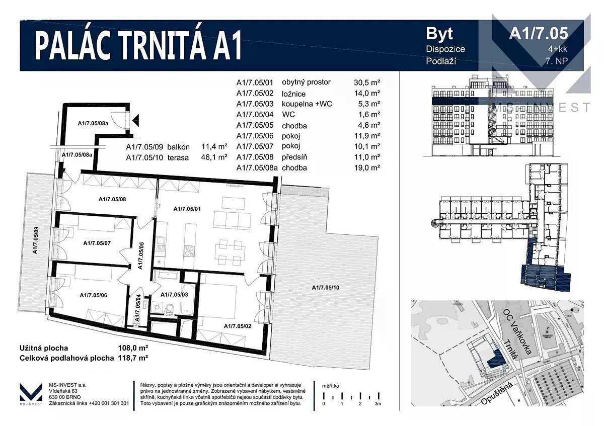 Nabízíme prodej novostavby bytu o dispozici 4+kk v 7. NP s velkorysou terasou a výhledem v nově vybudovaném developerském projektu Palác Trnitá, který najdete v hlavní rozvojové zóně města Brna, v těsném sousedství historického centra města Brna a NC Vaňkovka. Součástí bytu je vstupní chodba s možností umístění vestavěných skříní a vstupem na balkon orientovaný do vnitrobloku, obývací pokoj s kuchyňským koutem a vstupem na terasu, ložnice se vstupem na terasu, dva pokoje se vstupem na balkon, koupena, WC a sklep. K dokoupení garážové stání ve 2. PP domu. Ihned k nastěhování, domluvte si prohlídku.