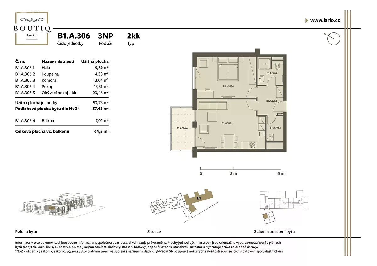 Nabízíme moderní byt o dispozici 2+kk v novém rezidenčním projektu LARIO s energetickou třídou A, který realizuje česká developerská skupina BOUTIQ. Projekt spojuje moderní architekturu, vysoký standard provedení a šetrný přístup k životnímu prostředí. Byt disponuje podlahovým vytápěním, rekuperací, nadstandardní světlou výškou stropu 2,8 m, dřevěnými podlahami a SMARTHOME technologií od společnosti Loxone. Ke každému bytu náleží balkon, terasa nebo předzahrádka a sklepní kóje. Parkovací stání v podzemní garáži je možné dokoupit, včetně místa s wallboxem pro elektromobil. Projekt využívá solární panely, což výrazně snižuje provozní náklady bytového domu a podporuje udržitelný způsob bydlení. Lokalita Dolních Měcholup nabízí klidné prostředí s výbornou dostupností do centra Prahy a plnou občanskou vybavenost. V docházkové vzdálenosti je škola, školka, obchody, zdravotní služby, sportoviště i přírodní parky s cyklostezkami. Součástí projektu je nově vznikající náměstí s obchody a službami, které přirozeně doplní občanskou vybavenost v této části Prahy.