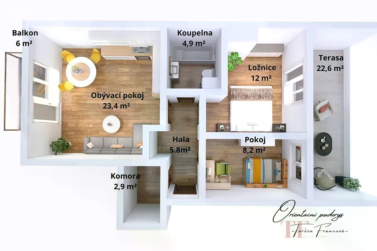 Nabízíme k prodeji světlý a útulný byt 3+kk o užitné ploše 57,2 m², který se nachází v nejvyšším (5.) patře moderního rezidenčního domu s výtahem v klidné části Prahy 9 - Čakovic. K bytu dále náleží prostorná terasa o výměře 22,6 m², balkón o velikosti 6 m², sklep 2,6 m² a garážové stání v suterénu domu. Dispozice a vybavení: Byt je ideálně řešený pro rodiny, páry i jednotlivce. Sestává z obývacího pokoje s plně vybaveným kuchyňským koutem (včetně sklokeramické desky, vestavěné lednice, myčky, granitového dřezu, mikrovlnné trouby), dvou samostatných ložnic, prostorné koupelny s vanou a místem pro pračku i sušičku, praktické šatny a předsíně. Byt je vybaven datovými zásuvkami a bezpečnostními prvky. Velkou výhodou je poloha v nejvyšším patře - díky tomu máte zajištěno absolutní soukromí, žádné sousedy nad hlavou a minimální pohyb na chodbě. Terasa a balkón: Hlavním lákadlem je rozlehlá terasa orientovaná do klidného okolí, která poskytuje prostor pro venkovní posezení, grilování, relaxaci i dětské hry. Balkón je přístupný přímo z obývacího pokoje a nabízí krásný výhled. Lokalita: Byt se nachází v žádané lokalitě s kompletní občanskou vybaveností - v pěší vzdálenosti je park Čakovice, nákupní centrum Globus, OC Letňany, školy, školky, lékaři i další služby. Skvělou dopravní dostupnost zajišťuje vlaková zastávka Praha-Čakovice a stanice metra Letňany (linka C). Do centra Prahy se dostanete za pár minut. Financování: V rámci financování je možné převzít stávající hypoteční úvěr ve výši 2 000 000 Kč s velmi výhodnou úrokovou sazbou 1,99 % fixovanou až do roku 2028. Součástí prodeje: Terasa 22,6 m² Balkón 6 m² Sklep 2,6 m² Kryté garážové stání Bydlení na Bermanově ulici v Čakovicích je ideální volbou pro všechny, kdo hledají moderní a pohodlné bydlení s výbornou dostupností do centra města, ale zároveň chtějí zůstat v klidné a zelené lokalitě vhodné pro rodinný život. Pro více informací či domluvení prohlídky mě neváhejte kontaktovat Mgr. Tereza Francová, vaše realitní makléřka