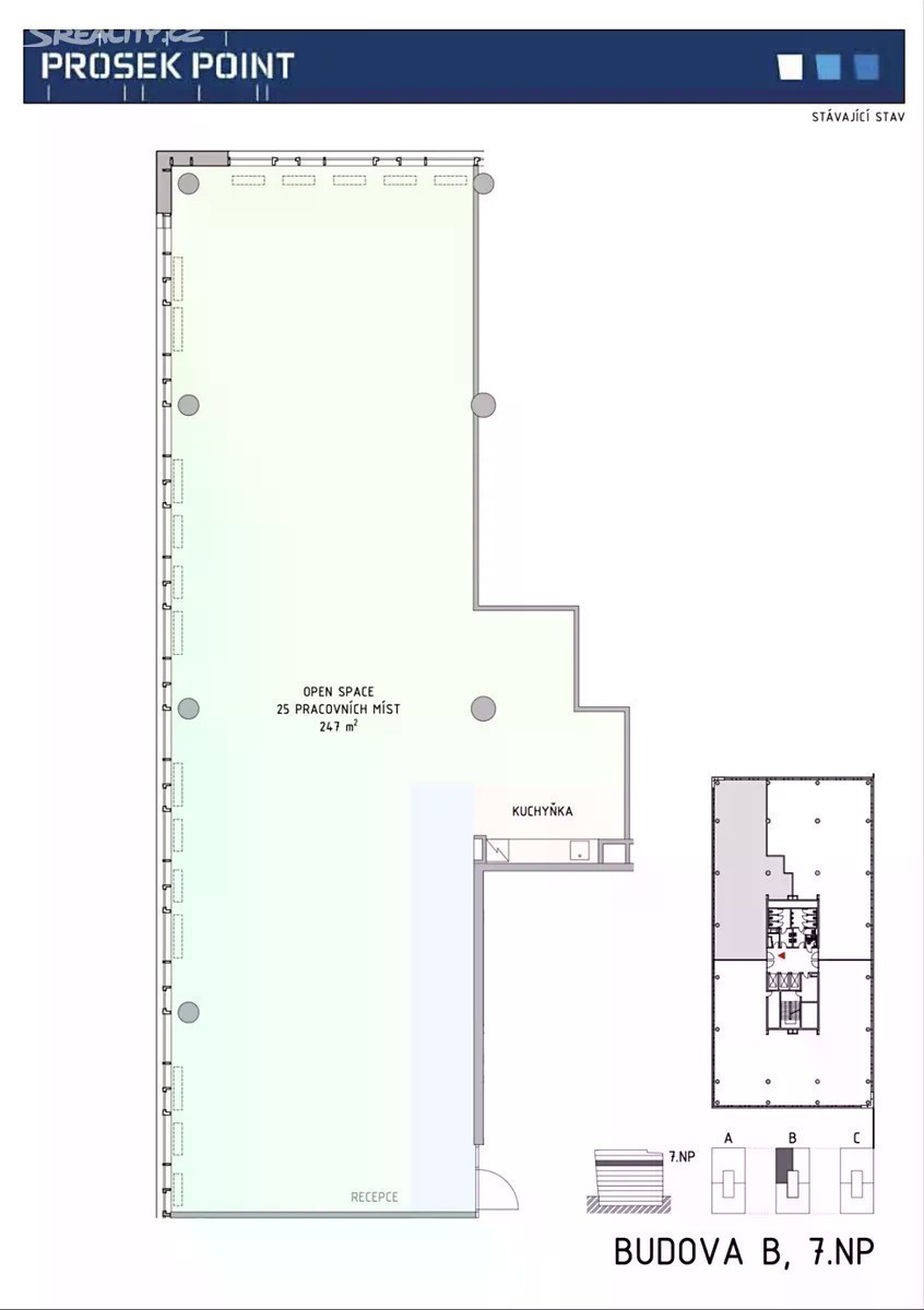 *Neplatíte provizi* Dovolujeme si vám nabídnout kancelářské prostory o velikosti 265 m2, které se nacházejí v budově Prosek Point na Praze 9. Jednotka je umístěna v 7.NP a dispozičně se jedná o open space až pro 25 pracovních míst a kuchyňku. V případě zájme lze prostory upravit dle požadavků budoucího nájemce. Administrativní centrum Prosek Point je tvořeno třemi samostatnými osmipatrovými budovami, které nabízí až 26 200 m² kancelářských a obchodních ploch. Budova má 8 nadzemních a 2 podzemní podlaží, v prostorách jsou otevíratelná okna s venkovními roletami. Díky efektivním kancelářským modulům lze dispozici prostor snadno uzpůsobit potřebám rozličných společností. Každé patro je dělitelné až na 4 samostatné jednotky od cca 250 m2. Pro nájemce jsou k dispozici střešní terasy se zázemím, kolárny se sprchami a podzemní garáže pro 400 aut s nabíjecími stanicemi pro elektromobily a možností parkingu pro vozy CNG. V areálu je nájemcům k dispozici zavedená restaurace Ristorante Prosecco, lékárna, pobočky bank a pojišťovny. Budova je snadno dostupná MHD, nachází se na stanici metra C - Prosek. Přímo před centrem jsou také zastávky autobusových linek. Snadná dostupnost autem je zajištěna přímým napojením na proseckou radiálu, která navazuje na dálnici D8 (Teplice, Drážďany, Berlín) nebo estakádou z Vysočanské. Parking 120 EUR/místo/měsíc. Objekt nabízí i další jednotky. V této lokalitě Vám můžeme nabídnout i další komerční prostory - nechte si bezplatně zpracovat nabídku aktuálně dostupných prostor dle Vašeho zadání nebo navštivte naše webové stránky.