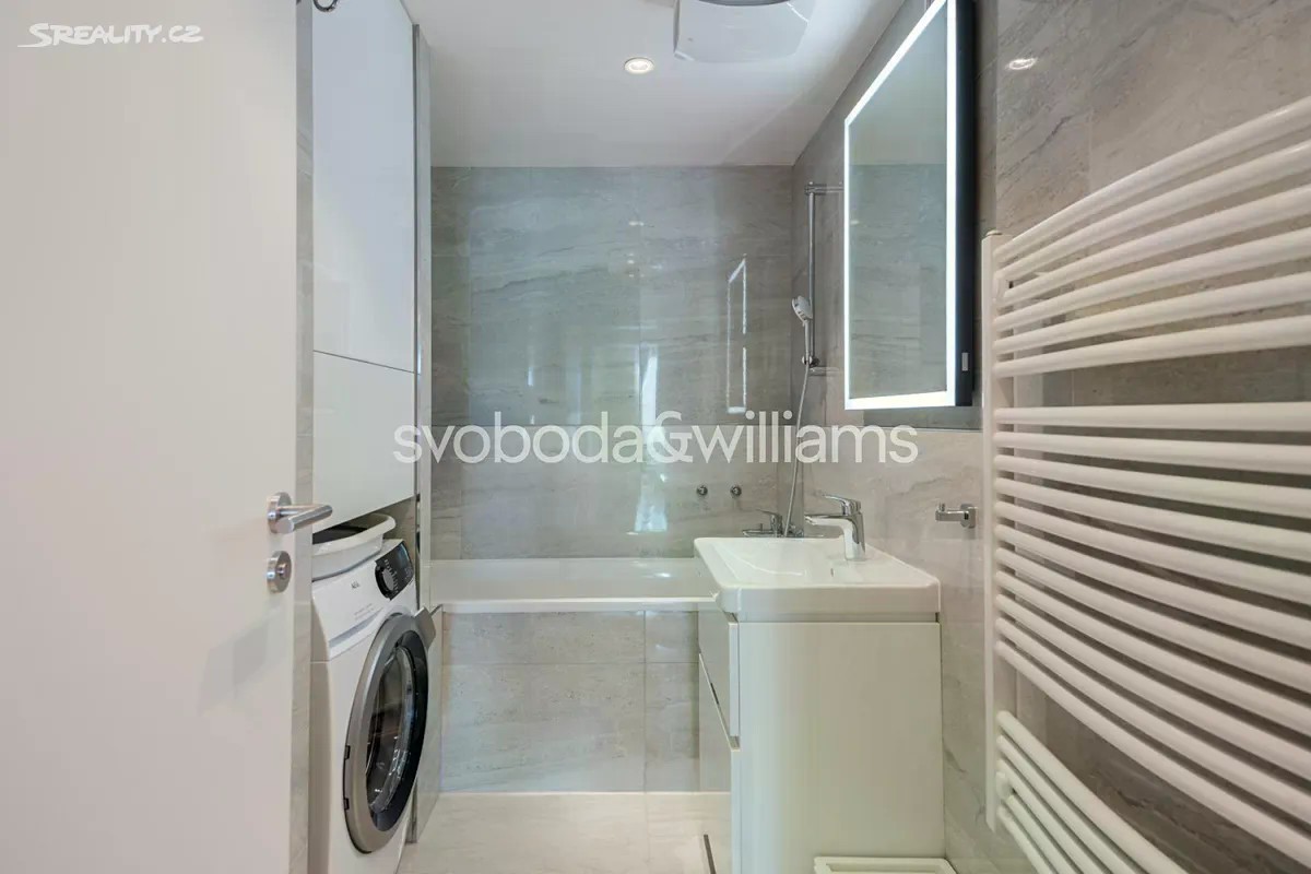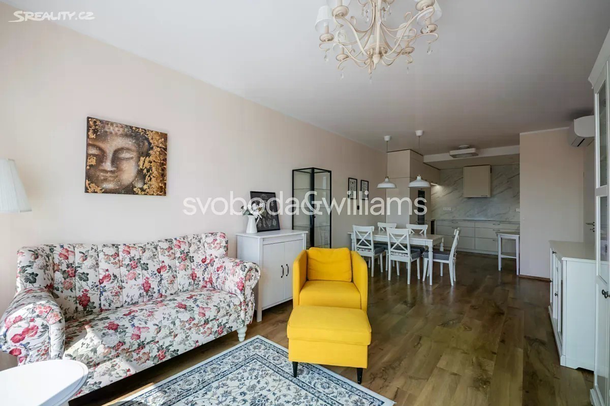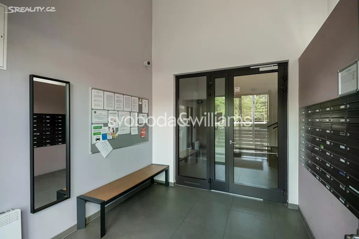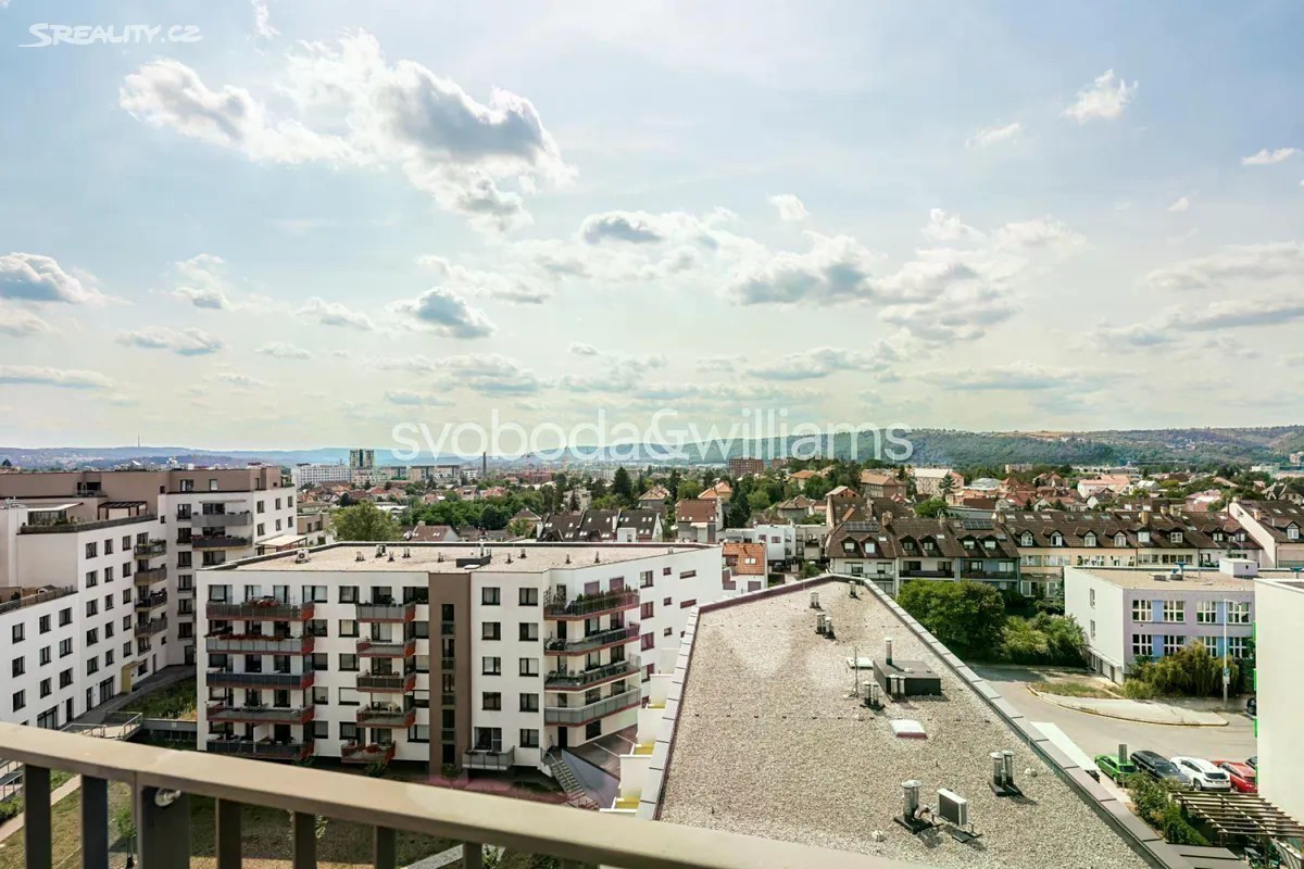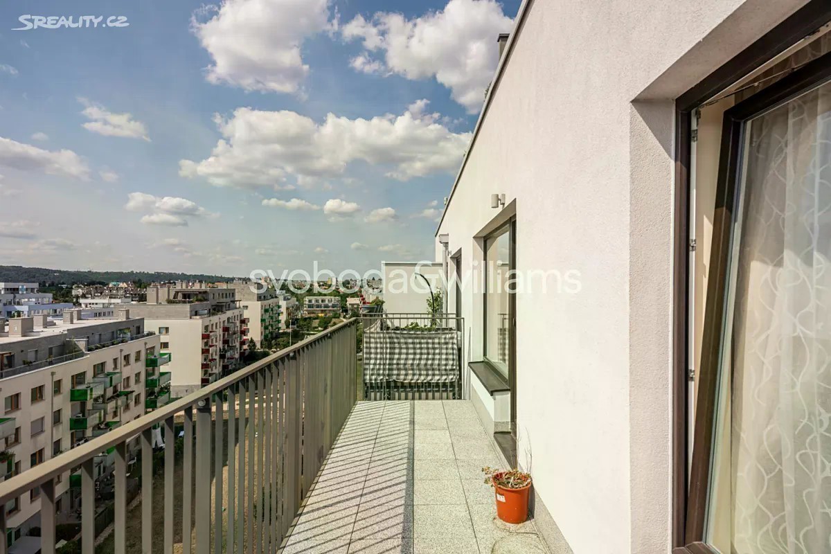 Kompletně zařízený klimatizovaný byt s terasou a výhledem do dalekého okolí je situovaný v 8. patře moderní budovy s výtahem a podzemním parkováním. Dům se nachází v klidné části Prahy 4 v Modřanech, v blízkosti prestižní British Prague School a vyhledávaného lesa Modřanská rokle. Interiér tvoří obývací pokoj s plně vybavenou kuchyní a přístupem na terasu, 2 ložnice, koupelna s vanou, samostatná toaleta, úložná komora a vstupní chodba s vestavěnými skříněmi. Cena zahrnuje 2 garážová stání v podzemní garáži a sklep. Podlahy jsou vinylové v kombinaci s dlažbou v koupelně, nechybí kuchyňská linka vybavená spotřebiči a klimatizace. Cena zahrnuje veškeré zařízení a nábytek. Vytápění je centrální. Modřany představují klidnou a zelenou městskou část vhodnou pro párové i rodinné bydlení. Okolí nabízí rozmanité možnosti kulturního, společenského i sportovního vyžití, cyklistické stezky, tratě pro in-line bruslení, Aeroklub Točná a golfová hřiště. Přímo v místě a na sousedním Sofijském náměstí je v provozu několik kaváren, restaurací, obchodní centrum i poliklinika. Rychlá a snadná je také doprava do centra Prahy autem i MHD včetně vlakového spoje z nedaleké zastávky Praha-Modřany. Celková plocha 93,2 m2, balkon 10,8 m2.