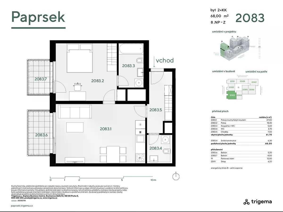 Západně orientovaný prostorný byt 2+kk o celkové rozloze 68 m2 s balkonem o velikosti 4 m2 a druhým balkonem o velikosti 5,2 m2. Byt je umístěn v osmém nadzemním podlaží bytového domu. Zaujme pohodlím a vzdušností, stejně jako dechberoucími výhledy. Byt je ideální volbou pro singles či mingles, jako startovací bydlení nebo jako investiční byt k následnému pronájmu. V prostorné chodbě naleznete velkorysé úložné prostory. Srdcem bytu je obývací pokoj s liniovým kuchyňským koutem. Koupelna je vybavena toaletou, vanou a je v ní místo pro připojení pračky. Samostatné wc s umývátkem je umístěno ve vstupní hale. BENEFIT: Příznivá cena, balkon, dechberoucí výhled. TIP: Ideální volba pro singles či mingles, jako startovací bydlení nebo jako investiční byt k následnému pronájmu. Fotografie interiéru jsou pouze referenční. Pro prohlídku nemovitosti kontaktujte makléře společnosti. Nabídka dalších dokončených bytů na stránkách developerského projektu.